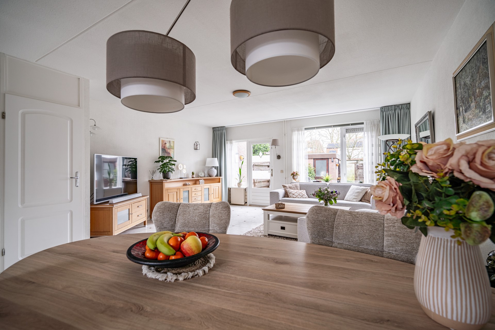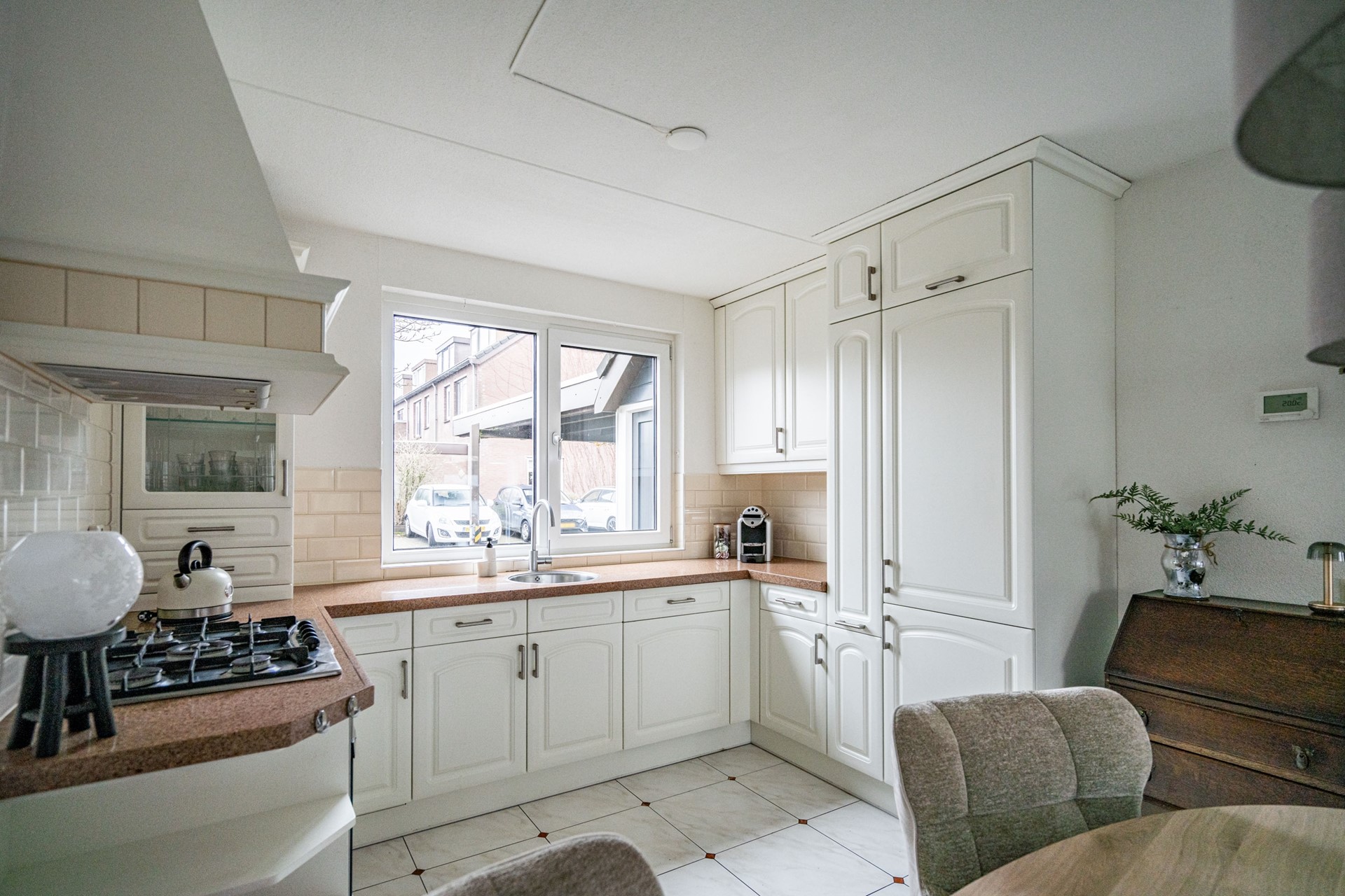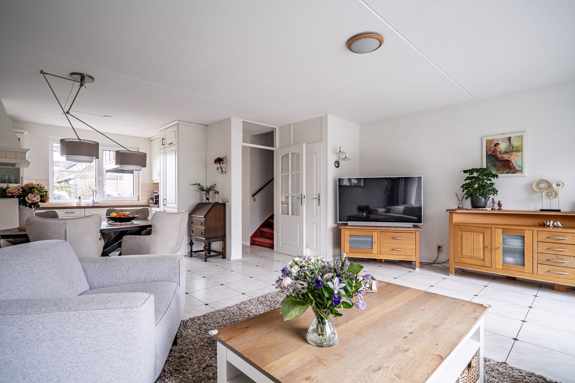 Bij binnenkomst ervaar je direct de prettige indeling en het ruime gevoel. De woning beschikt over een royale woon- en eetkamer met een open U-vormige keuken, compleet uitgerust met diverse inbouwapparatuur zoals een kookplaat, afzuigkap, oven, vaatwasser (2025) en een koelkast met vriezer (2025). Via de woonkamer heb je toegang tot de ruime achtertuin met stenen berging en een achterom.
