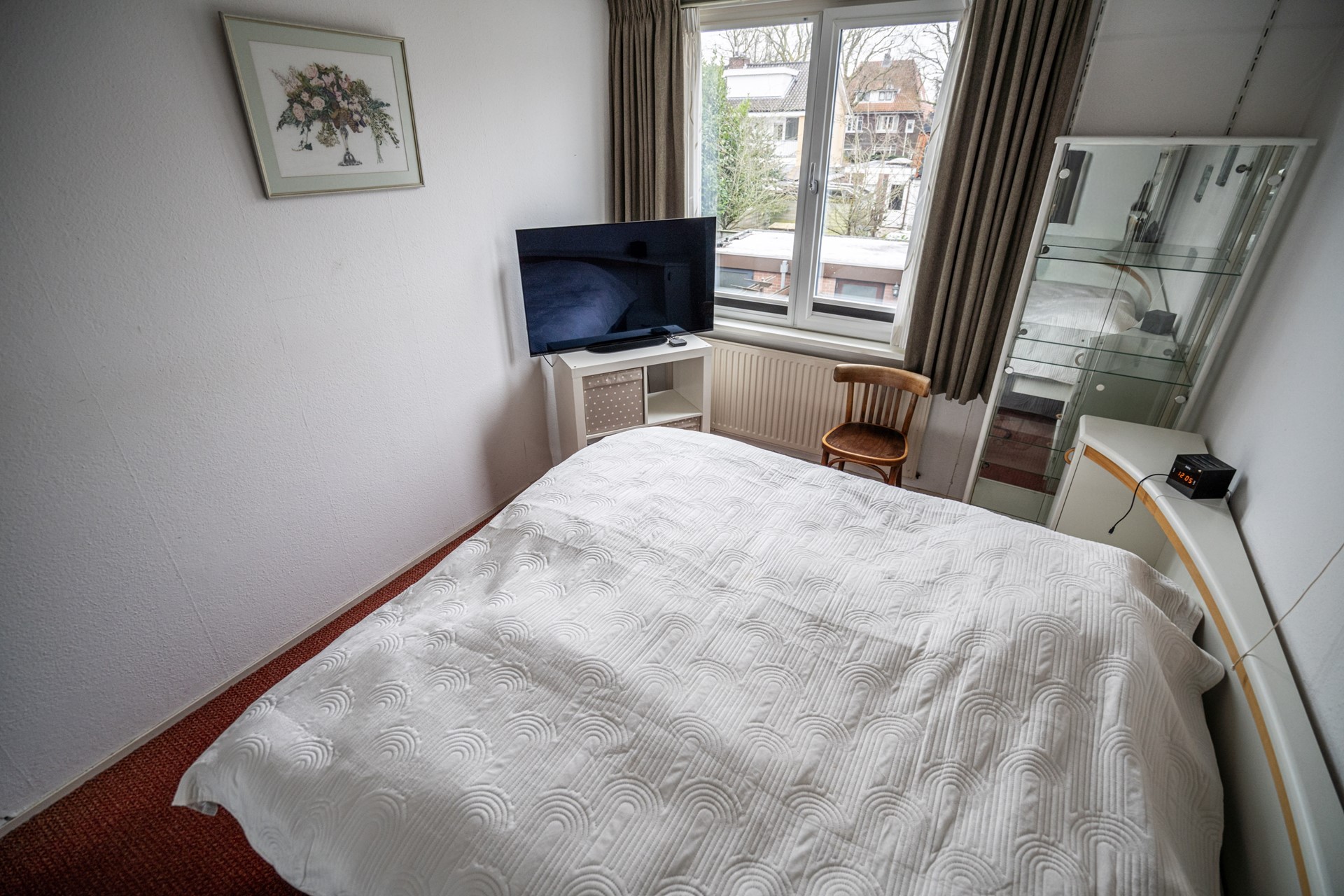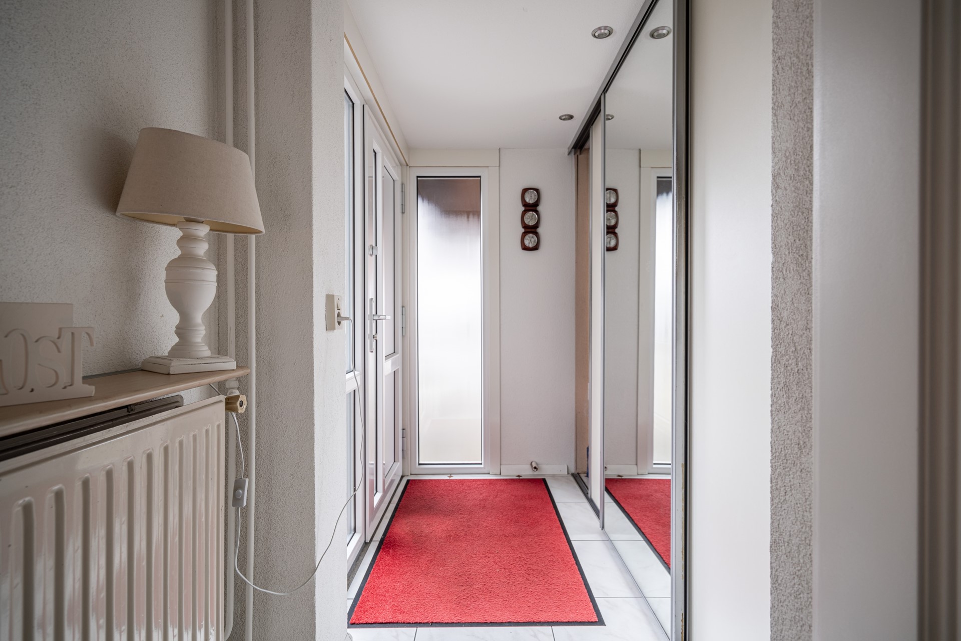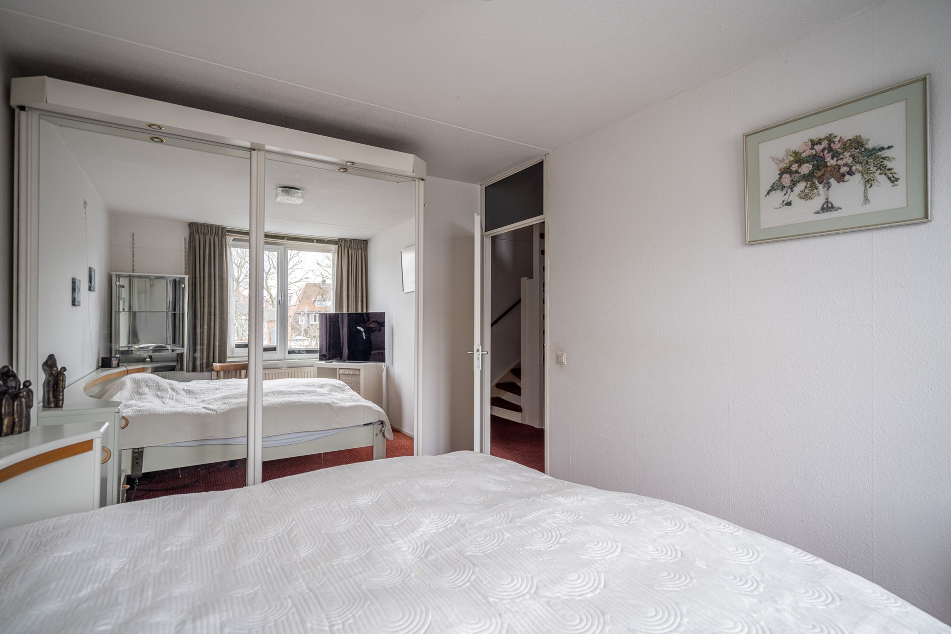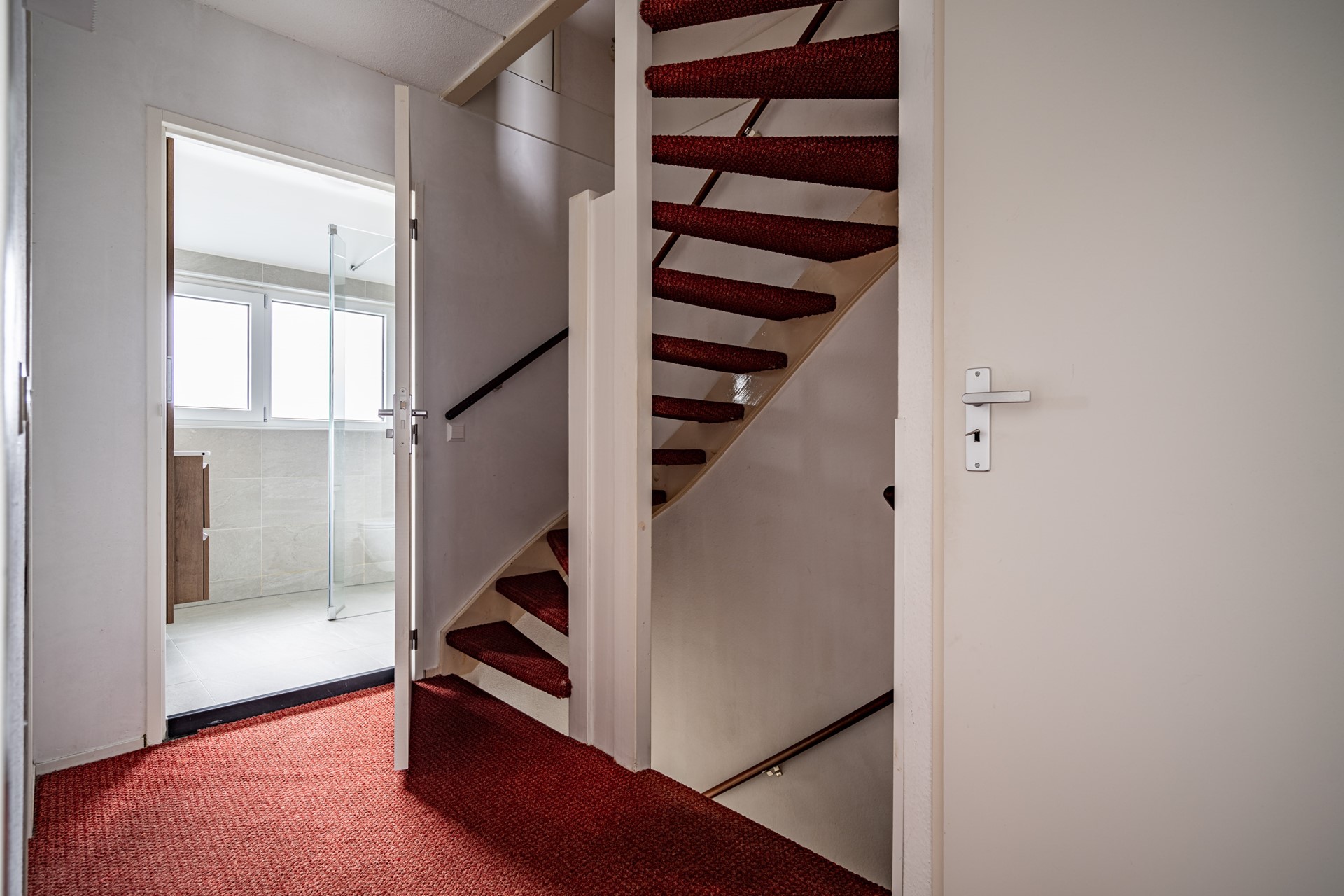 Overloop met vaste kast, twee ruime slaapkamers aan de voor- en achterzijde en een derde slaapkamer aan de achterzijde. De volledig betegelde badkamer aan de voorzijde beschikt over een inloopdouche, wastafelmeubel, handdoekradiator en een tweede toilet. Dankzij het grote raam is er veel natuurlijke lichtinval.