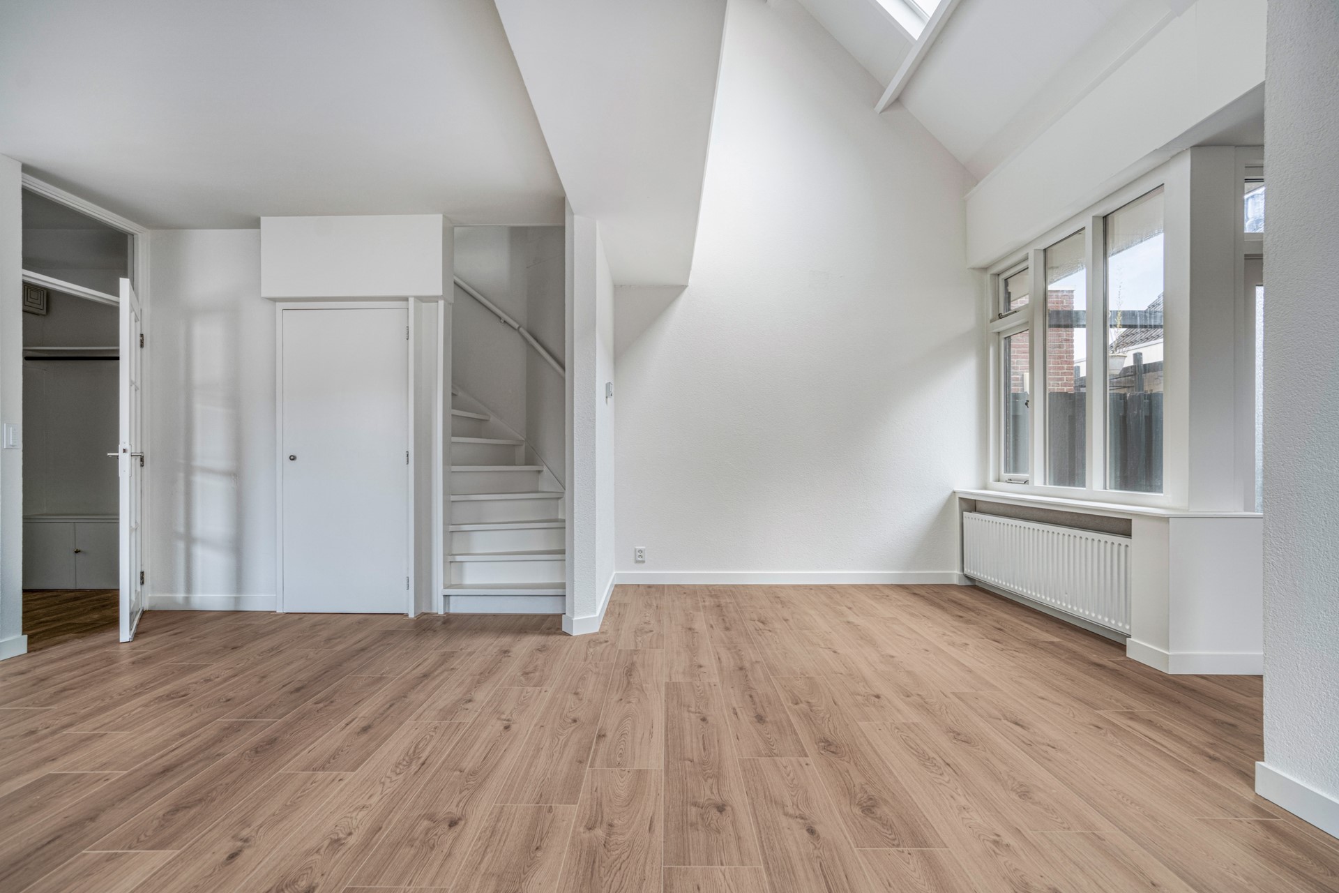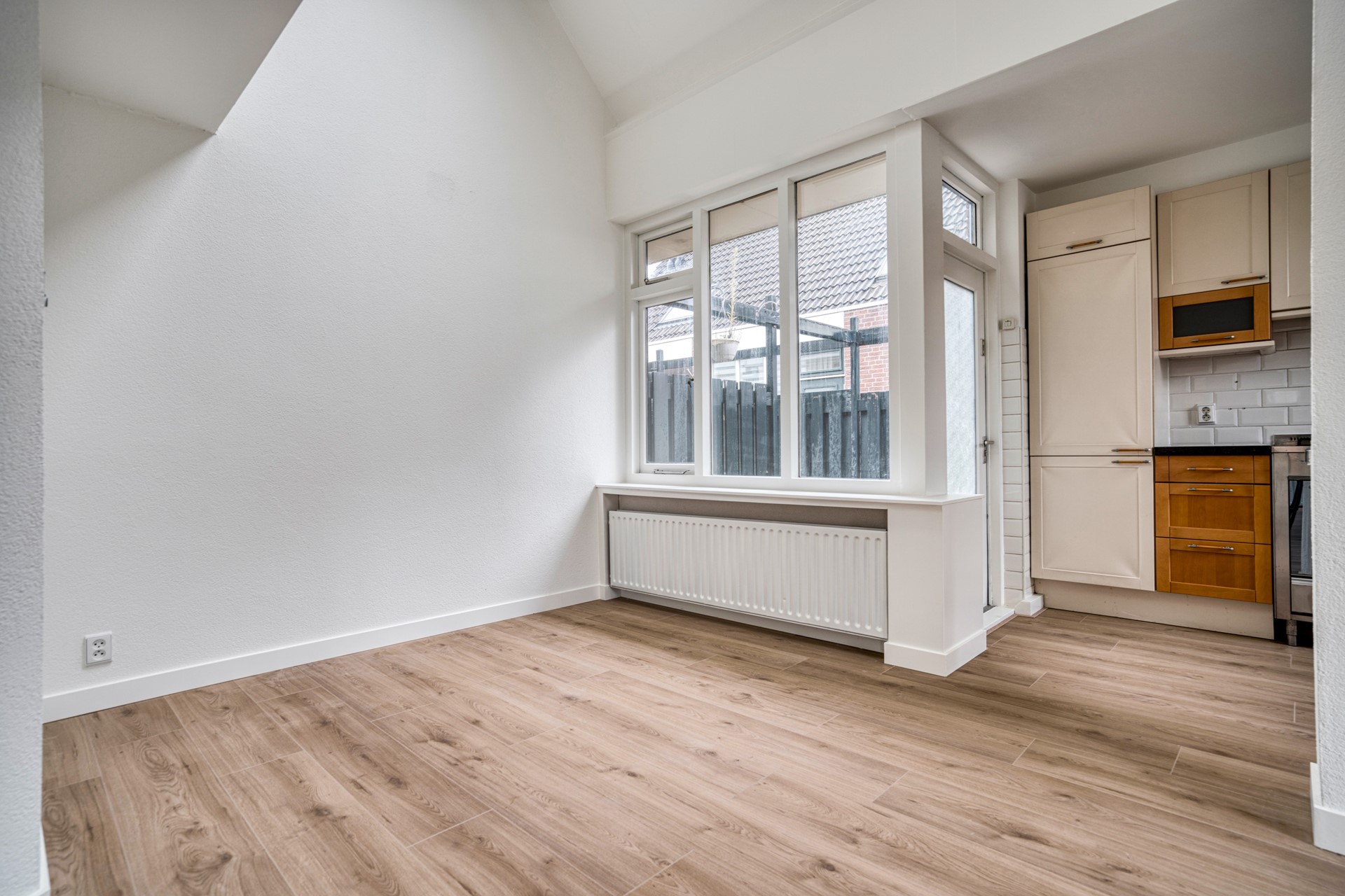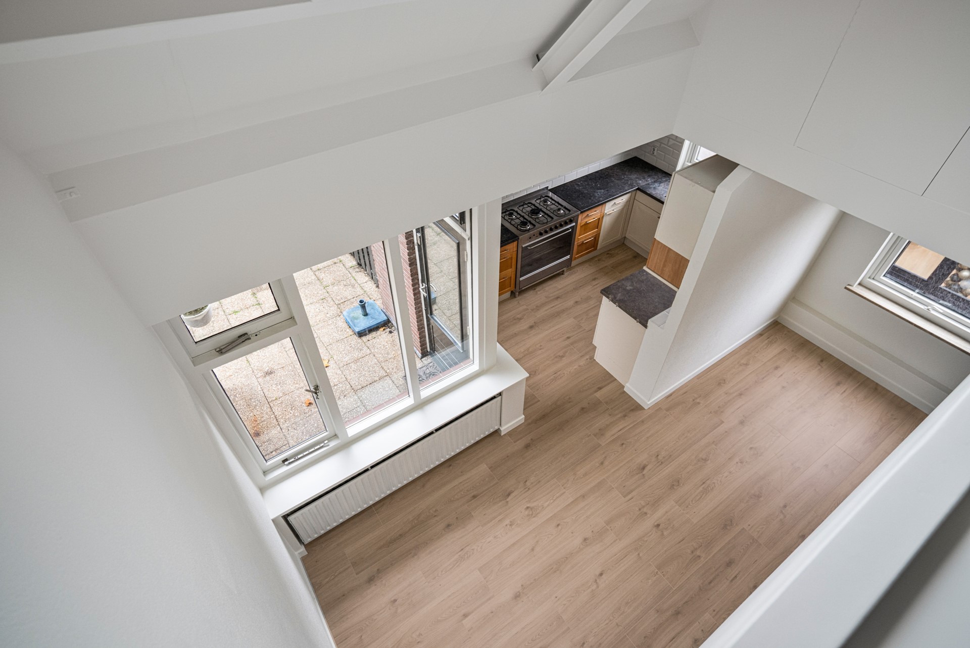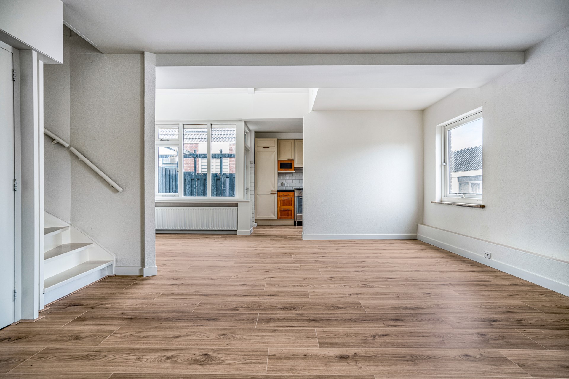 Woonkamer Een royale living met heerlijk veel lichtinval. Vanuit de woonkamer heeft u uitzicht op het voorgelegen pleintje. Vanuit de woonkamer is tevens het voorgelegen terras te bereiken. Aan de achterzijde bevindt zich eveneens een klein terras. Via dit terras is via een metalen trap de berging te bereiken.