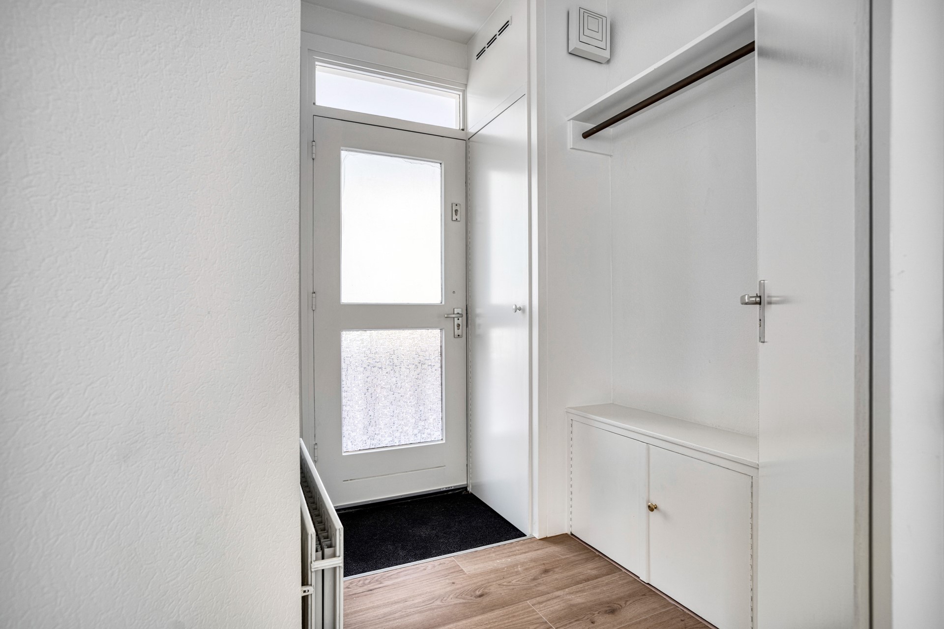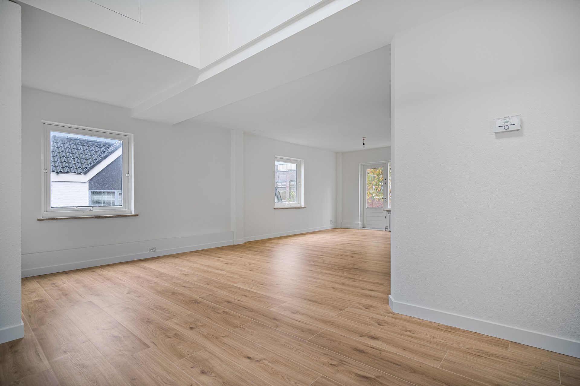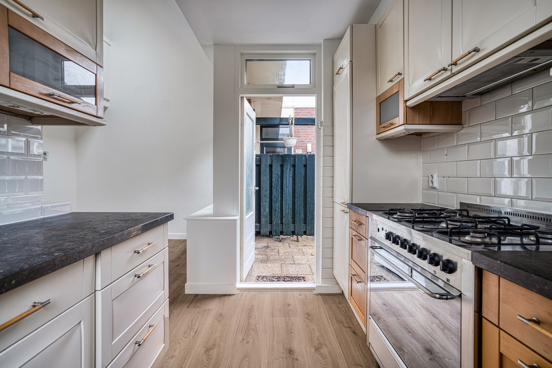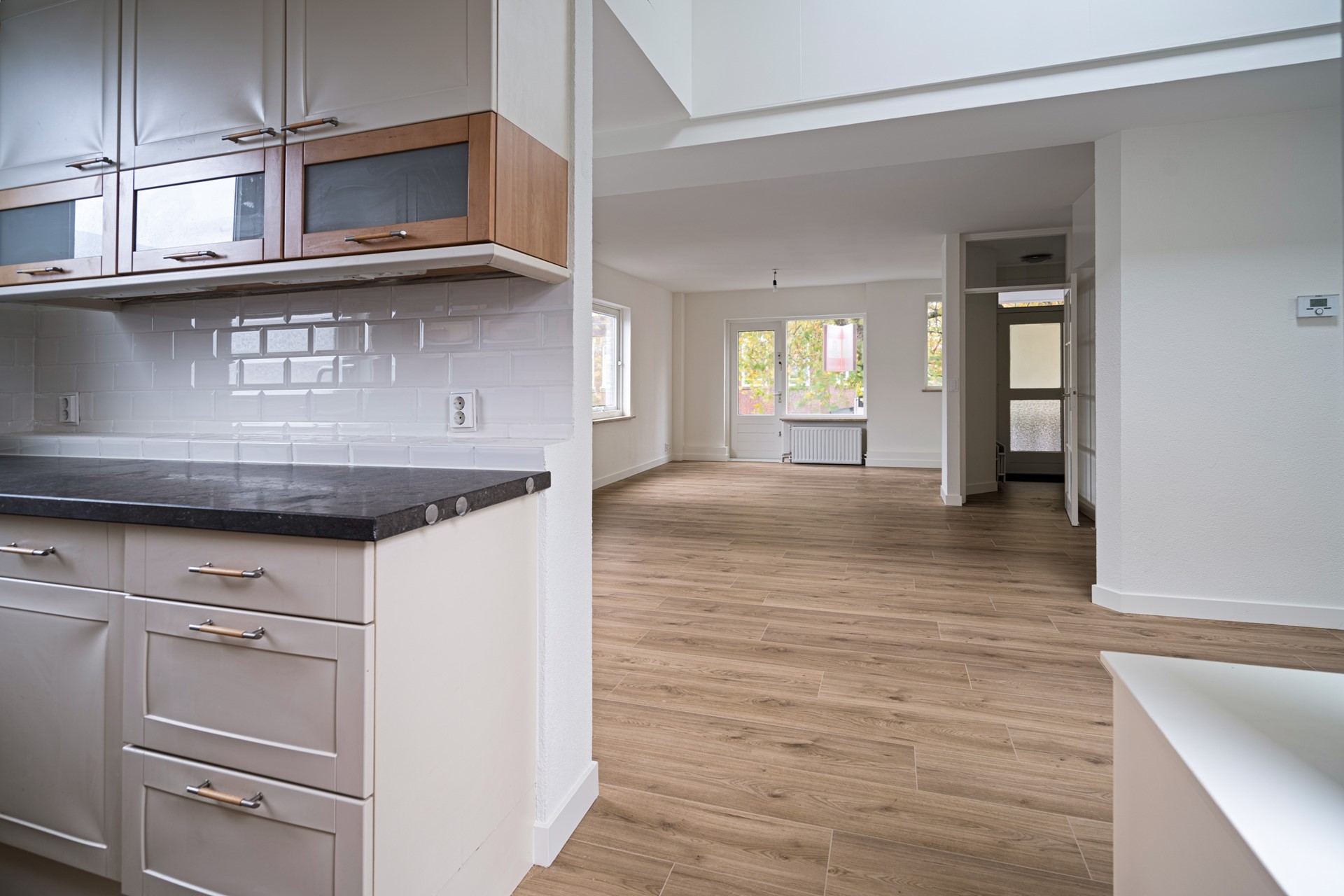 Woonkamer Een royale living met heerlijk veel lichtinval. Vanuit de woonkamer heeft u uitzicht op het voorgelegen pleintje. Vanuit de woonkamer is tevens het voorgelegen terras te bereiken. Aan de achterzijde bevindt zich eveneens een klein terras. Via dit terras is via een metalen trap de berging te bereiken.