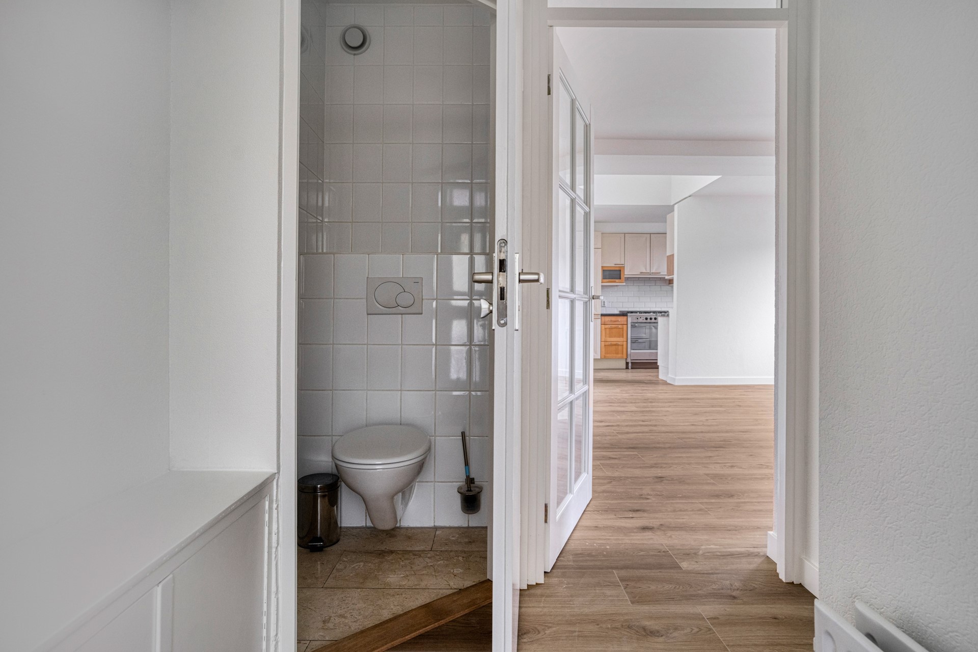 Indeling Entree middels een hek aan de voorzijde (of via de achterkant langs de bergingen) Trap naar eerste verdieping, entree appartement, hal met garderobe en meterkast (5 groepen met aardlekschakelaar) Volledig betegelde toiletruimte met fonteintje Over de gehele eerste verdieping ligt een fraaie nieuwe laminaatvloer.