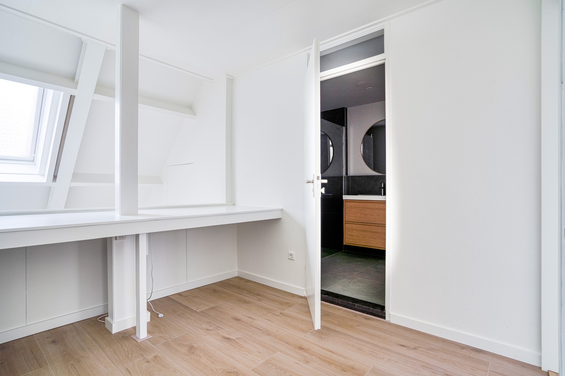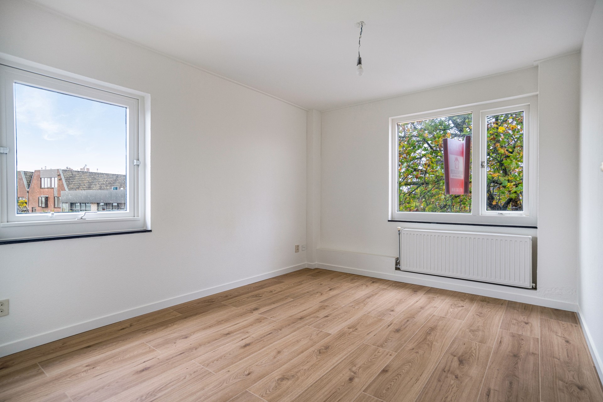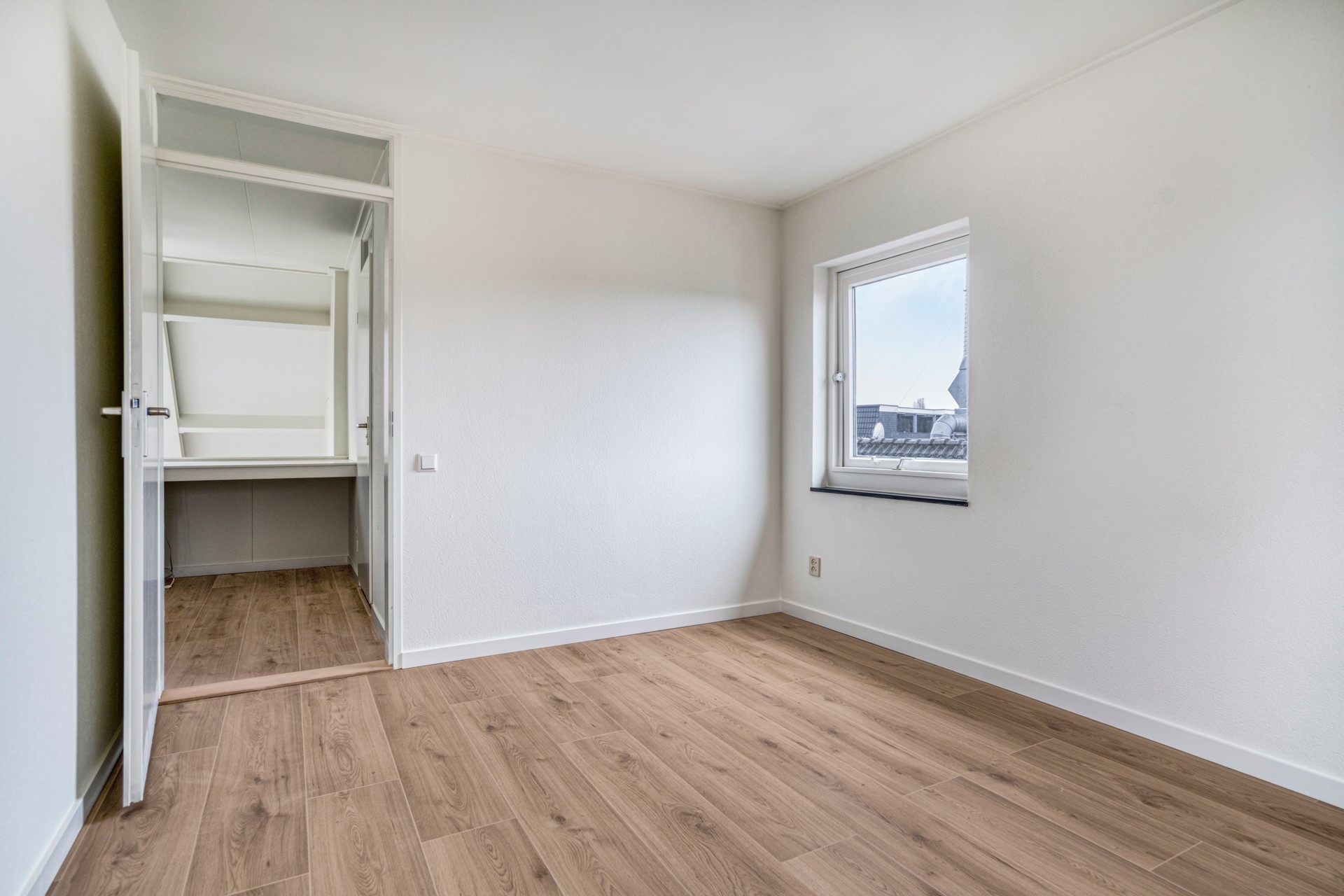 Hier loop je via een royale overloop naar de 2 ruime slaapkamers welke aan de voorzijde liggen. Een van de slaapkamers heeft toegang tot het balkon. Ook in deze kamers ligt een nieuwe laminaatvloer.