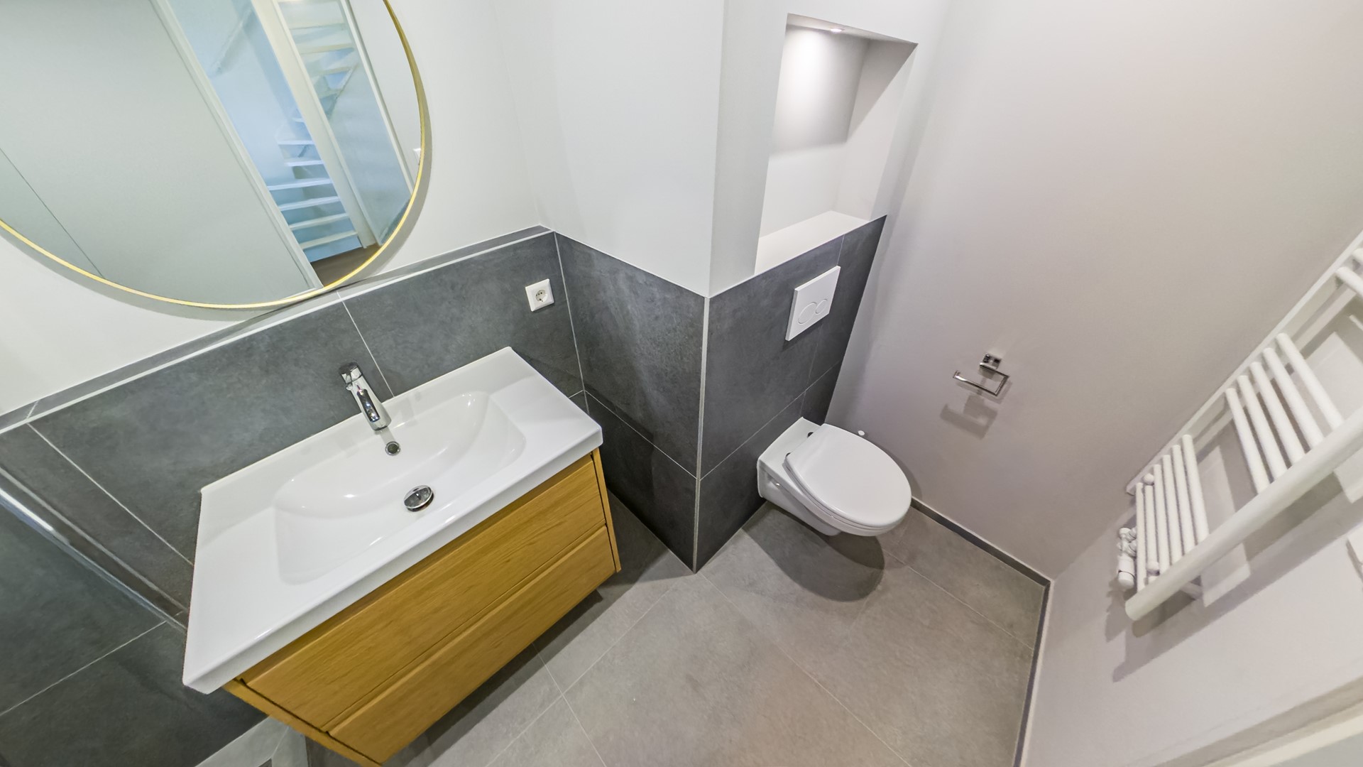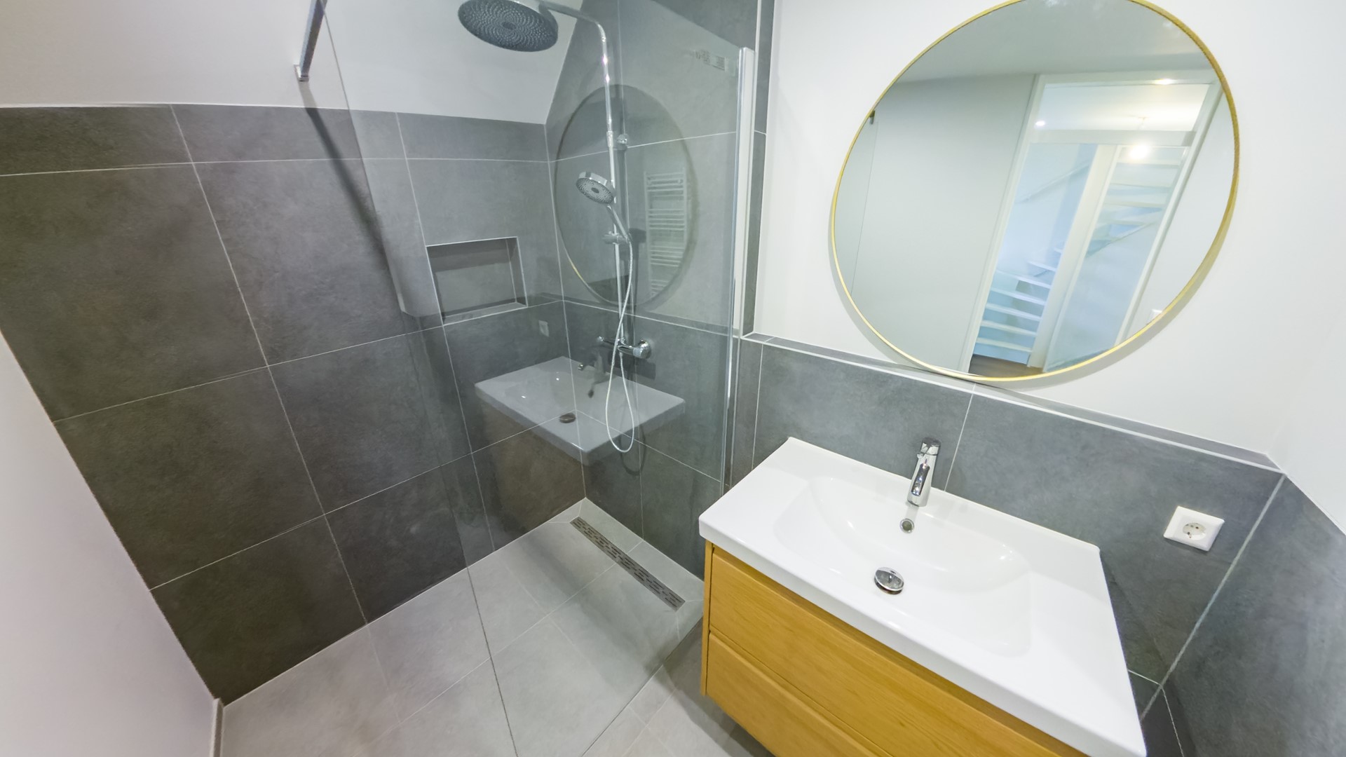 Badkamer Een splinternieuwe betegelde badkamer voorzien van een inloopdouche, een wastafelmeubel, designradiator en een zwevend toilet.
