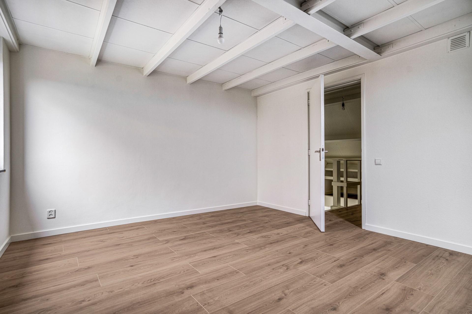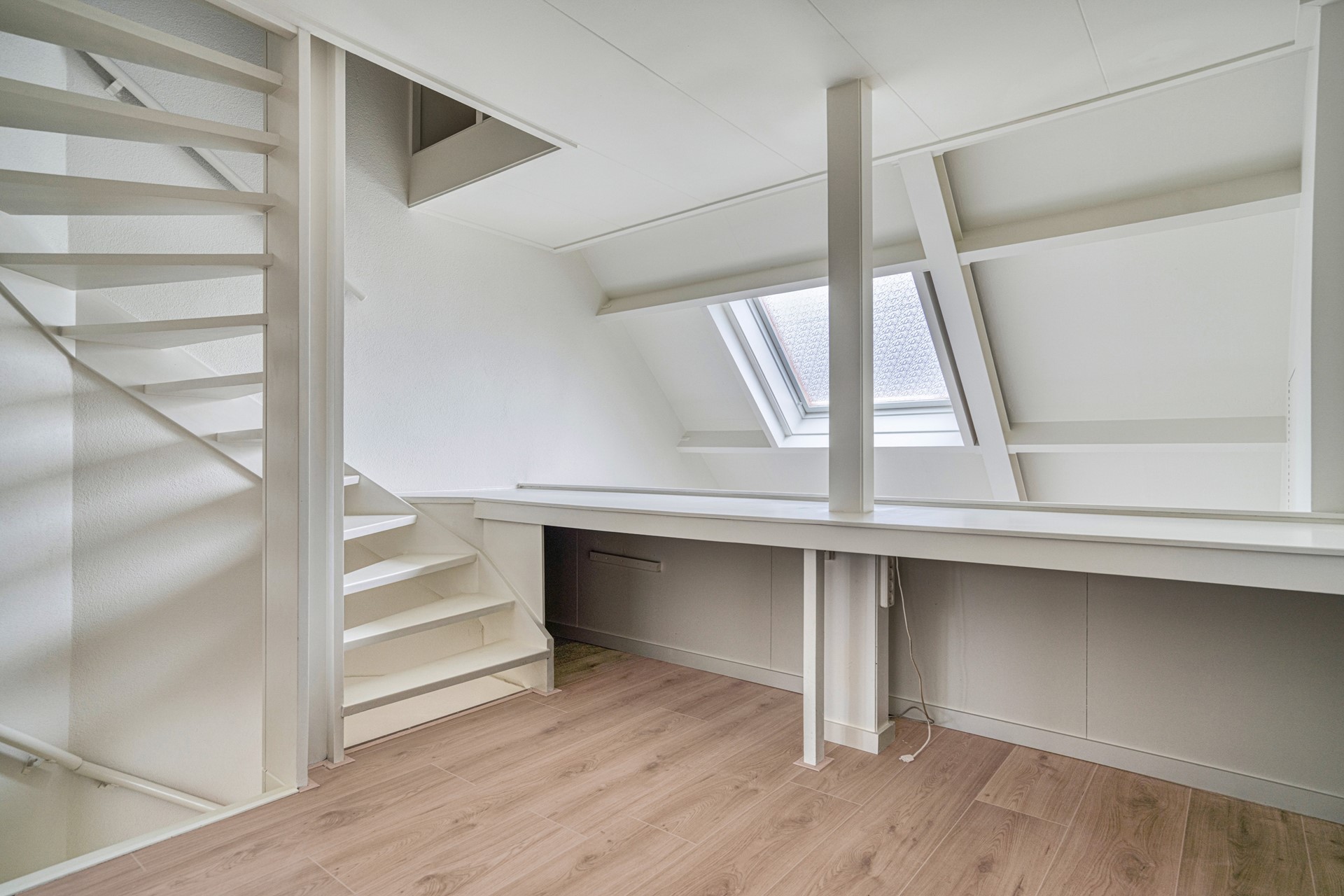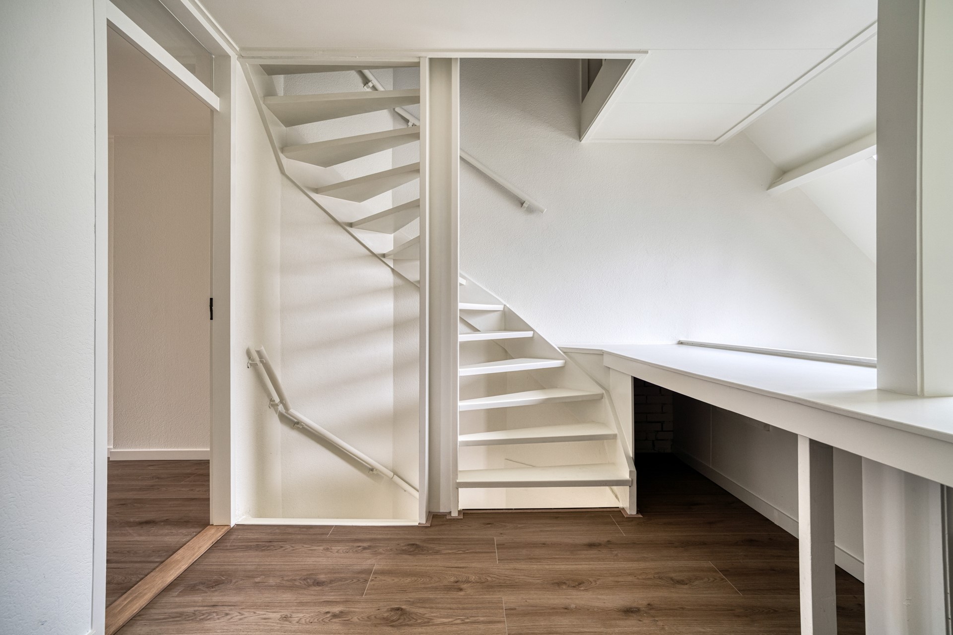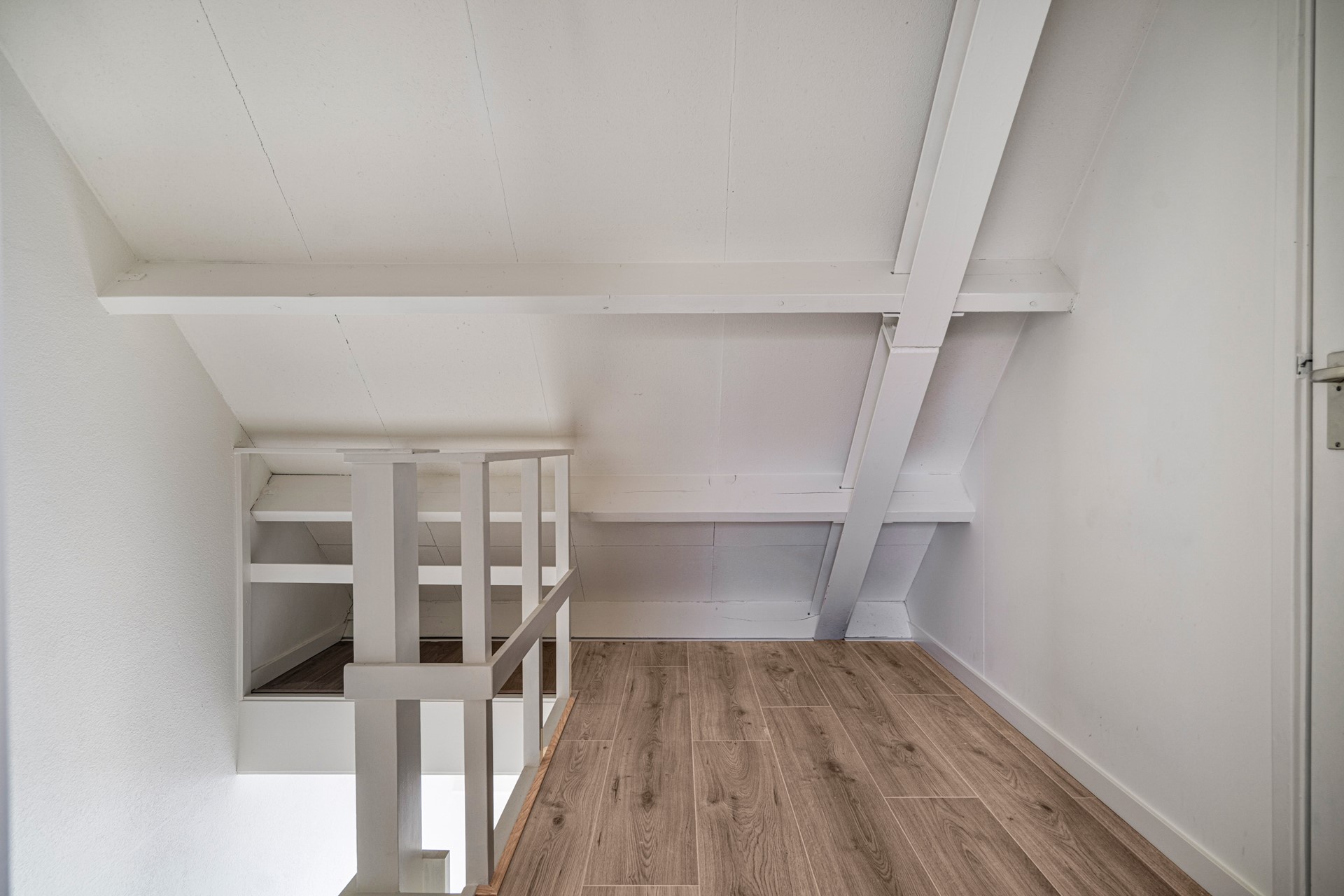 Trapopgang naar eerste etage. Vide met ruime overloop en toegang tot de voorgelegen slaapkamers. Ook hier ligt een fonkelnieuwe laminaatvloer.