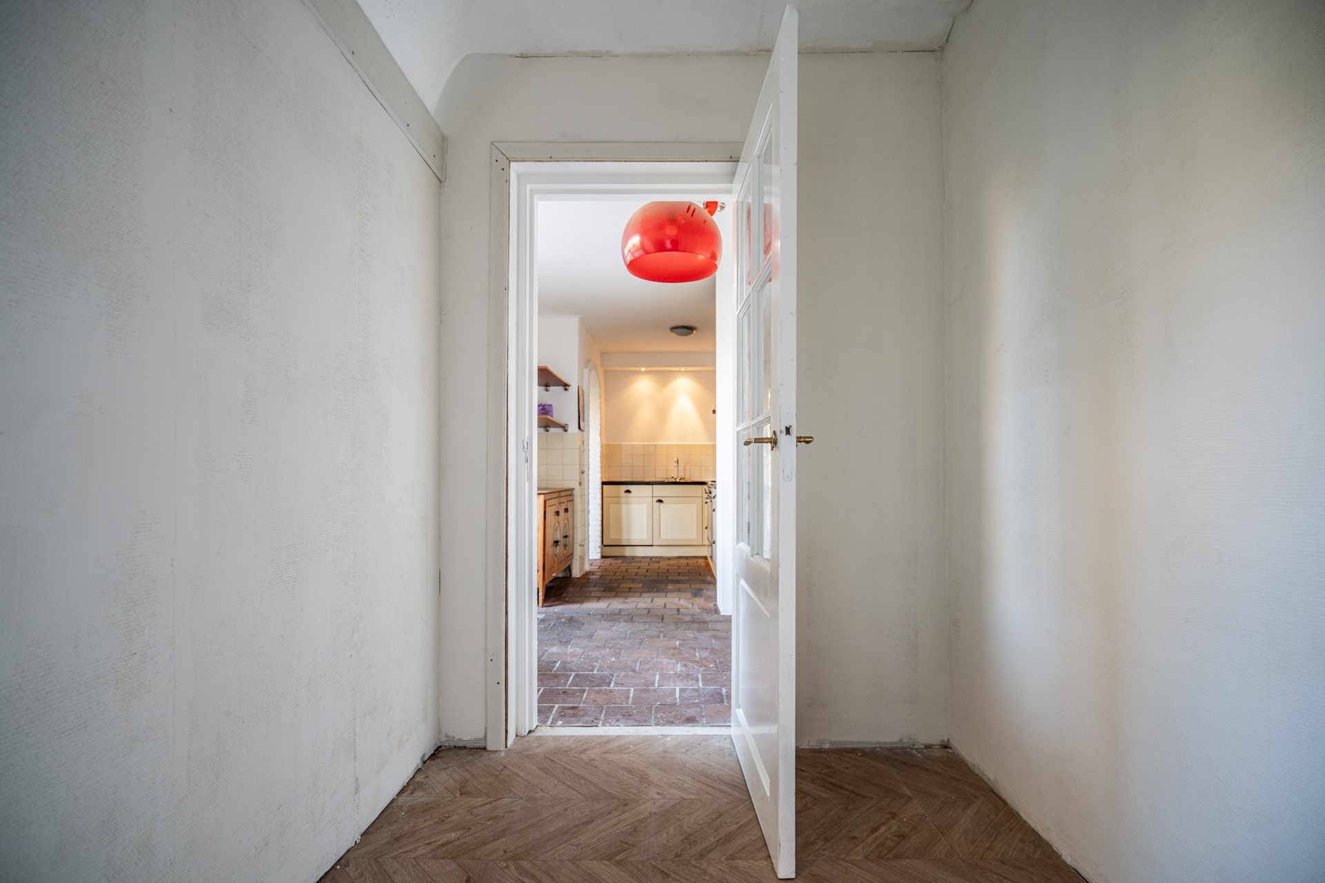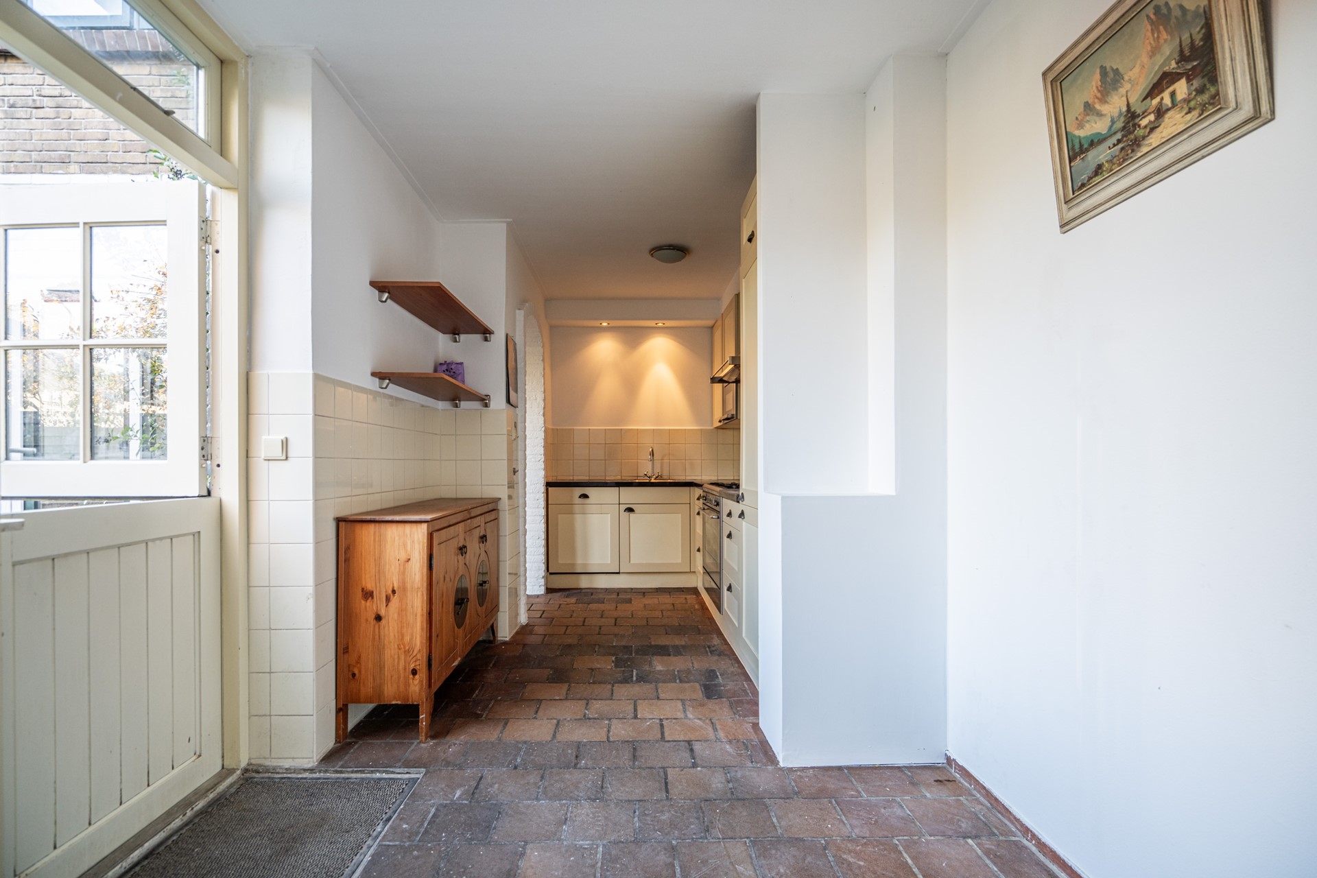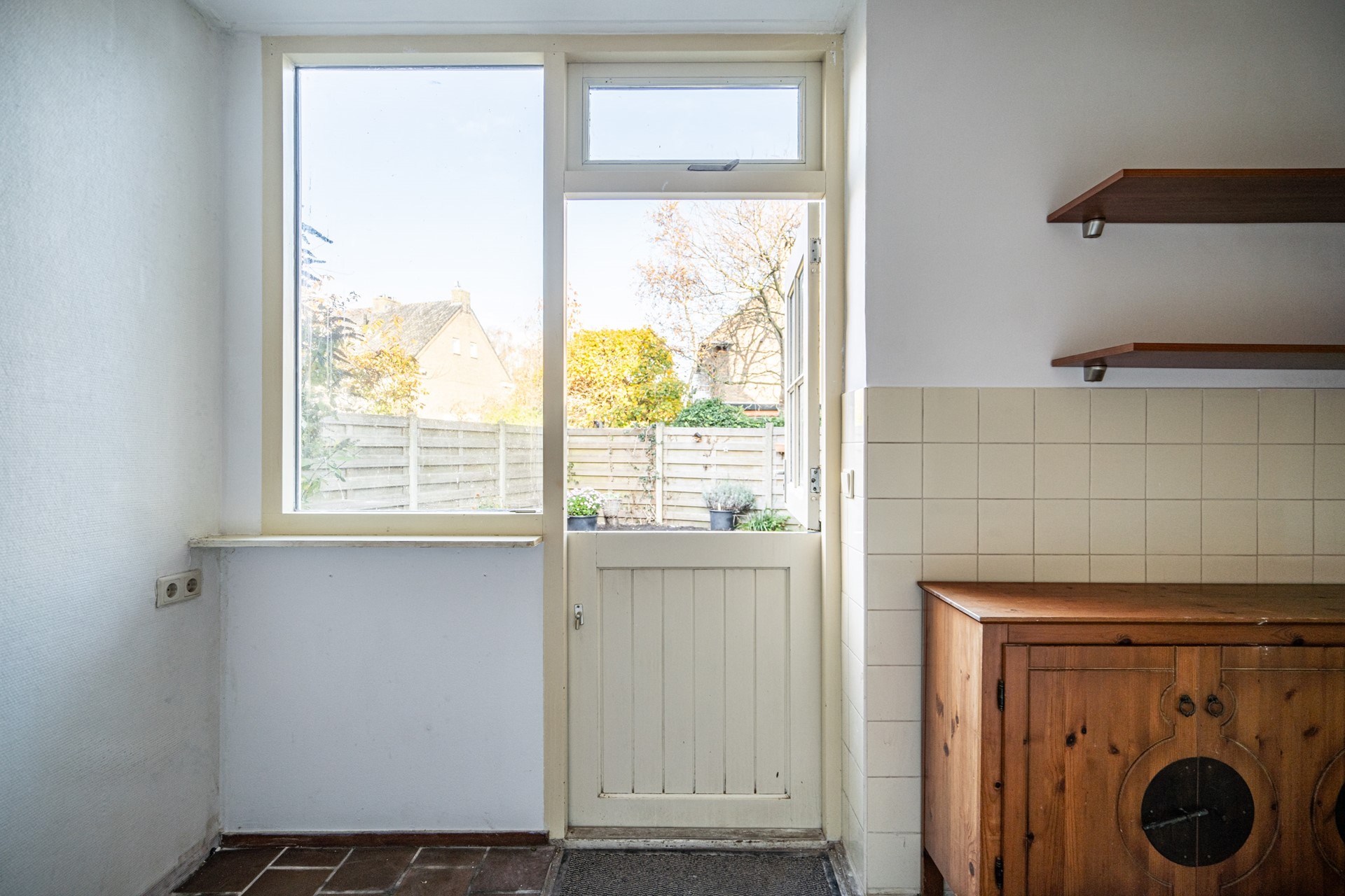 De keuken aan de achterzijde is praktisch ingedeeld en voorzien van een charmante boerendeur naar de tuin. Aansluitend bevindt zich de bijkeuken, die recent is opgeknapt en geïsoleerd met glaswol. Deze ruimte biedt volop mogelijkheden als wasruimte, opslag of werkplek.
