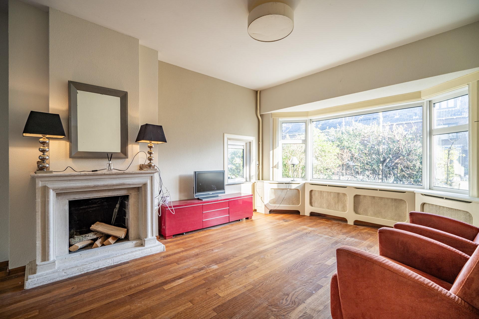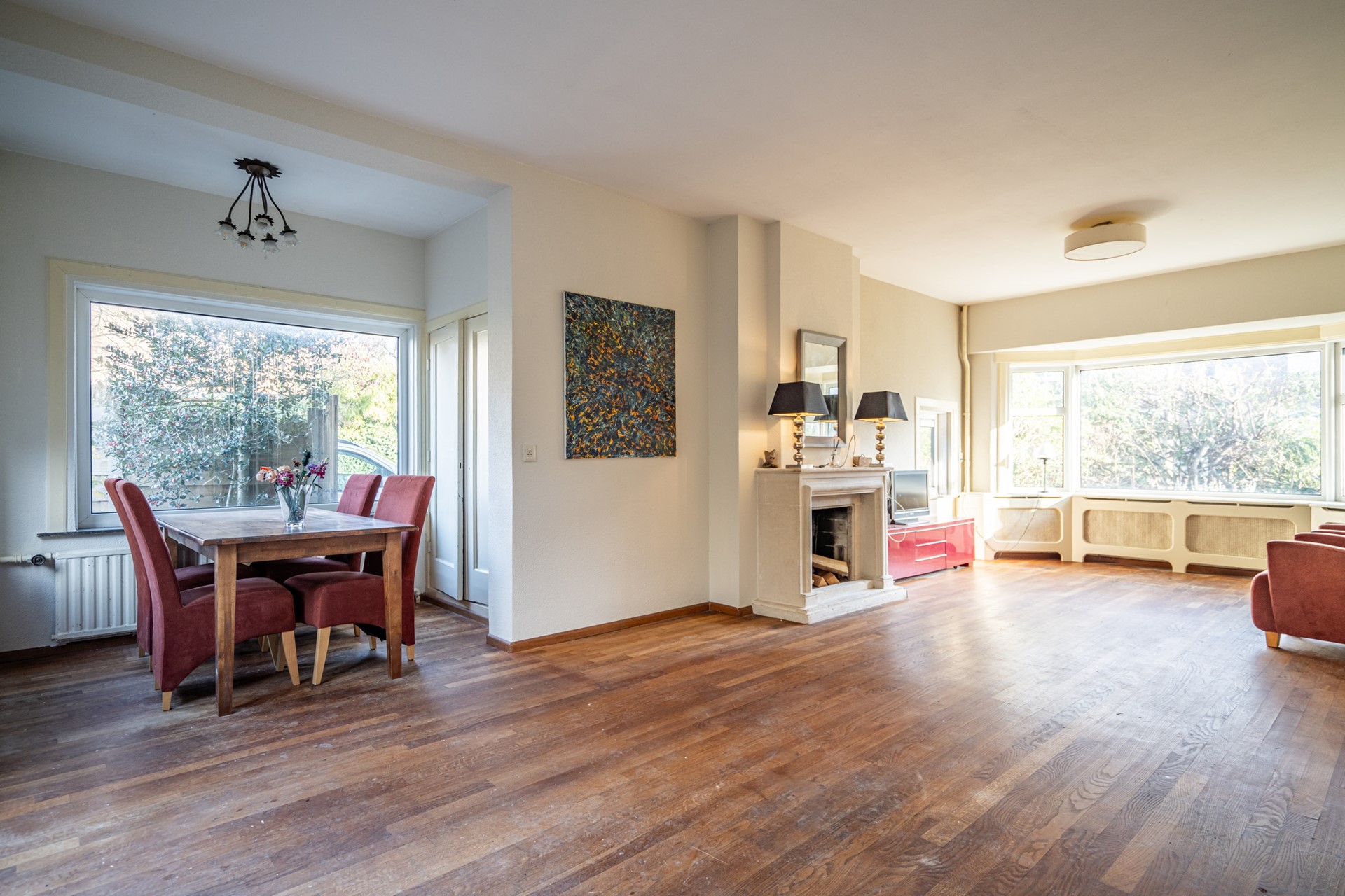 - Lichte woonkamer met veel raampartijen en open haard