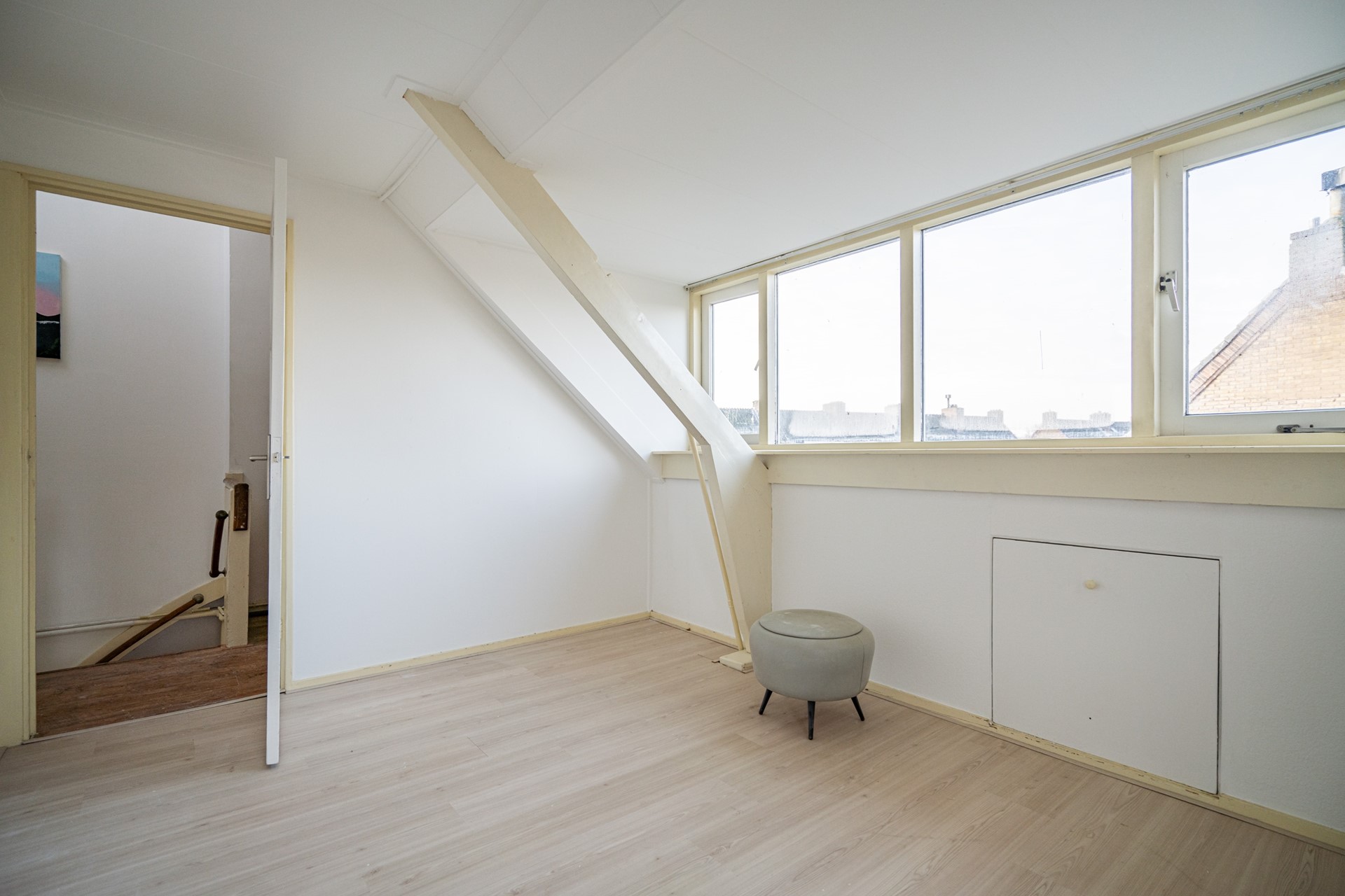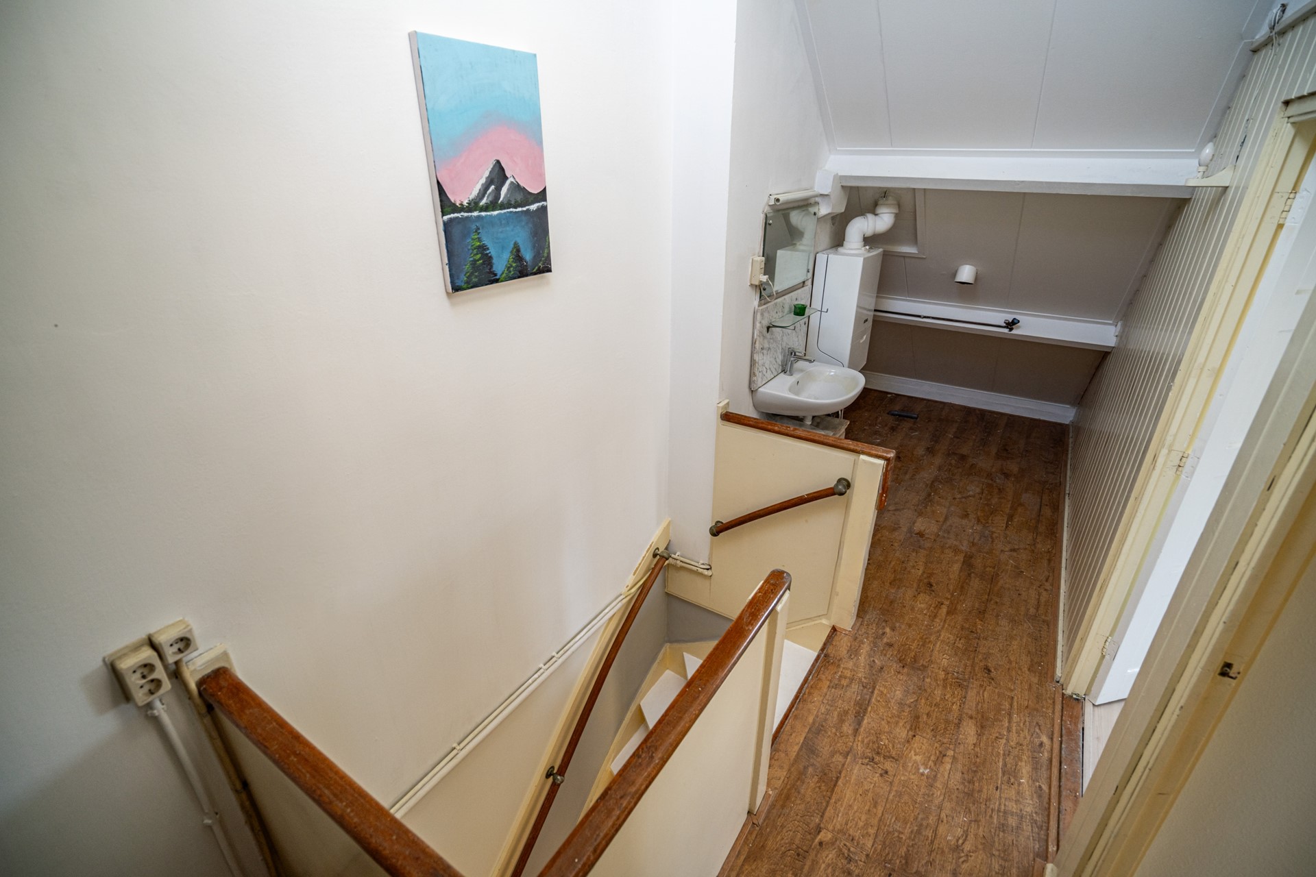 Via de vaste trap bereik je de tweede verdieping met overloop, voorzien van Velux-dakraam, cv-ketel, wasmachine- en drogeraansluiting. Flinke opbergruimte. Hier zijn nog twee slaapkamers te vinden, plus extra bergruimte achter de knieschotten. Een vliering biedt extra opslagmogelijkheden.