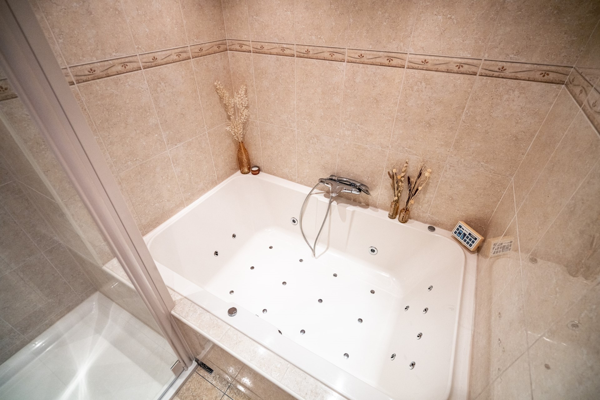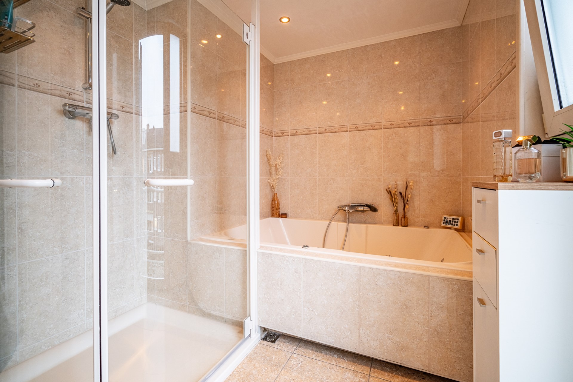 Op deze verdieping bevindt zich tevens een ruime slaapkamer, ideaal als logeerkamer, werkkamer of kinderkamer. De badkamer is royaal opgezet en voorzien van een whirlpool, aparte douchecabine, wastafel en toegang tot het zonnige balkon, een heerlijke plek om even te ontspannen.