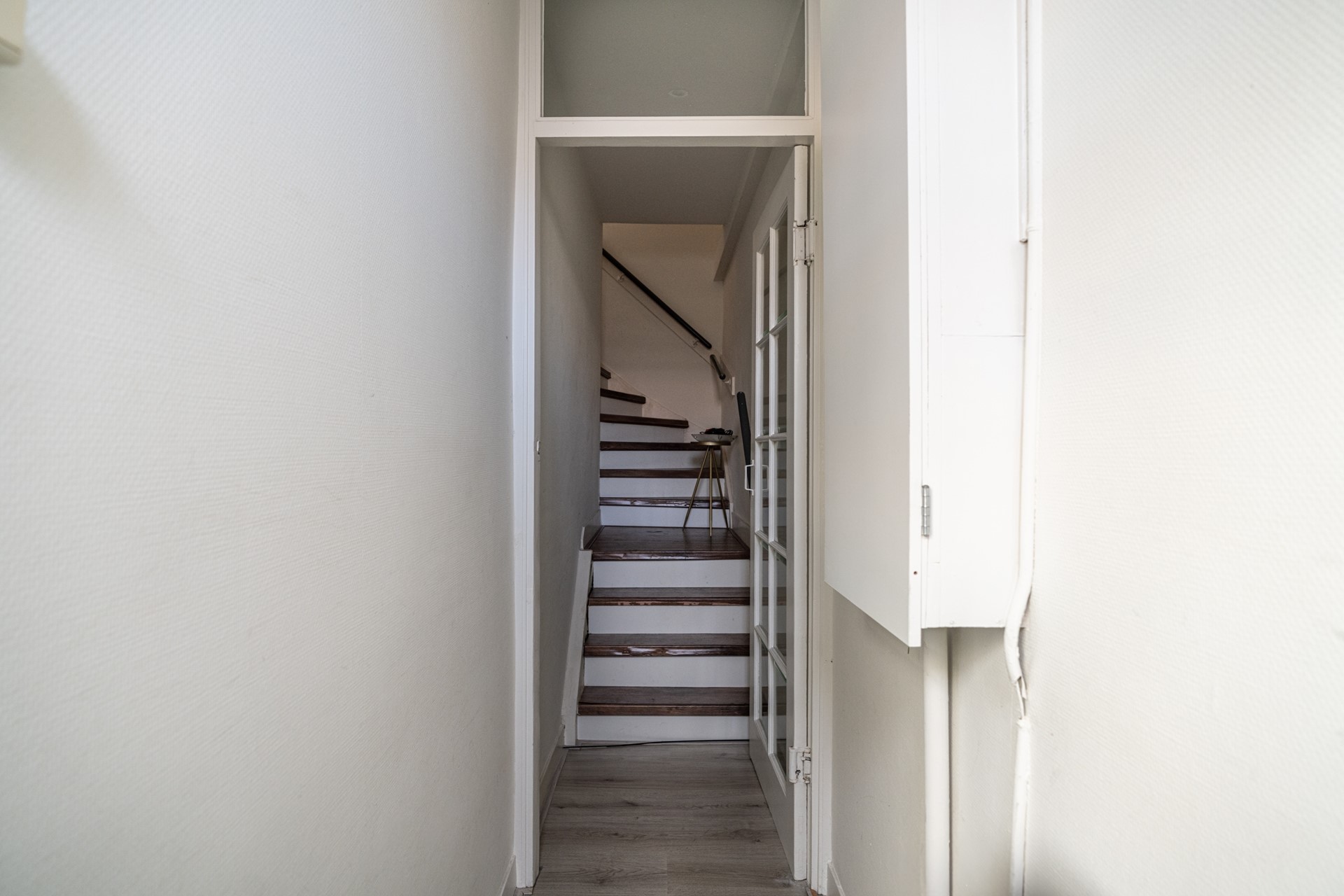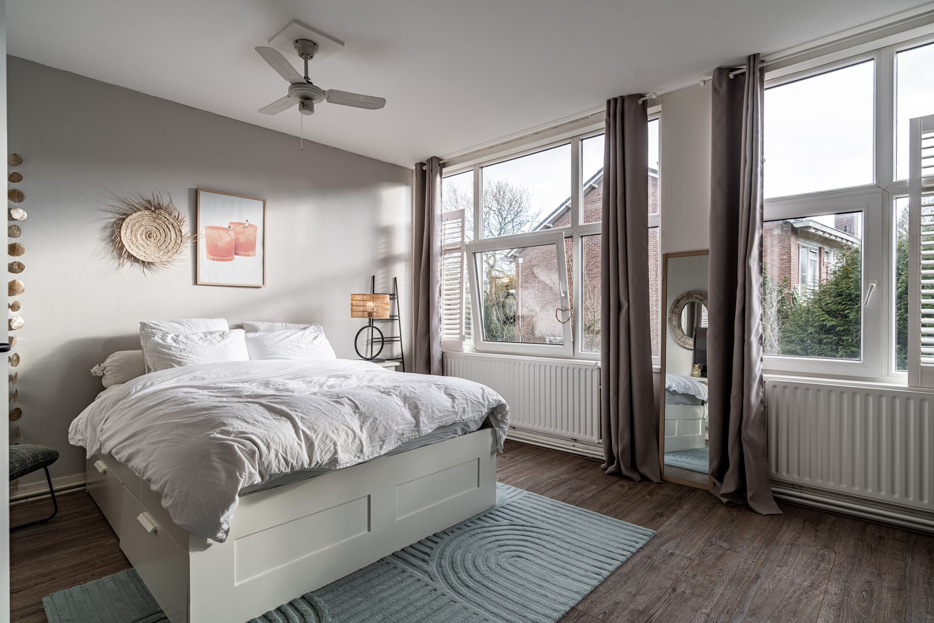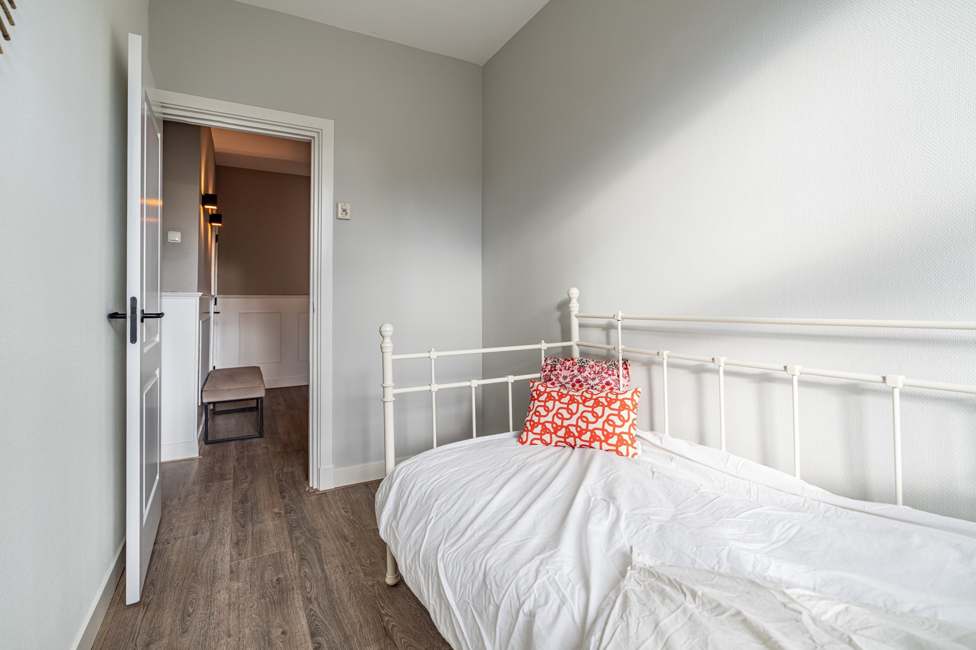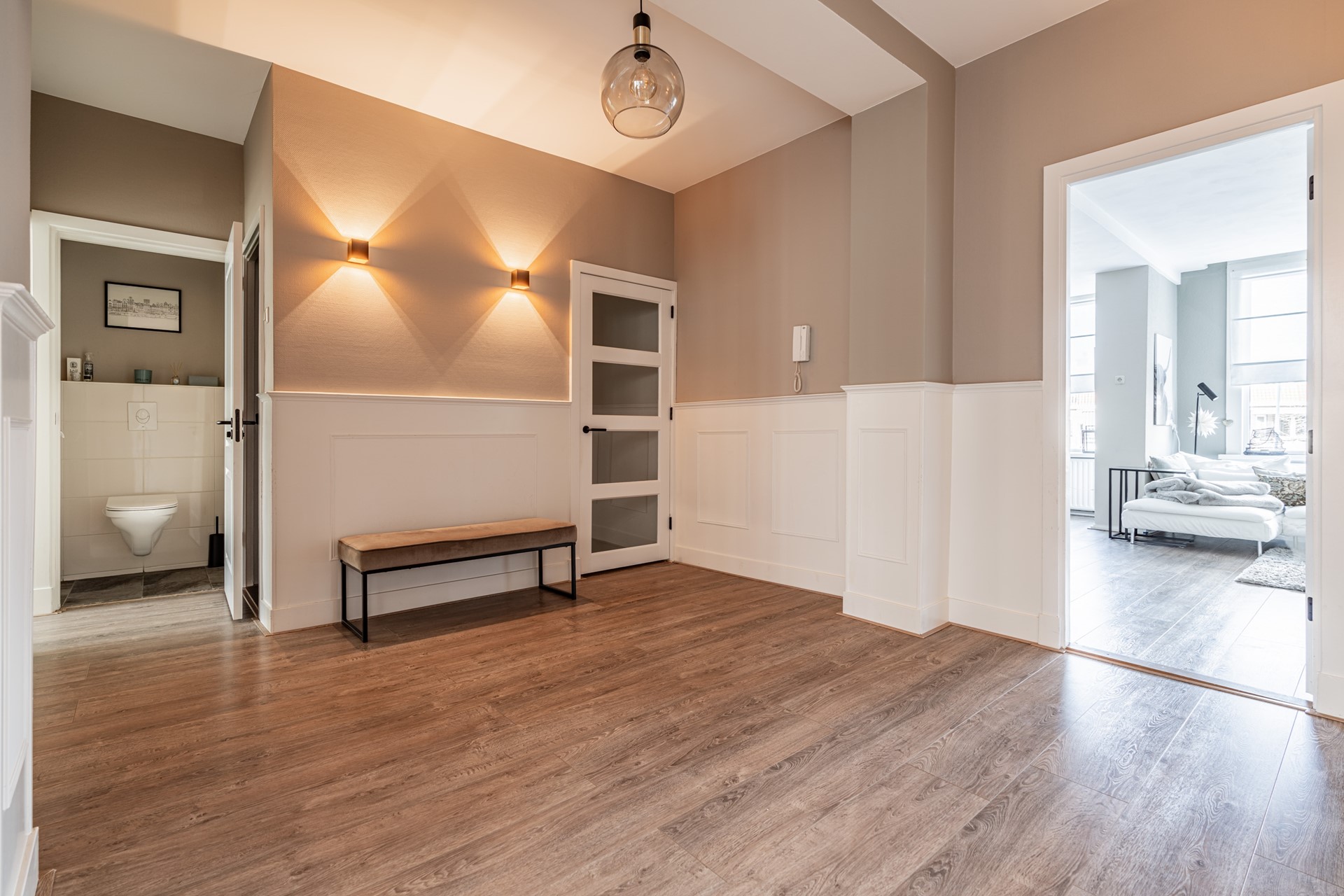 Via de trap op de begane grond bereik je de entree van de woning, waar je binnenkomt in een ruime hal die toegang biedt tot alle vertrekken. De lichte woonkamer heeft een prettige sfeer en biedt voldoende ruimte voor zowel een zithoek als een eethoek. Dankzij de grote ramen profiteert de woning van veel natuurlijk licht. Voorheen had de woning drie slaapkamers, maar een van de kamers is bij de hoofdslaapkamer betrokken, waardoor een zeer ruimere slaapkamer is ontstaan. De overige slaapkamer biedt voldoende mogelijkheden voor een slaapkamer of werkkamer.