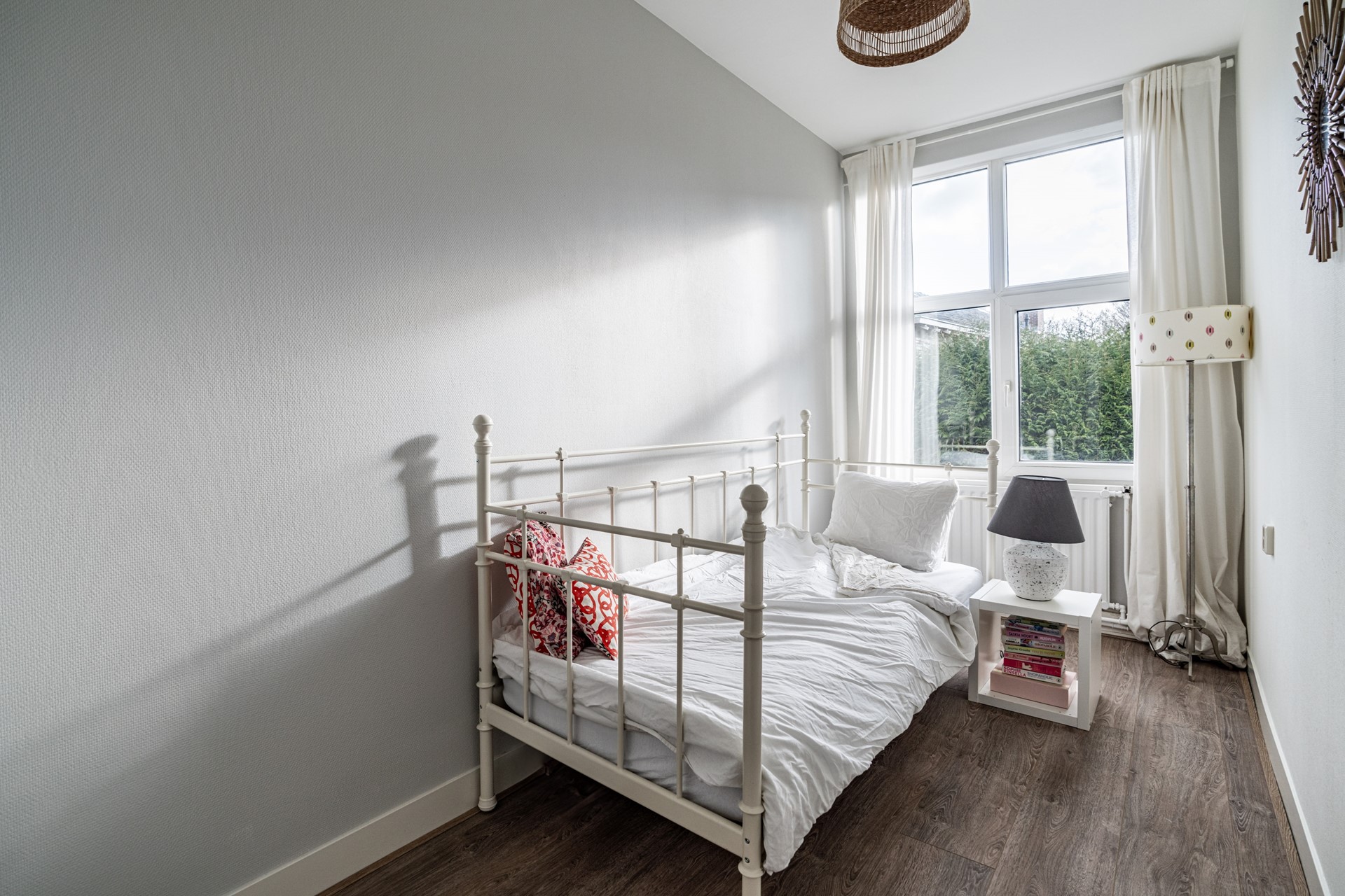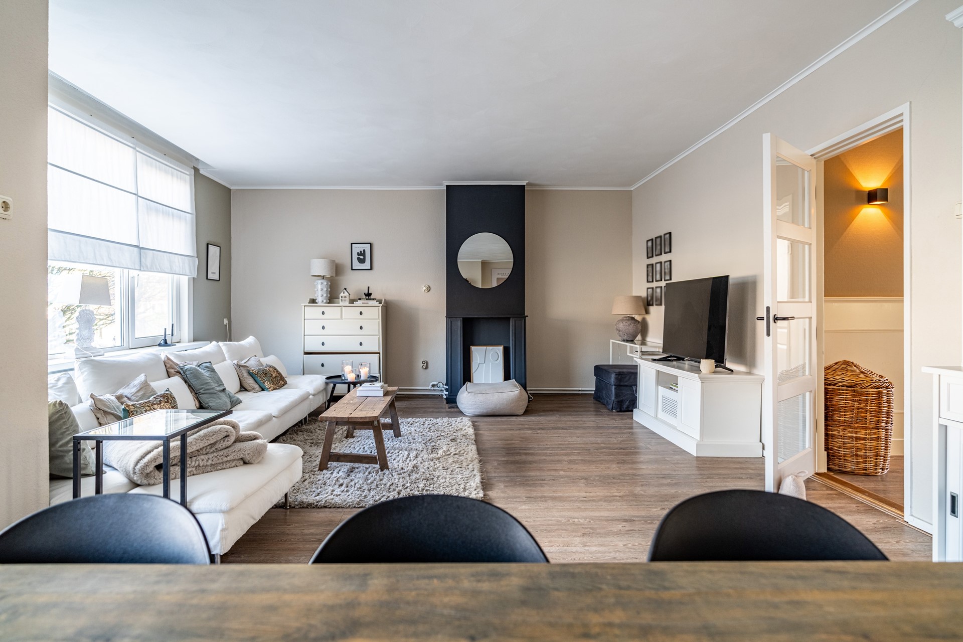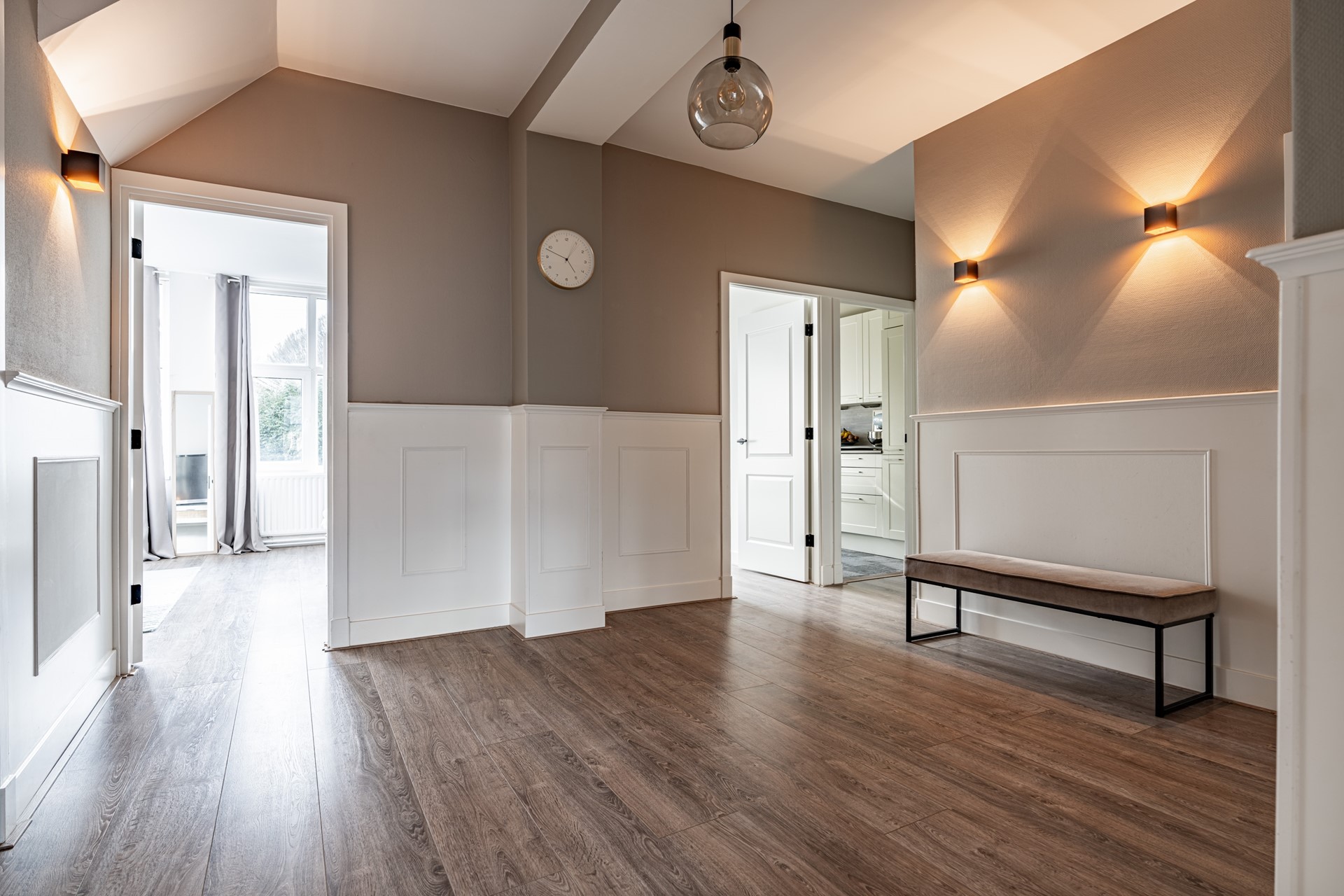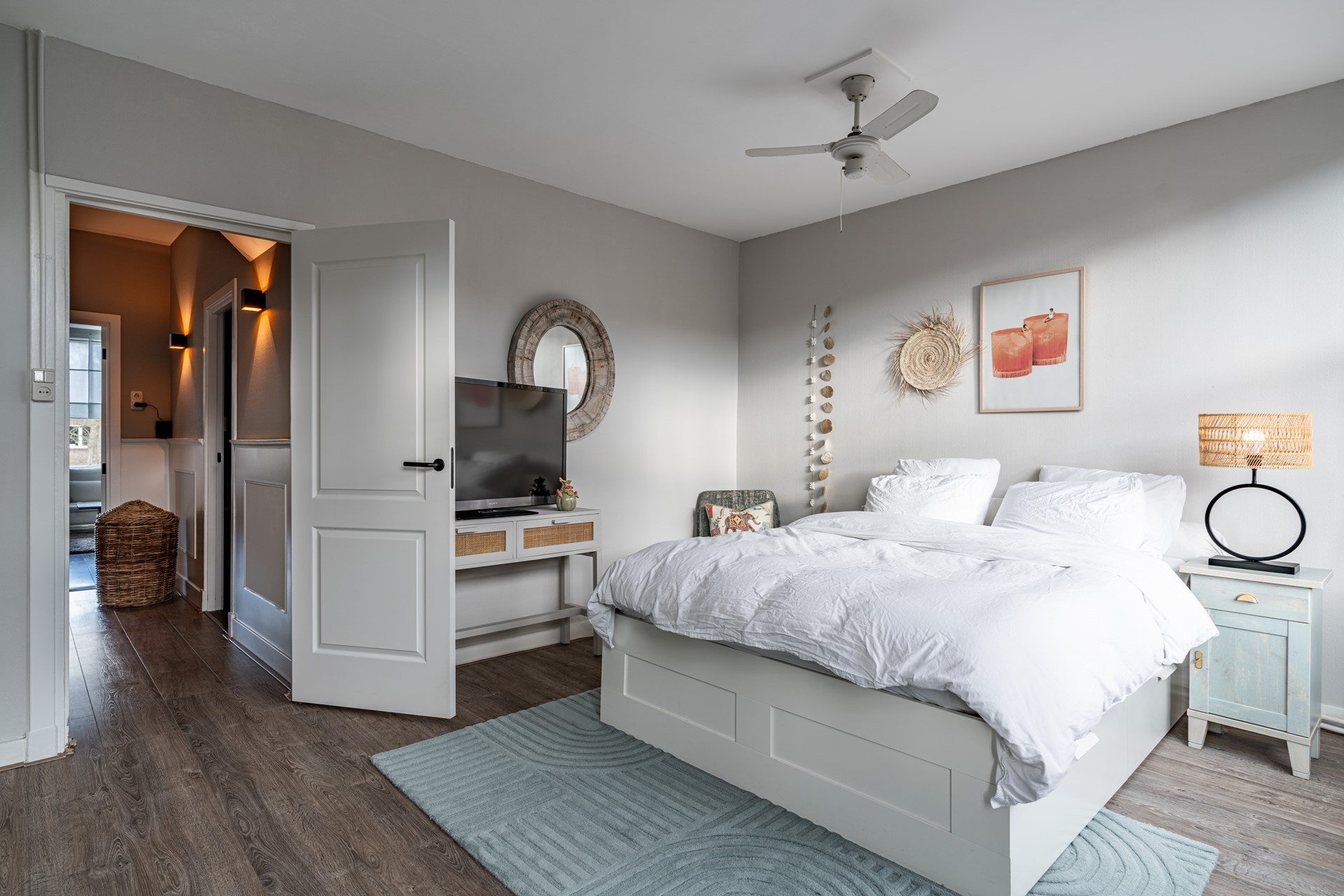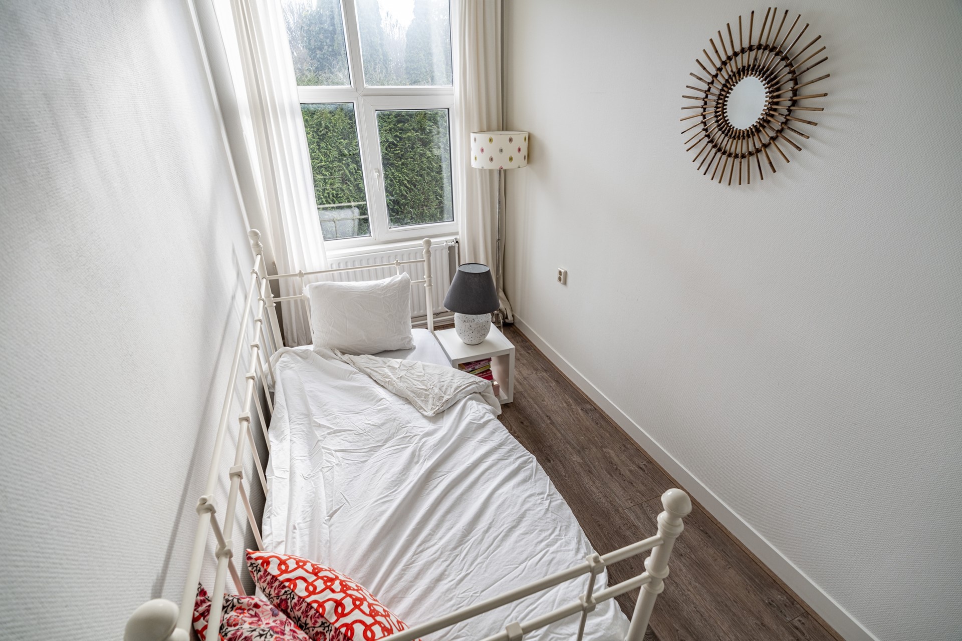 Via de trap op de begane grond bereik je de entree van de woning, waar je binnenkomt in een ruime hal die toegang biedt tot alle vertrekken. De lichte woonkamer heeft een prettige sfeer en biedt voldoende ruimte voor zowel een zithoek als een eethoek. Dankzij de grote ramen profiteert de woning van veel natuurlijk licht. Voorheen had de woning drie slaapkamers, maar een van de kamers is bij de hoofdslaapkamer betrokken, waardoor een zeer ruimere slaapkamer is ontstaan. De overige slaapkamer biedt voldoende mogelijkheden voor een slaapkamer of werkkamer.