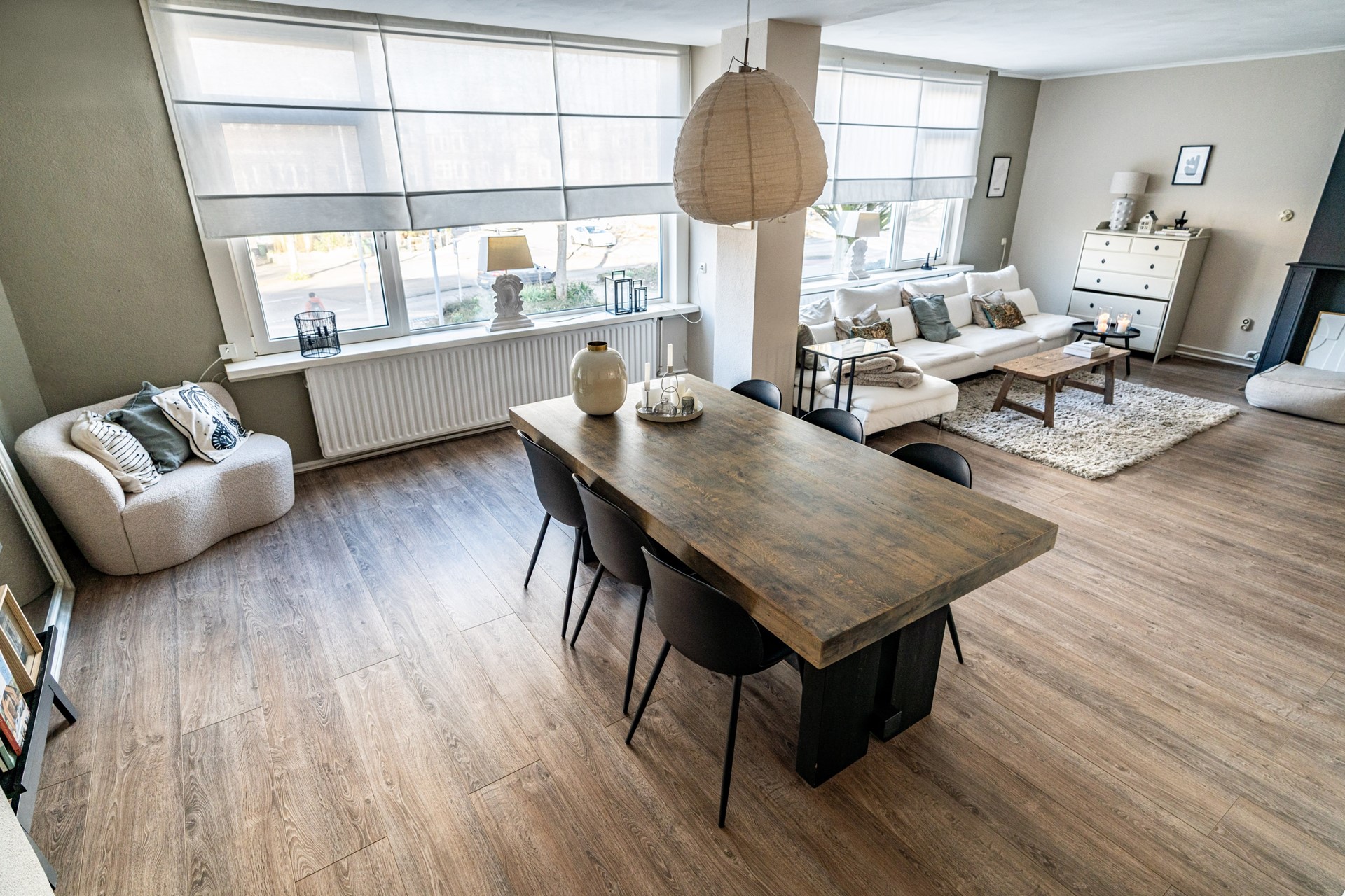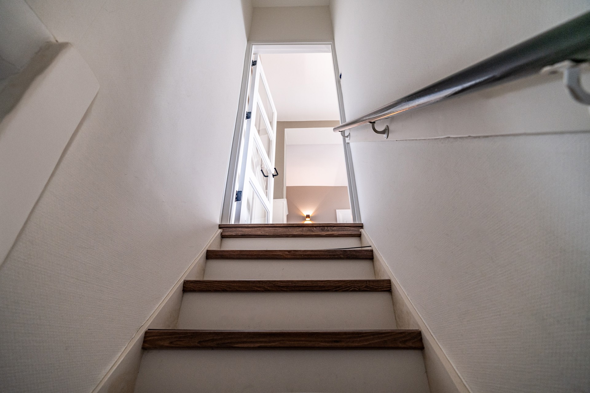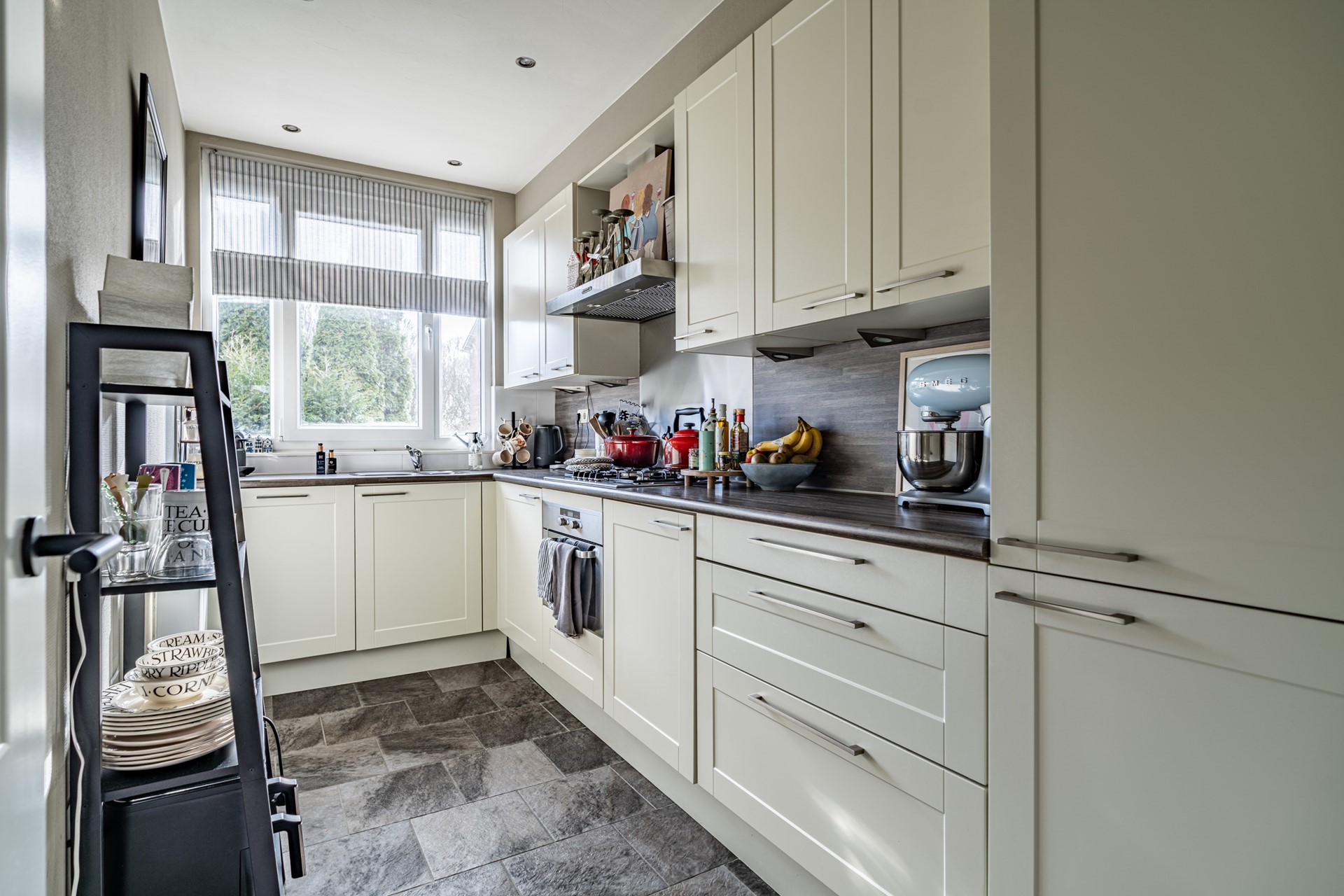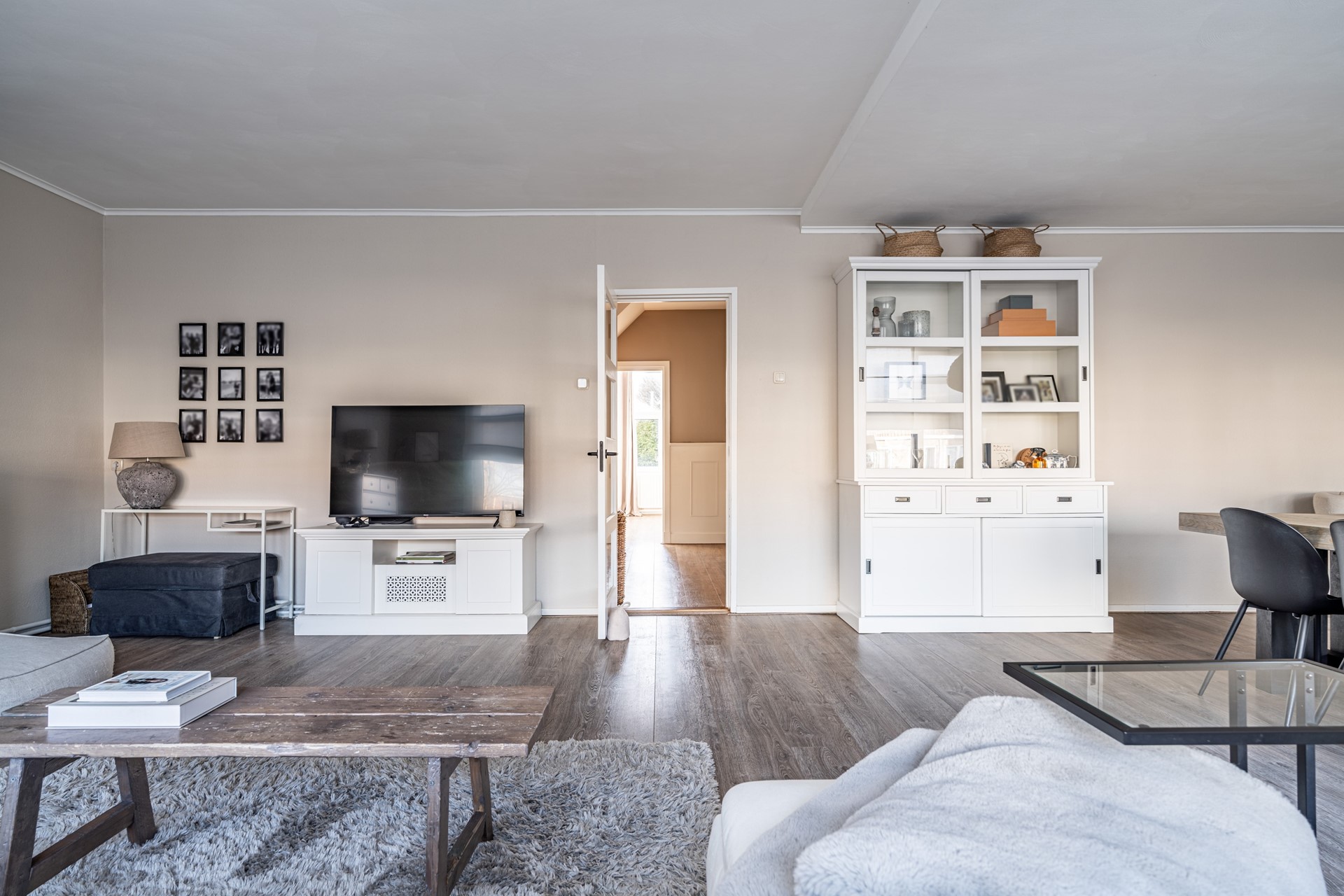 Via de trap op de begane grond bereik je de entree van de woning, waar je binnenkomt in een ruime hal die toegang biedt tot alle vertrekken. De lichte woonkamer heeft een prettige sfeer en biedt voldoende ruimte voor zowel een zithoek als een eethoek. Dankzij de grote ramen profiteert de woning van veel natuurlijk licht. Voorheen had de woning drie slaapkamers, maar een van de kamers is bij de hoofdslaapkamer betrokken, waardoor een zeer ruimere slaapkamer is ontstaan. De overige slaapkamer biedt voldoende mogelijkheden voor een slaapkamer of werkkamer.