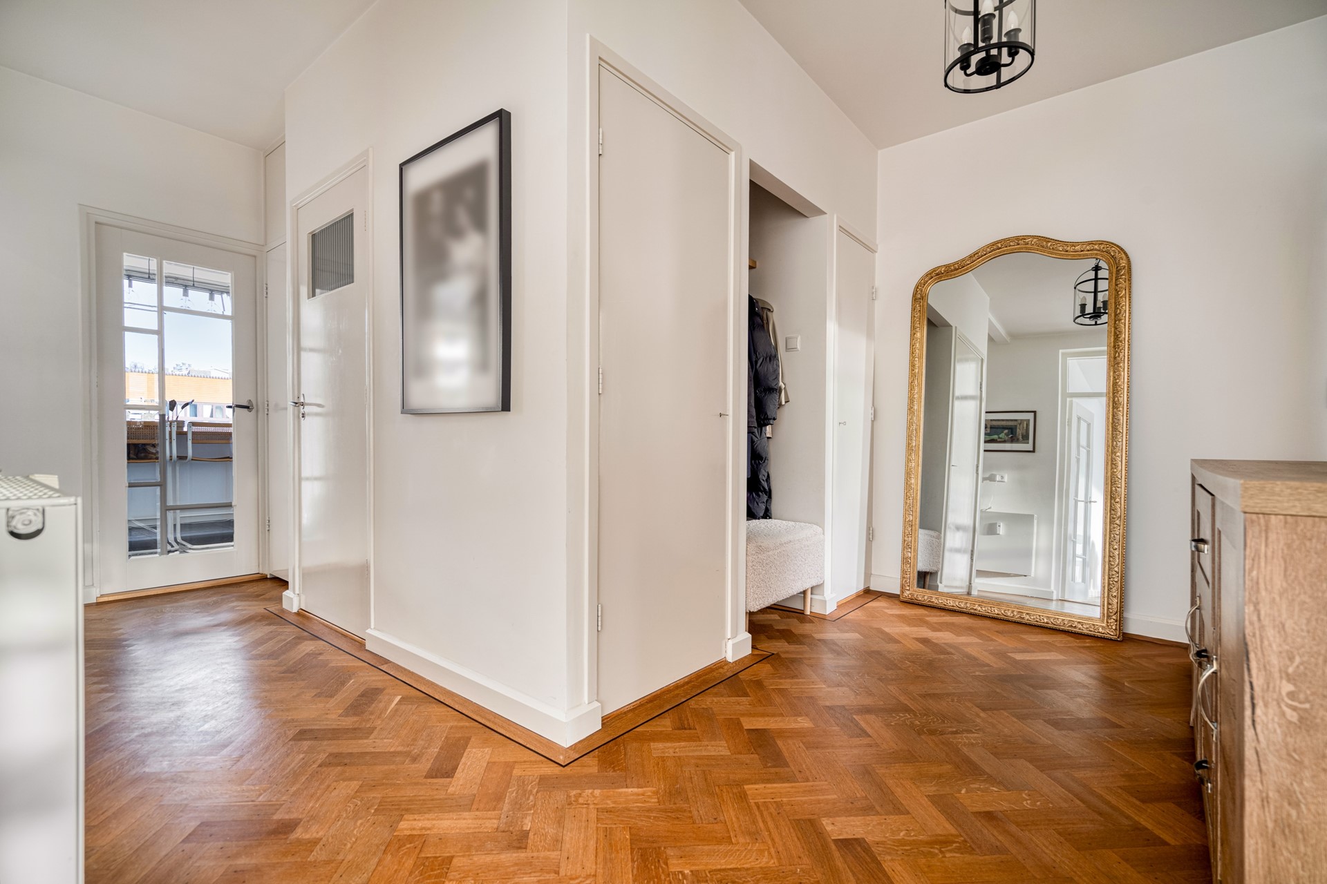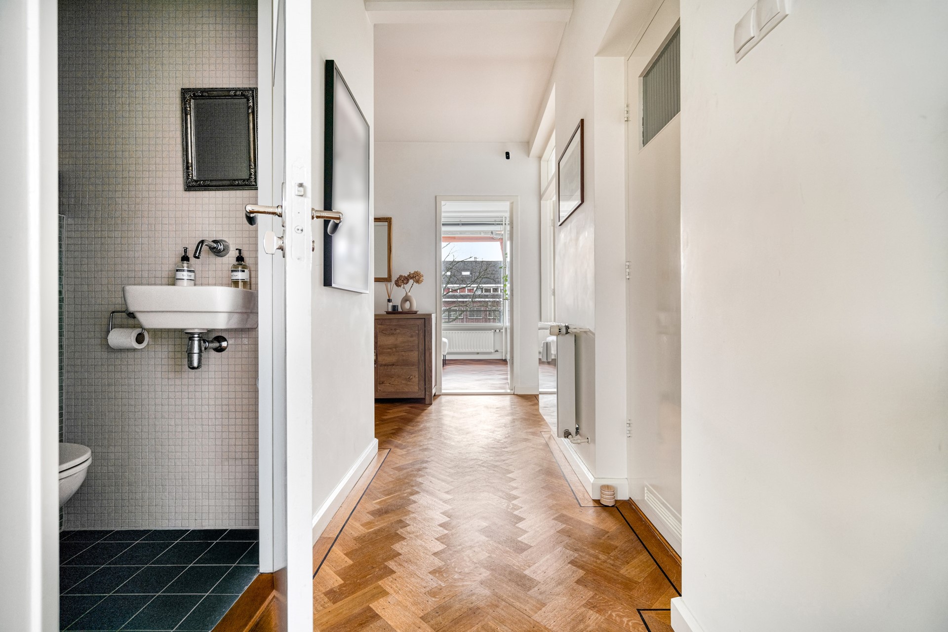 Through the entrance you enter the hallway, which provides access to all rooms in the apartment. The hallway is spacious and offers practical storage space, ideal for neatly storing coats, shoes, and other everyday items. The toilet is also located here. The mosaic tiles in soft sand tones and deep green-blue colors give this space a well-finished and luxurious appearance.