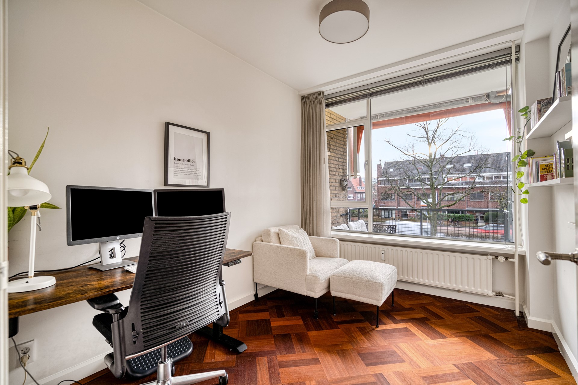 Aangrenzend aan de woonkamer bevindt zich een extra kamer die momenteel is ingericht als studeerkamer. Deze ruimte leent zich uitstekend als thuiswerkplek, logeerkamer of hobbyruimte en biedt daarmee flexibiliteit in gebruik.