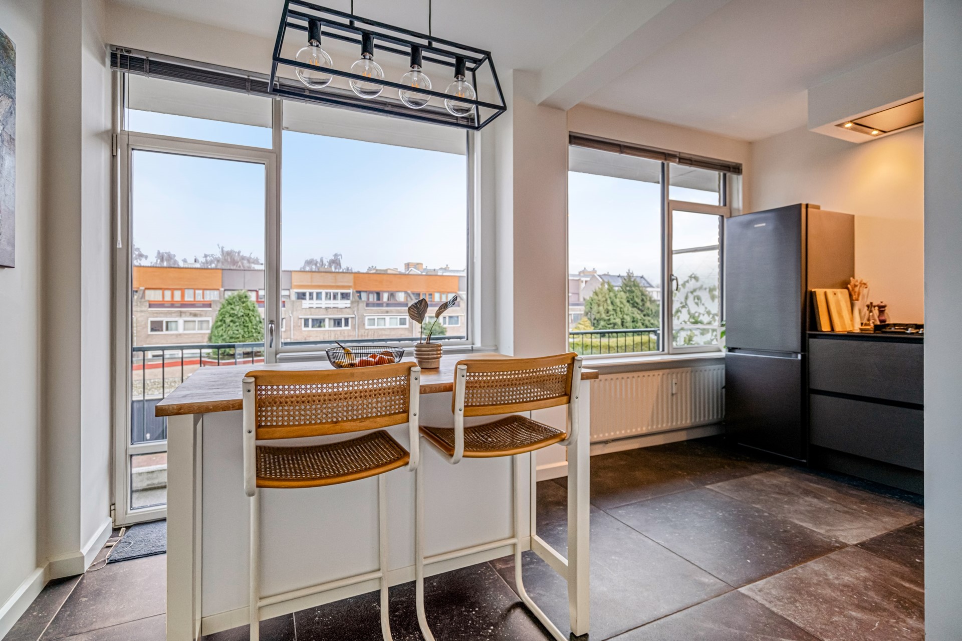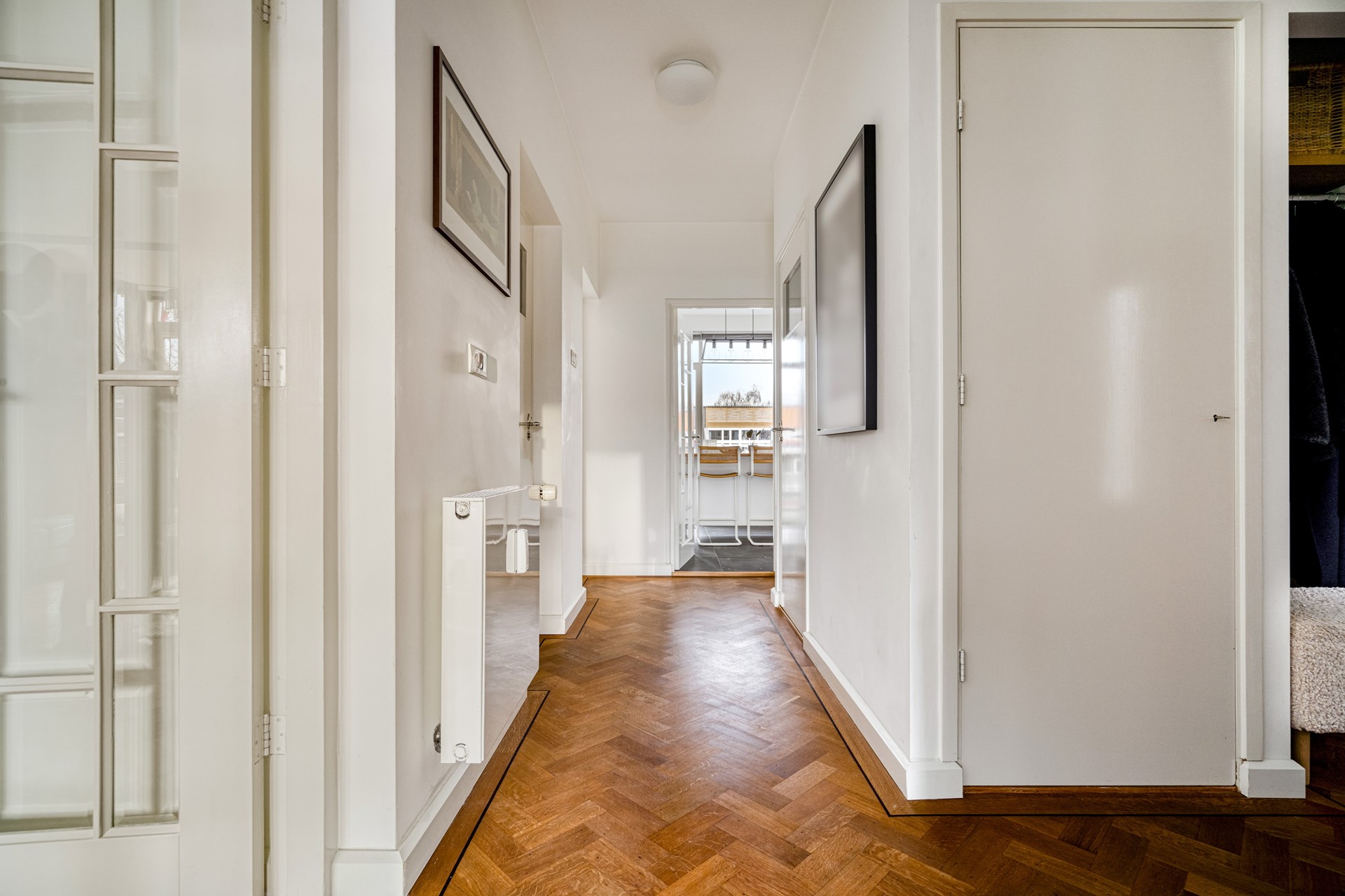 From the hallway you walk straight into the living room, which is southwest-facing. This spacious and bright living area forms the heart of the home and offers a comfortable living environment with ample space for a generous seating area as well as a dining table. Thanks to the large windows, the living room enjoys plenty of natural light and an open view. From the living room there is direct access to the front-facing balcony, where you can sit outside in peace while enjoying views of the green surroundings.