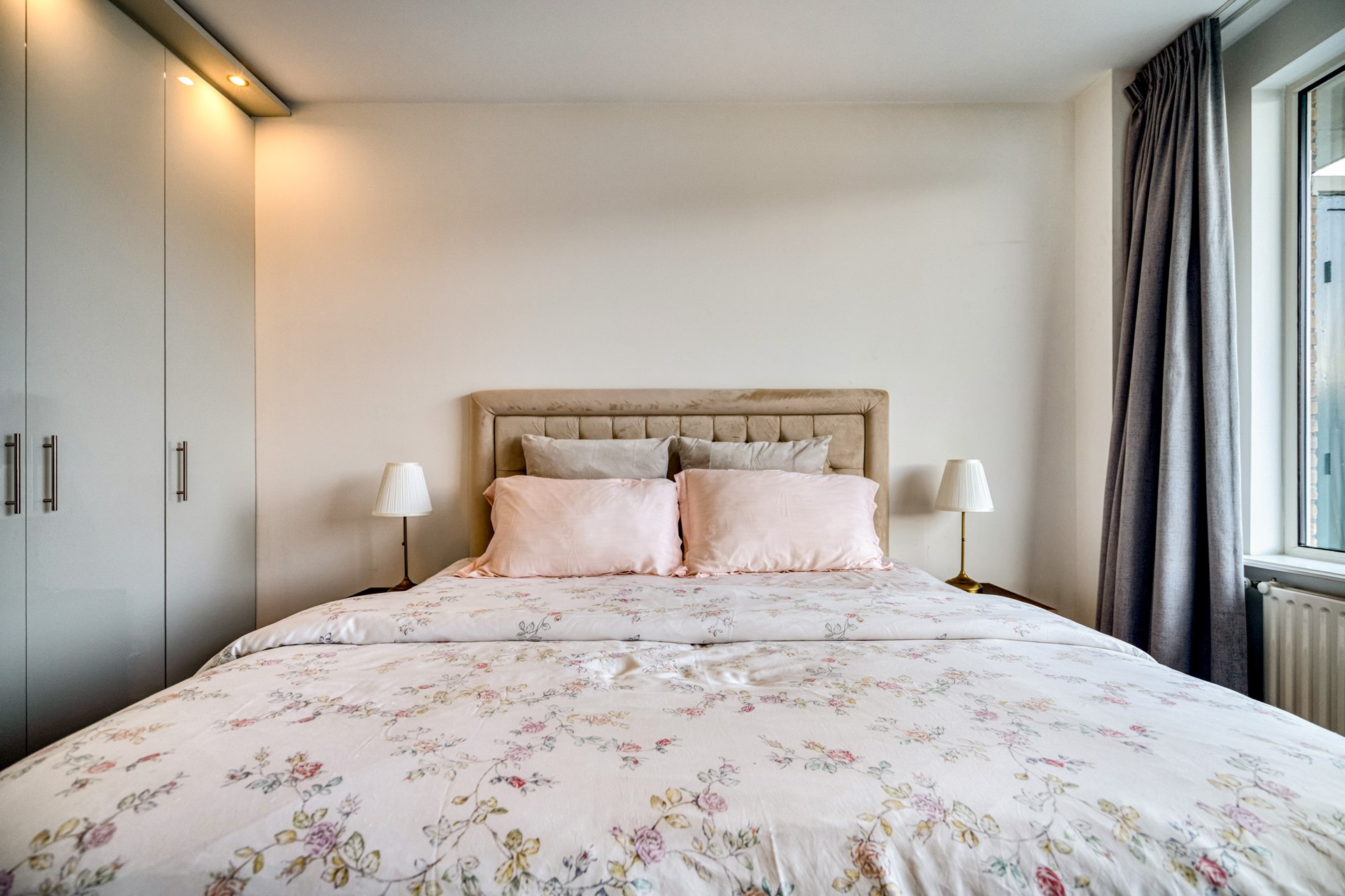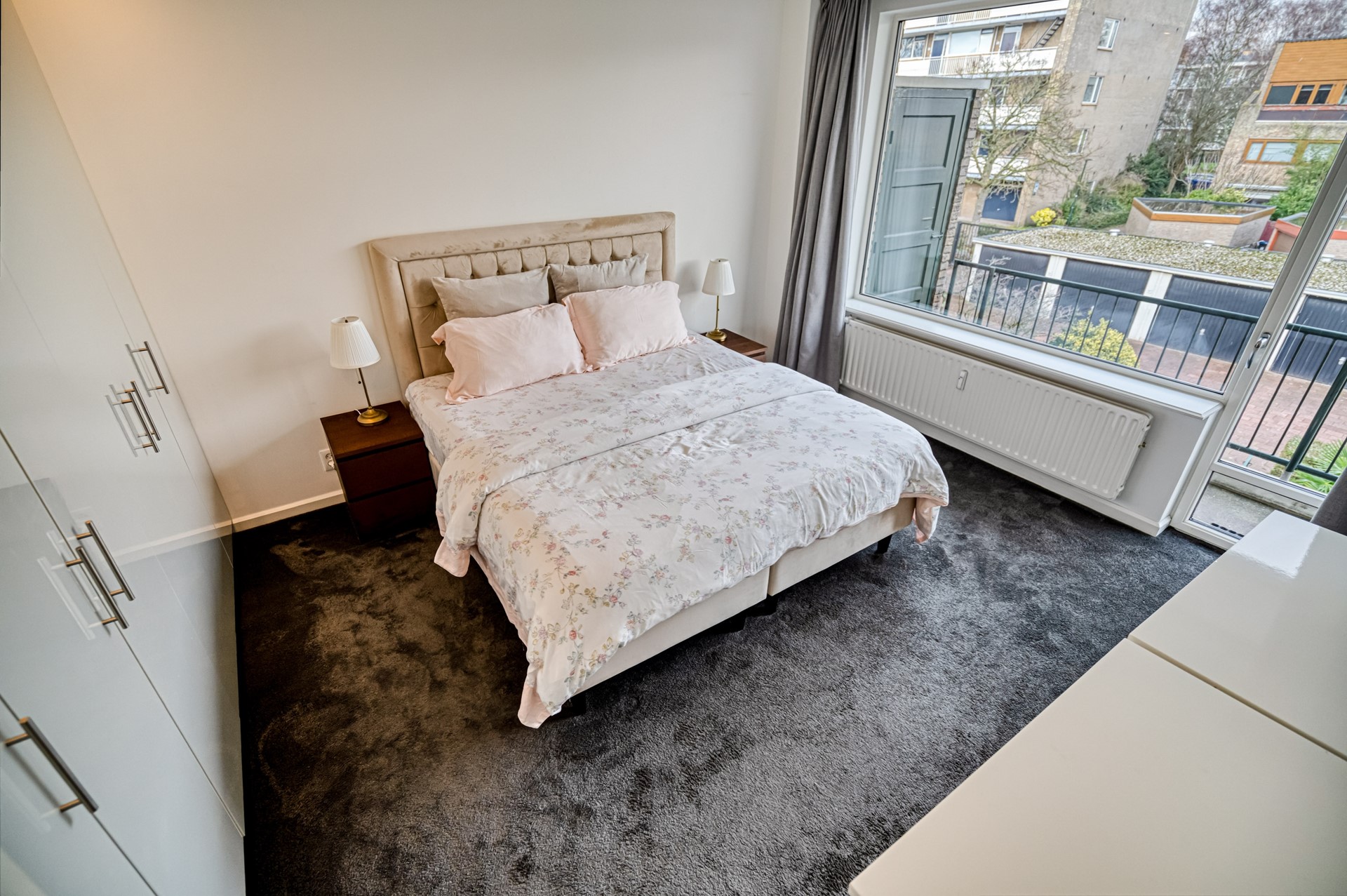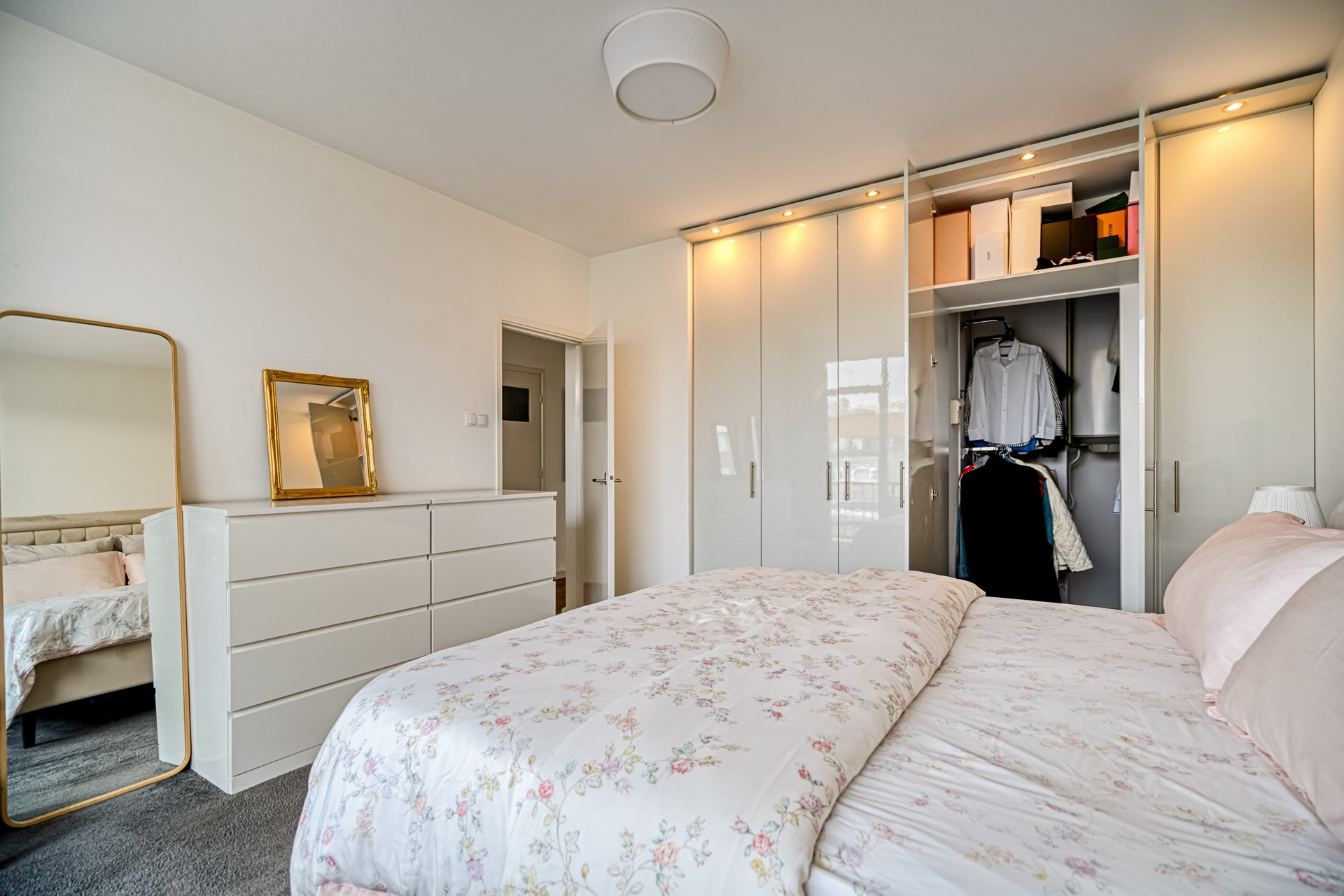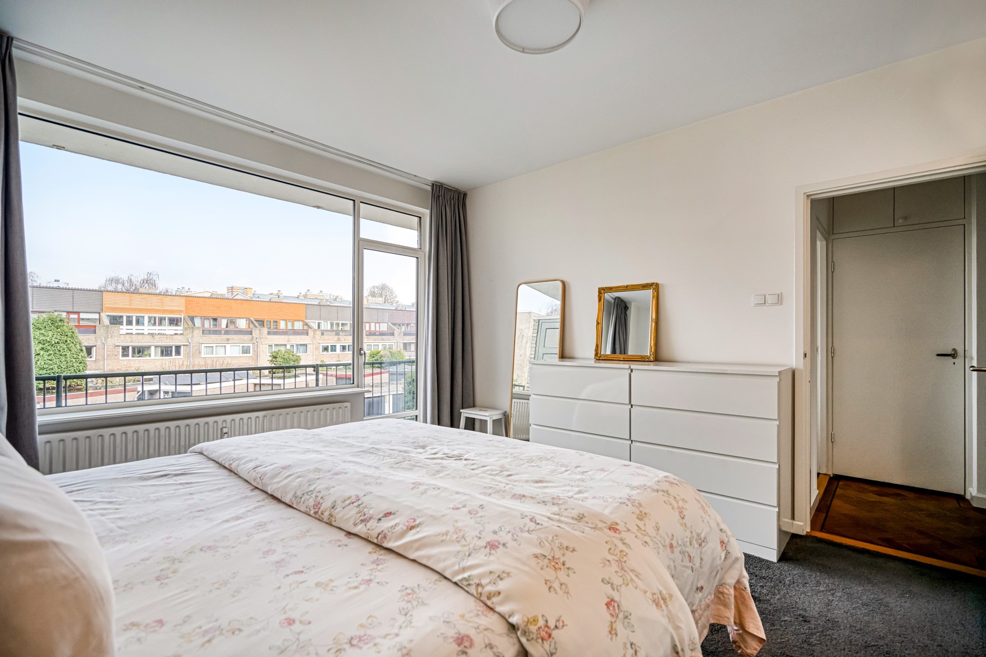 Via de keuken is het ruime balkon aan de achterzijde bereikbaar. Dit balkon is gelegen op het noordoosten en biedt aangename ochtend- en middagzon, wat zorgt voor een frisse en comfortabele buitenruimte, ideaal voor een ontbijt of rustige start van de dag. Het balkon loopt door naar de master bedroom. De master bedroom is ruim van opzet en voorzien van een ingebouwde kledingkast en een separate inloopkast, wat zorgt voor veel praktische bergruimte en wooncomfort.