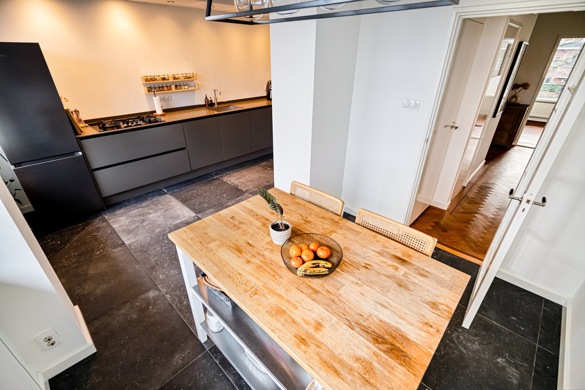 On the other side of the apartment is the spacious and modern open kitchen. The kitchen is sleekly designed and equipped with high-quality built-in appliances, including a four-burner gas hob, integrated extractor hood, dishwasher, double combi oven, and a Quooker. The kitchen features modern recessed lighting and also offers sufficient space for a dining table, making it a pleasant area for cooking and dining together.