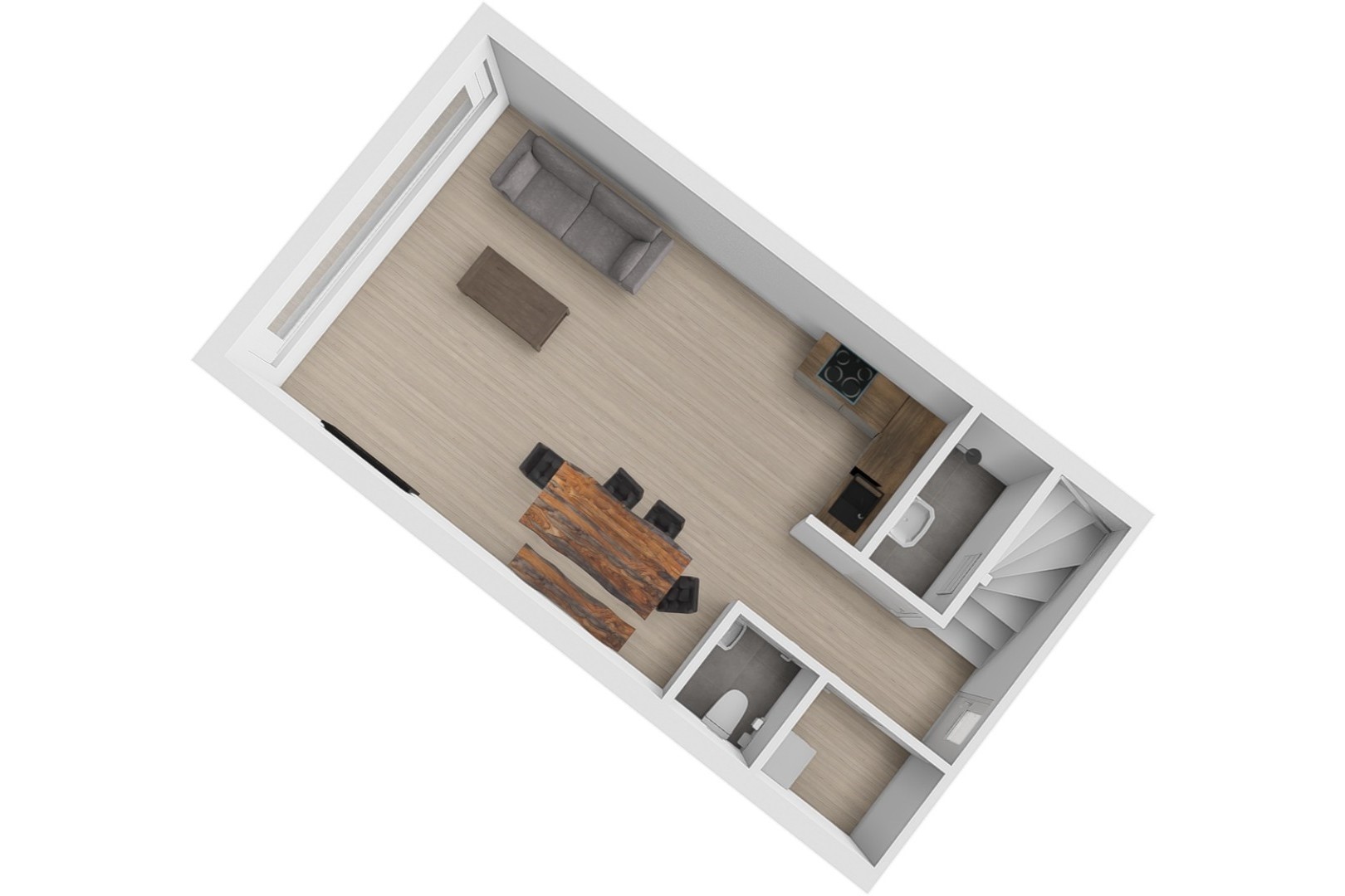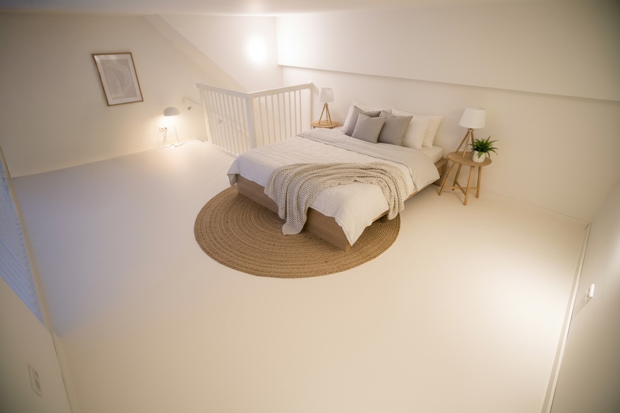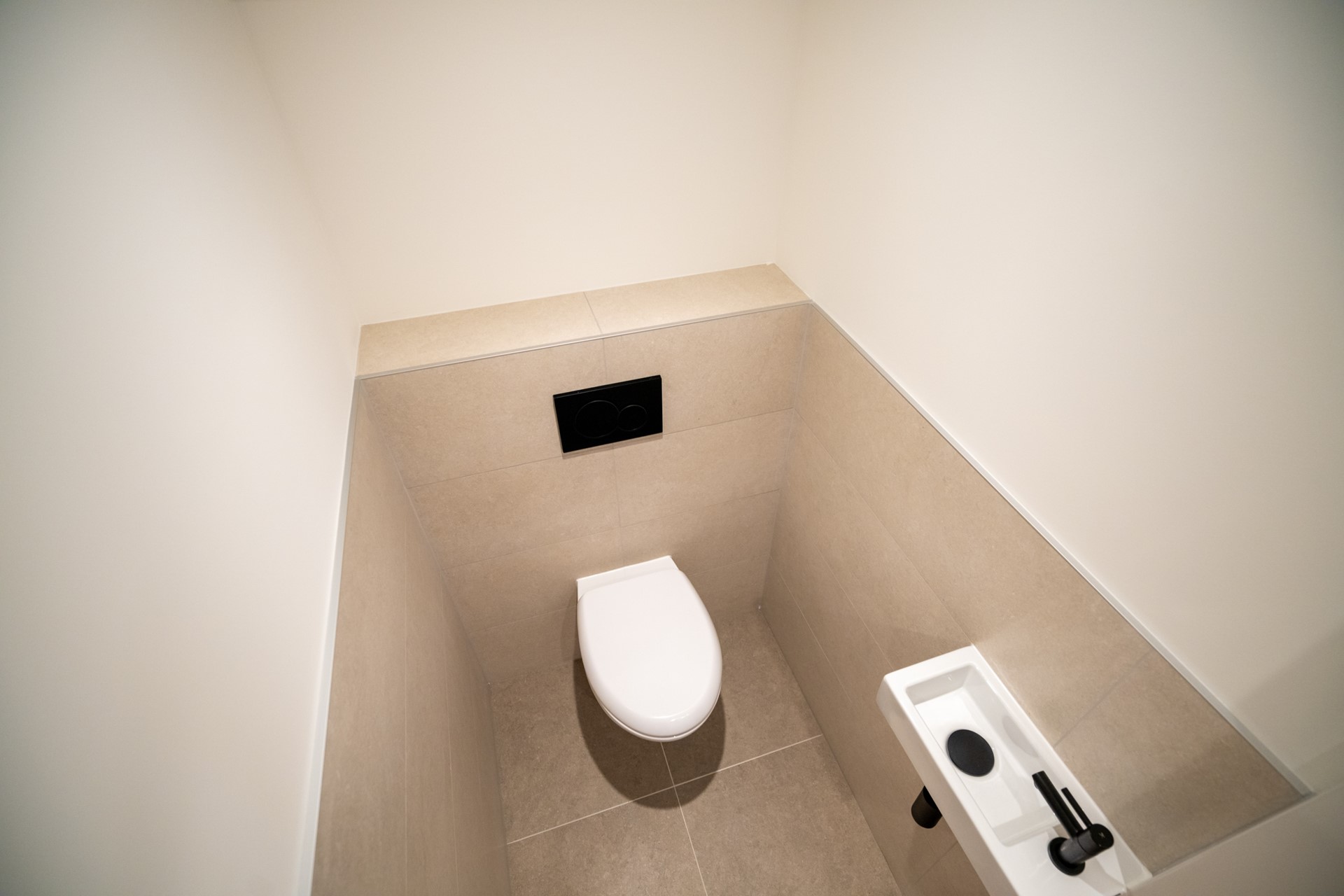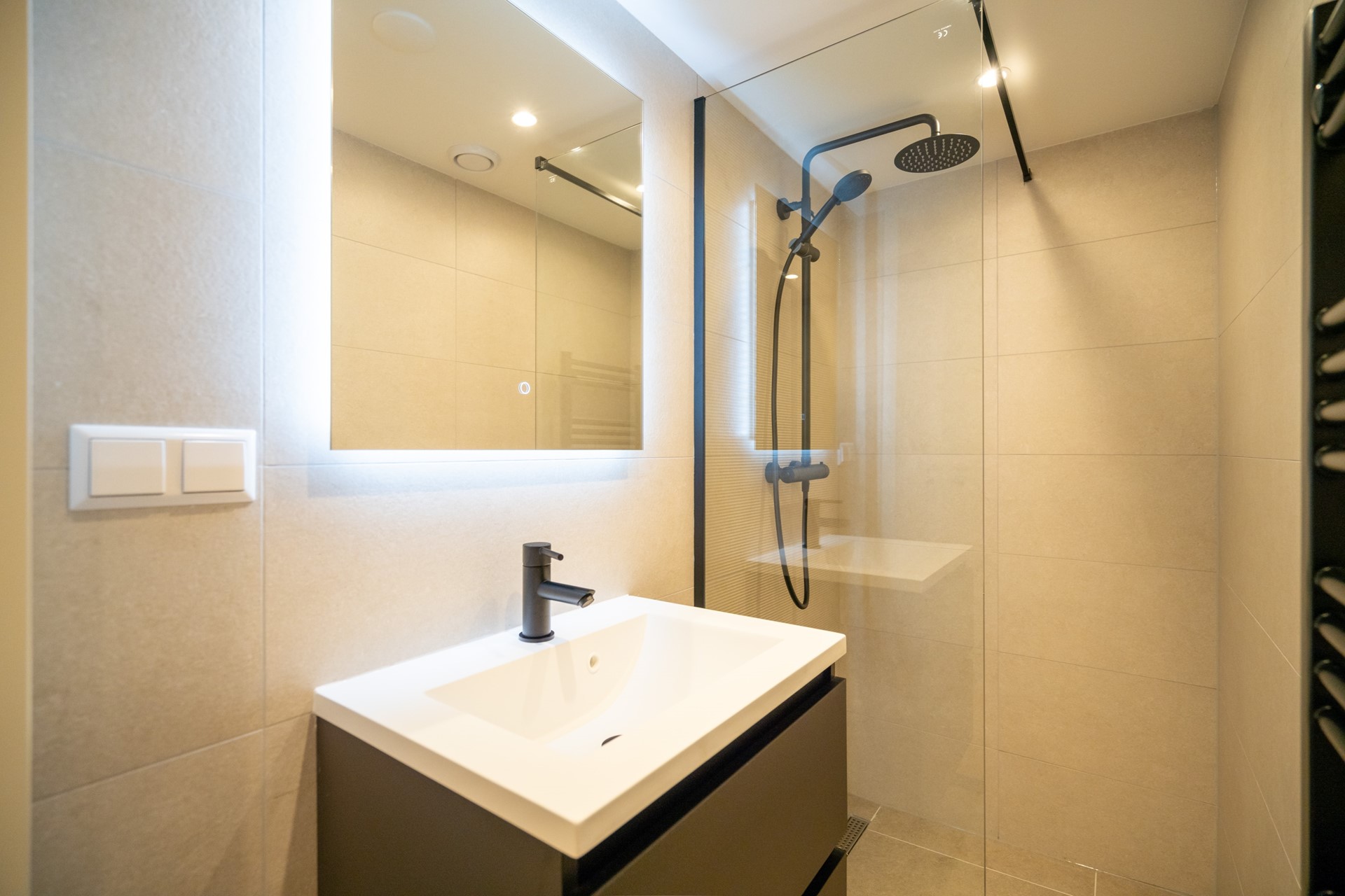 Indeling en afwerking Via de centrale hal met meterkasten en de gemeenschappelijke fietsenberging heeft u toegang tot de zes appartementen. Elk appartement heeft zijn eigen karakter en indeling, maar allemaal zijn ze: - Voorzien van een vide met slaapkamer; - Afgewerkt met een laminaat vloer en volledige stoffering; - Uitgerust met verlichting en airconditioning (verwarmen én koelen); - Voorzien van een moderne keuken met inductiekookplaat en oven met magnetronfunctie; - Een volledig betegelde badkamer met inloopdouche en wastafelmeubel. - Video belsysteem aanwezig