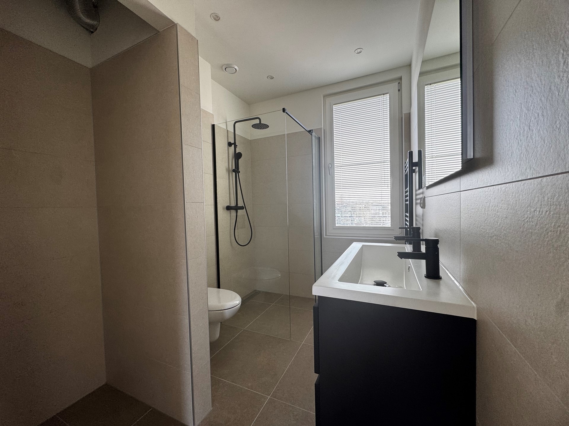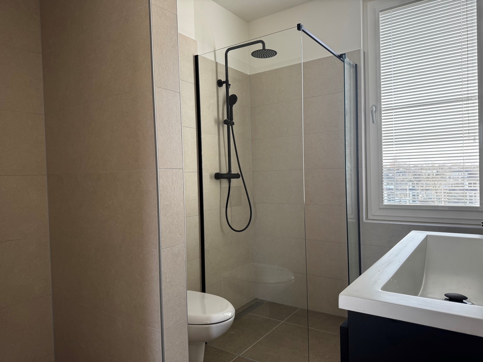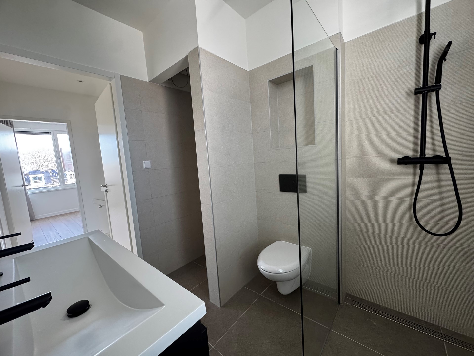 De badkamer is volledig betegeld en voorzien van een inloopdouche, dubbel wastafelmeubel en tweede hangend toilet en aansluiting voor wasmachine en droger. Het spreekt voor zich dat ook deze verdieping nieuw is en volledig gestoffeerd.