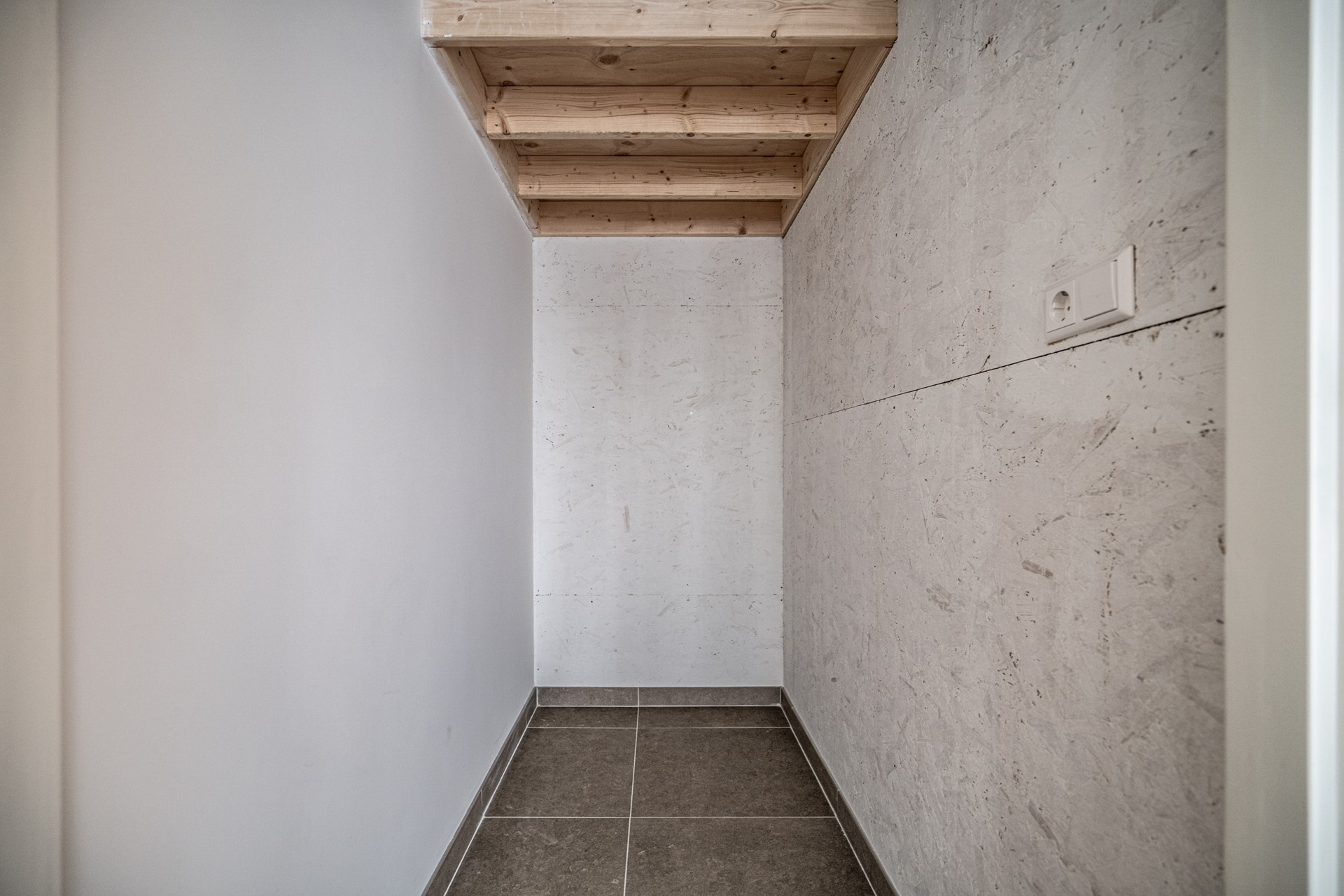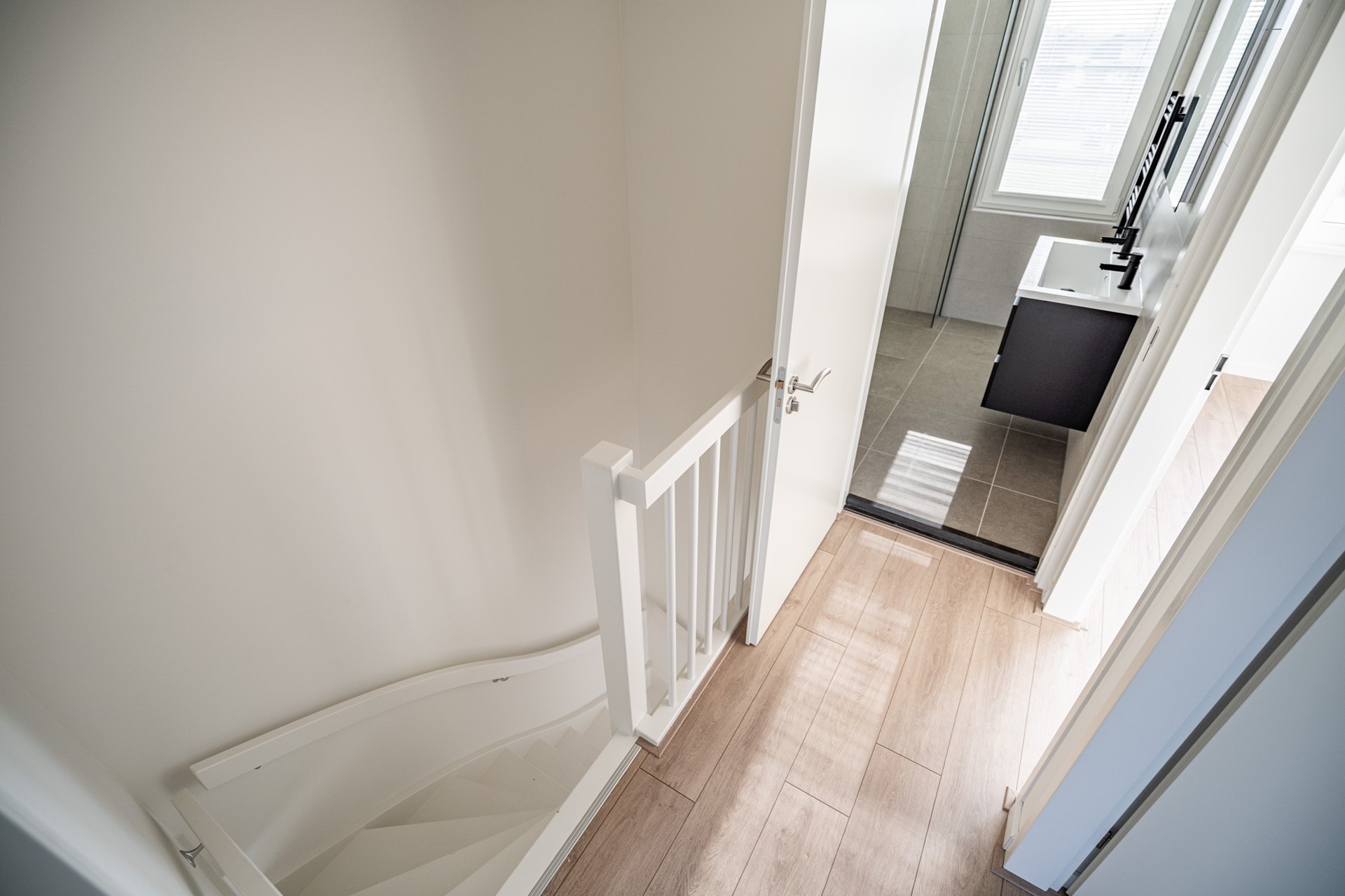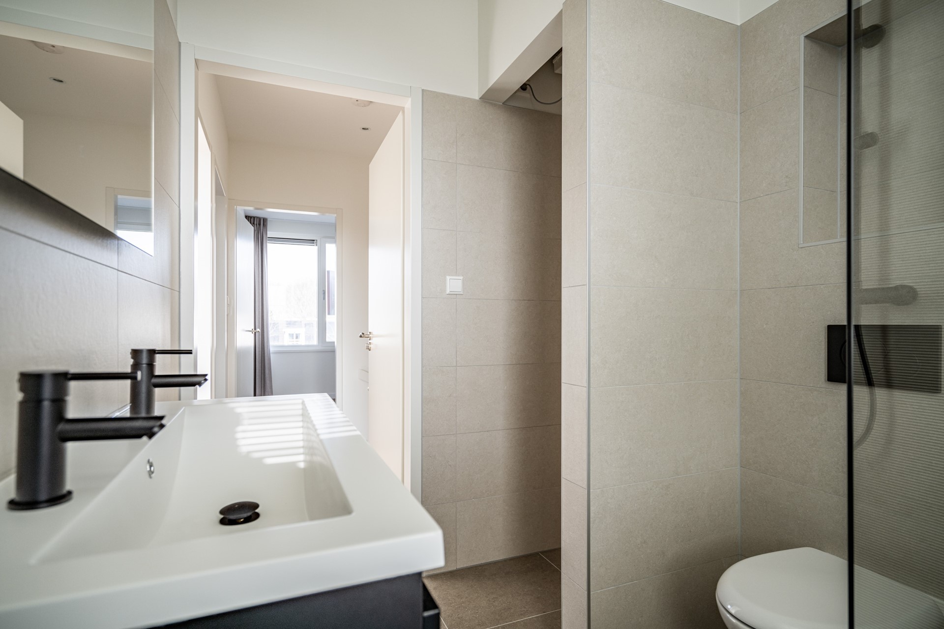 De badkamer is volledig betegeld en voorzien van een inloopdouche, dubbel wastafelmeubel en tweede hangend toilet en aansluiting voor wasmachine en droger. Het spreekt voor zich dat ook deze verdieping nieuw is en volledig gestoffeerd.
