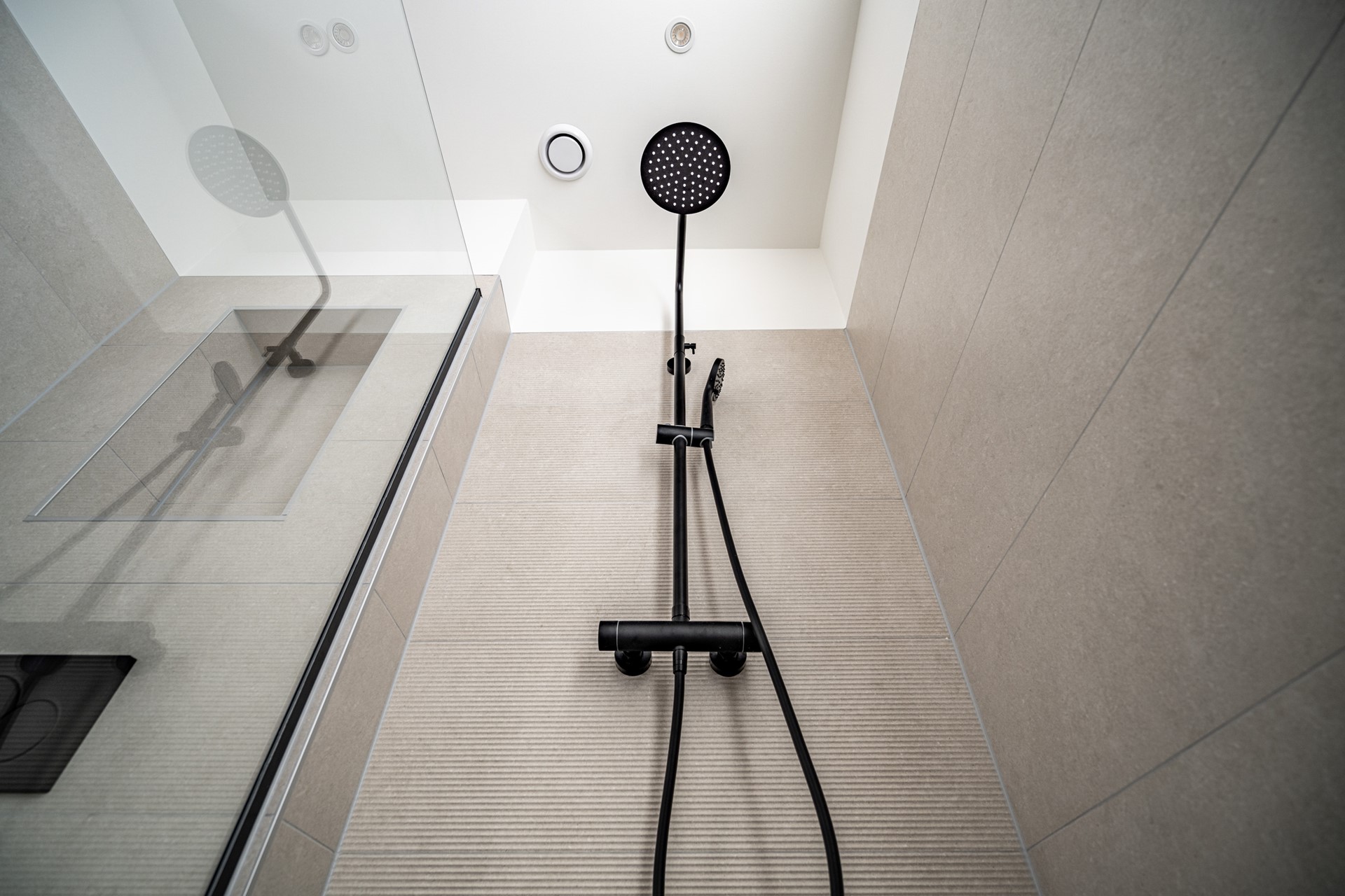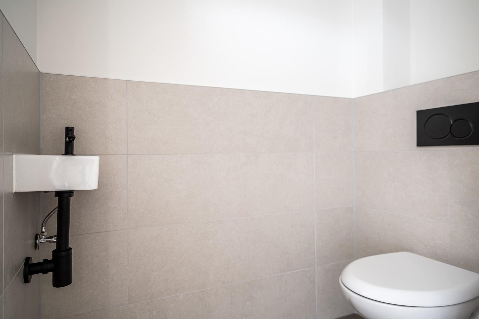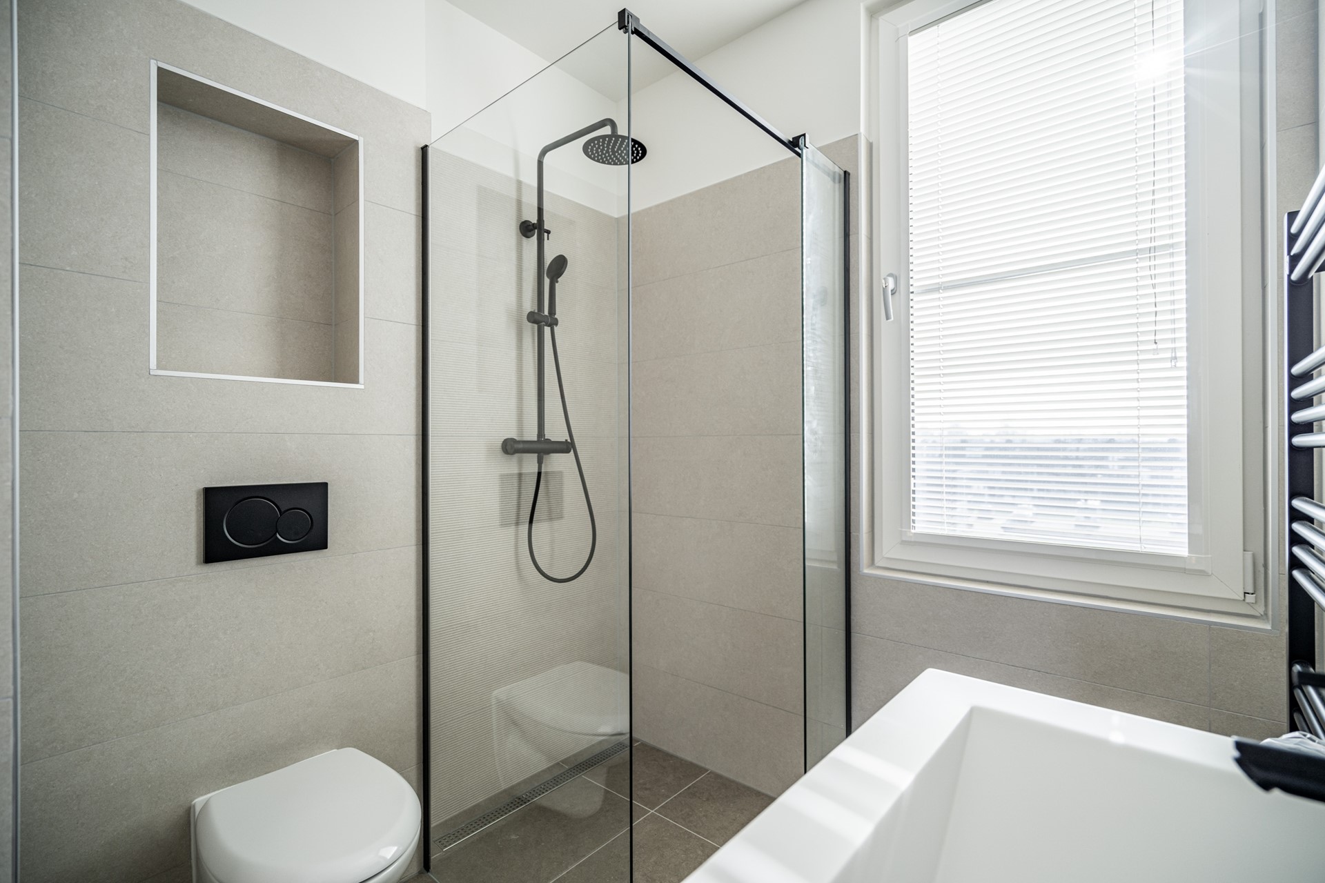 De badkamer is volledig betegeld en voorzien van een inloopdouche, dubbel wastafelmeubel en tweede hangend toilet en aansluiting voor wasmachine en droger. Het spreekt voor zich dat ook deze verdieping nieuw is en volledig gestoffeerd.