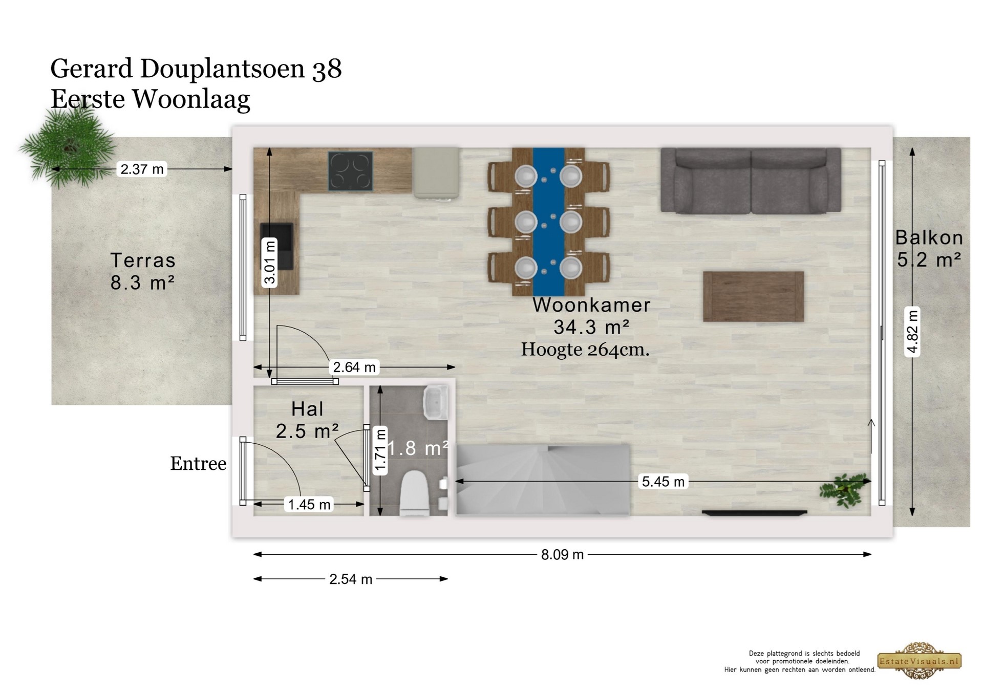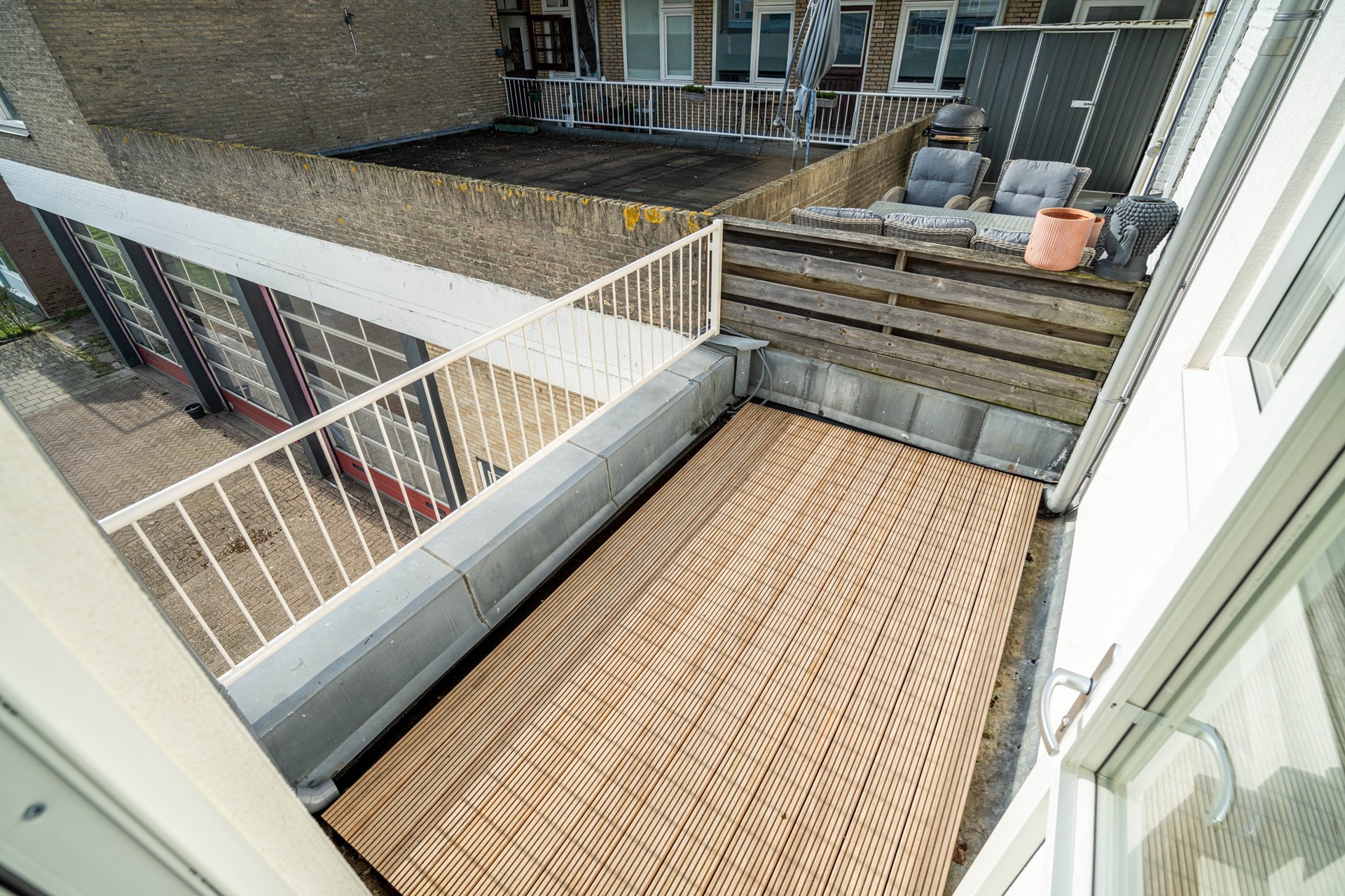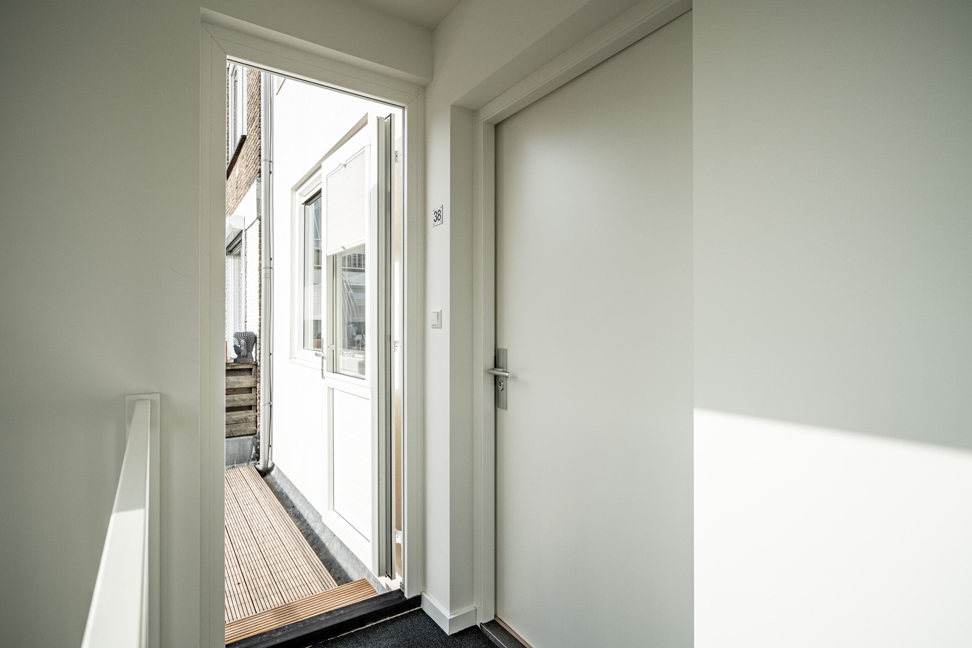 Aangekomen bij de voordeur vinden we het dakterras aan de linkerkant. Hier kunt u geniet van de middag en avondzon.
