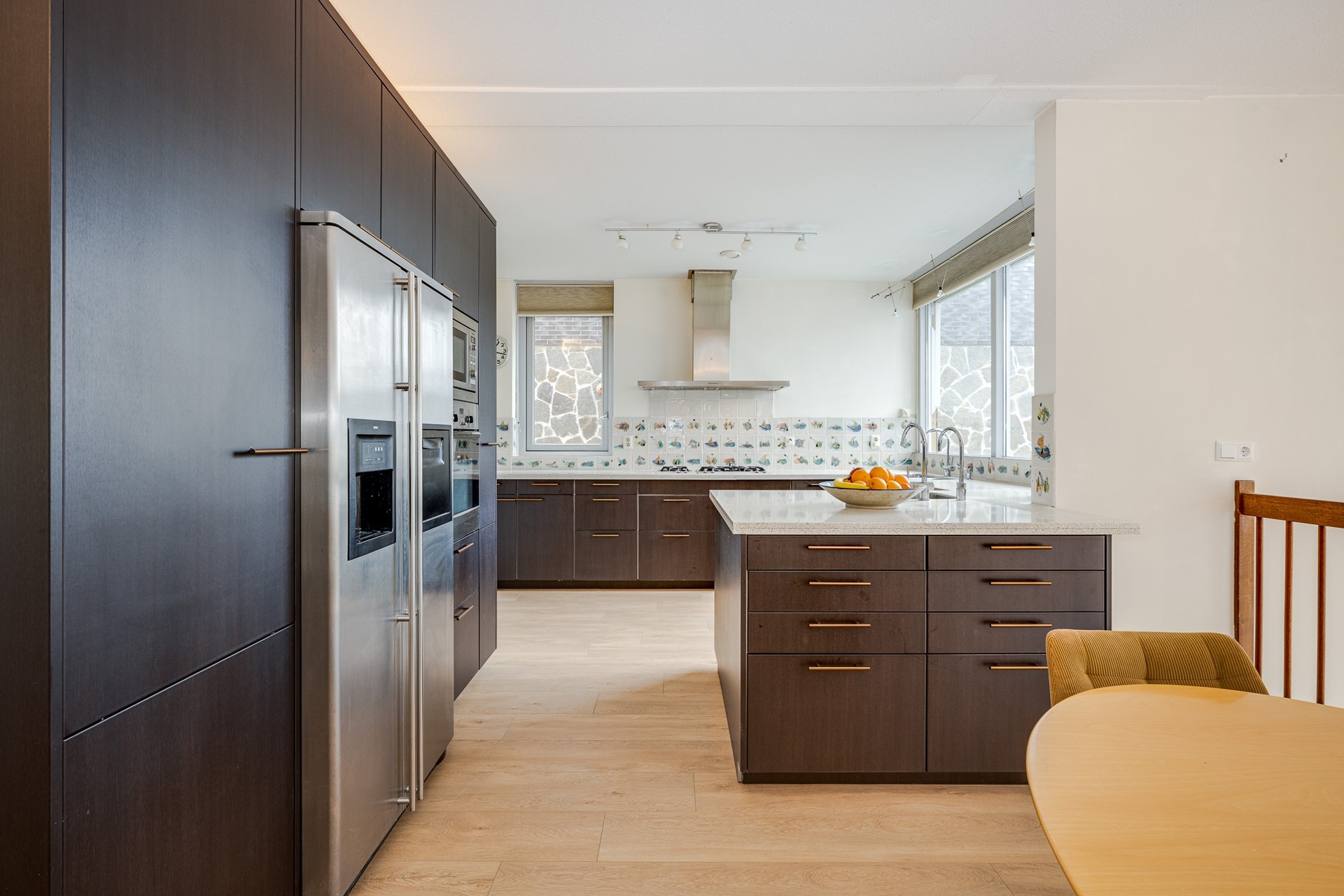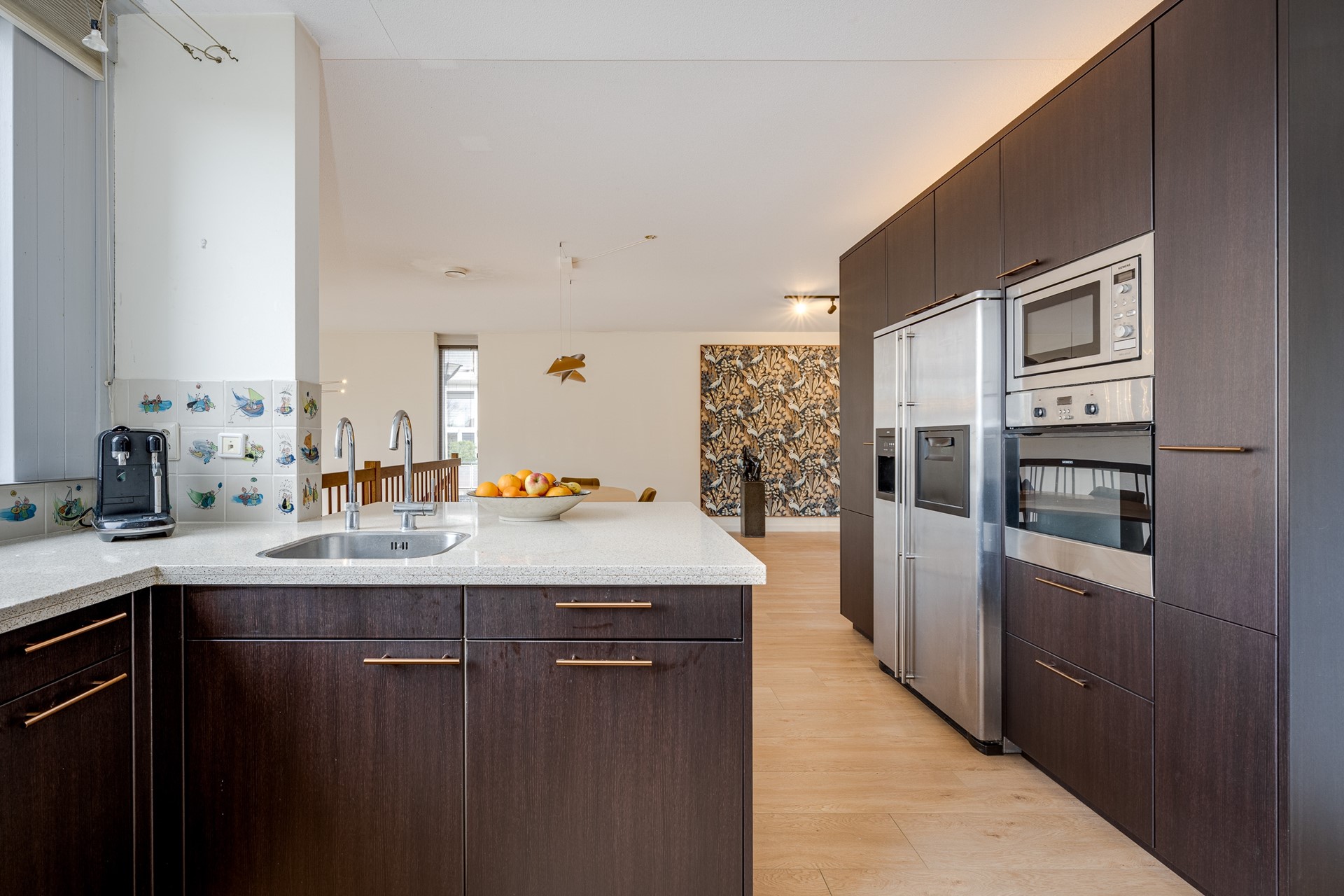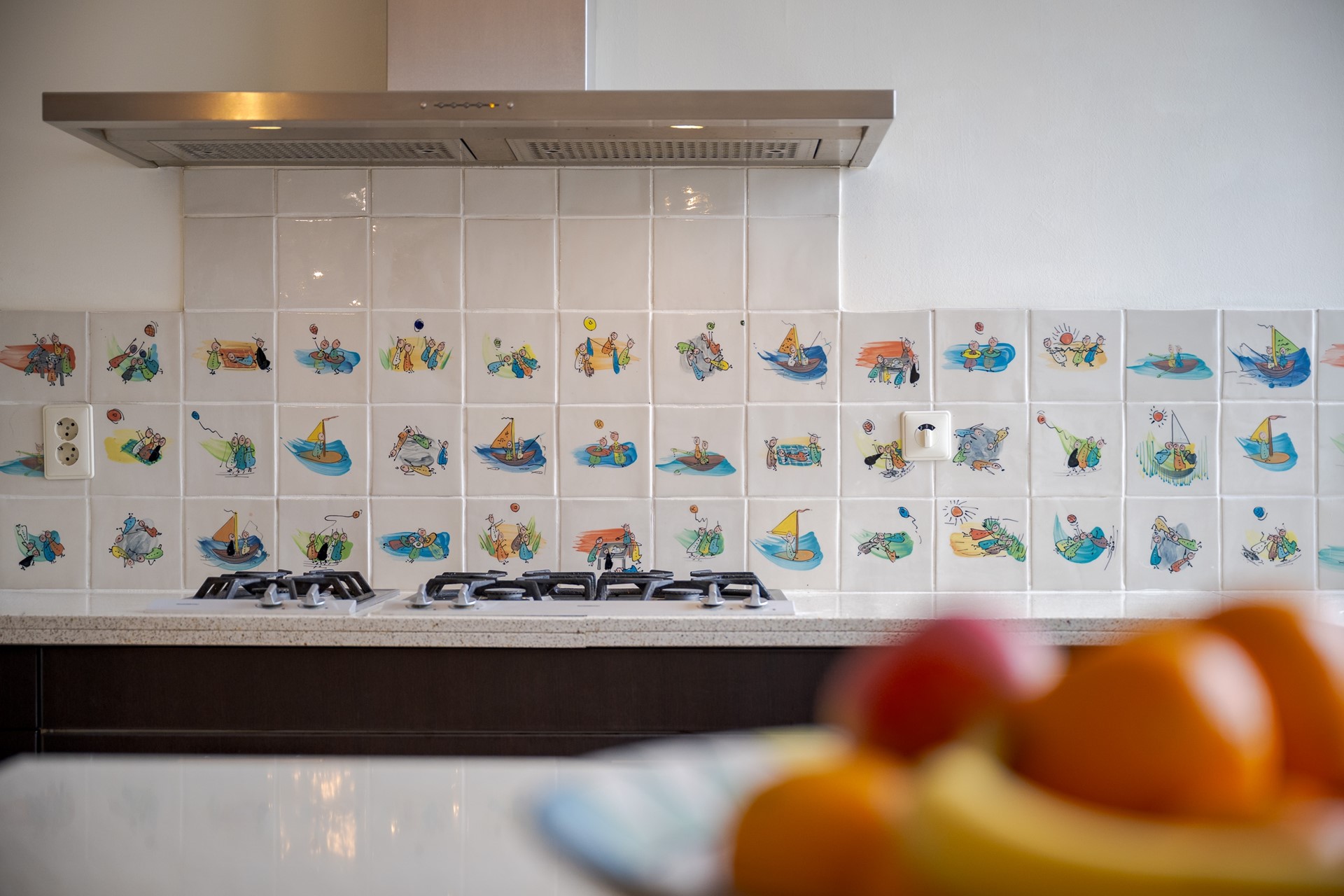 The kitchen features a true eye-catcher: handcrafted designer tiles by artist Thomas de Roo, inspired by life on and around the water. Each tile is unique and offers a contemporary interpretation of traditional Delft Blue.