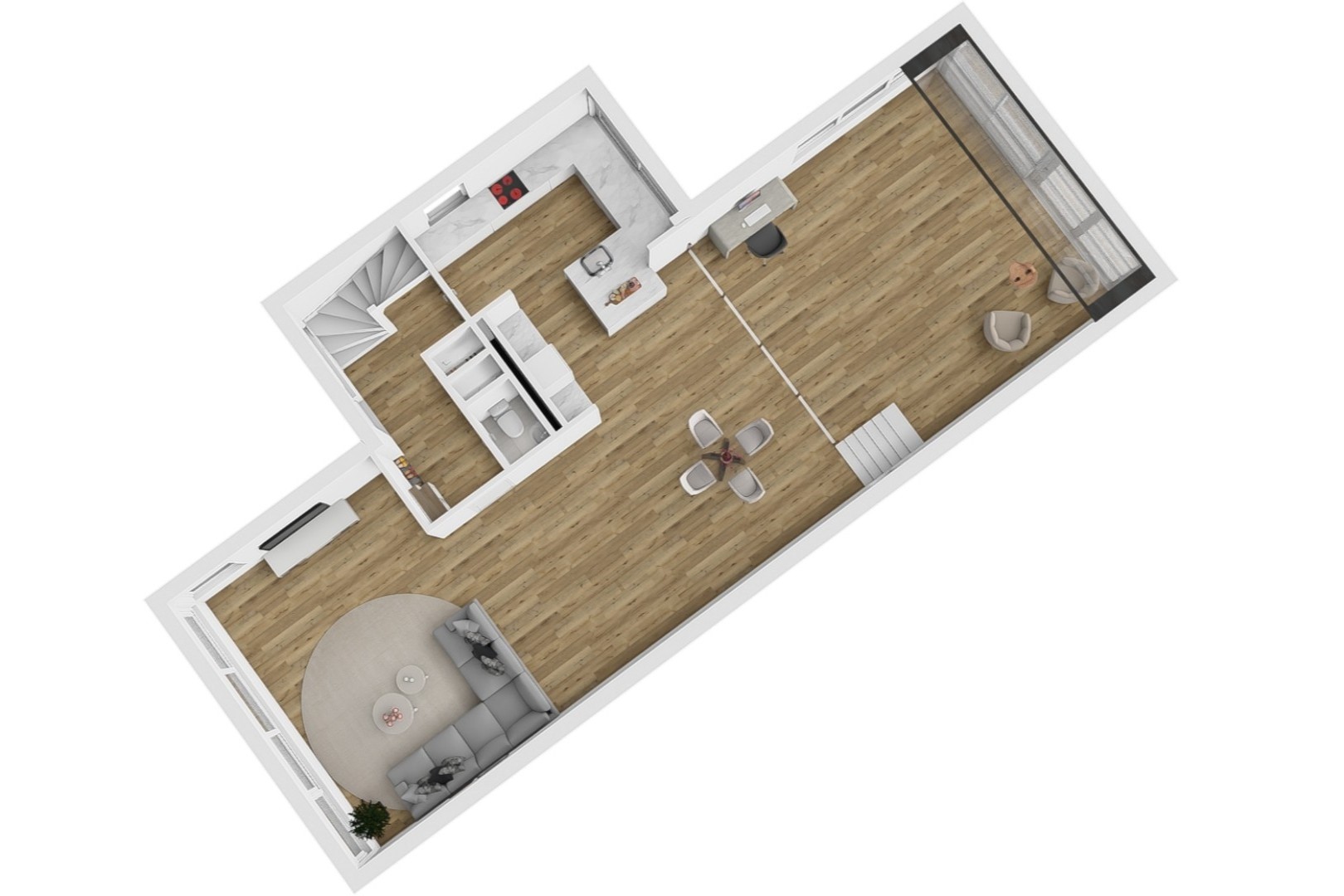 The main living level is equally remarkable. Thanks to a magnificent glass extension and a full-width window façade, the living area stretches across an impressive 17 meters. Transparent, spacious, and perfectly suited for both relaxation and stylish entertaining.
