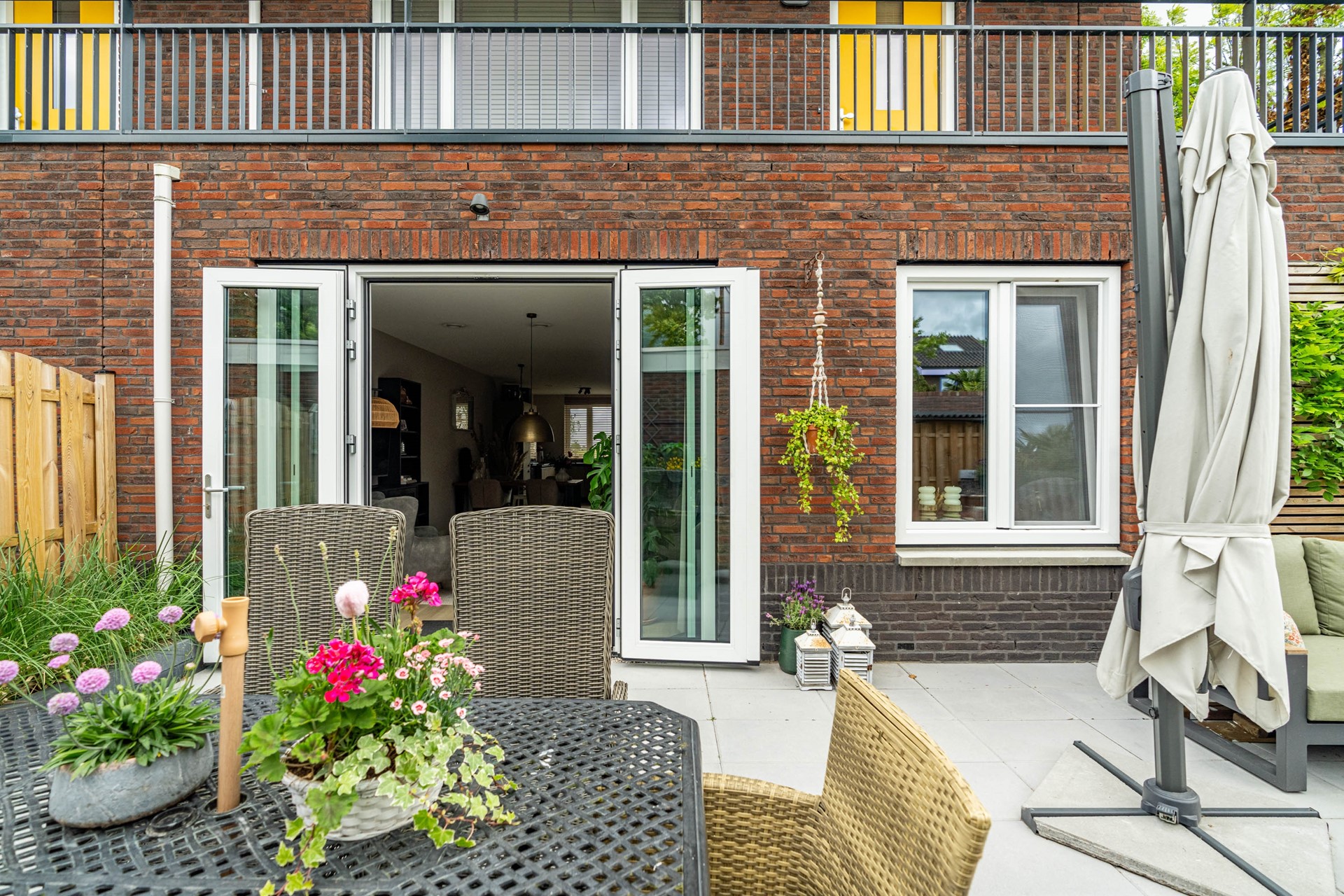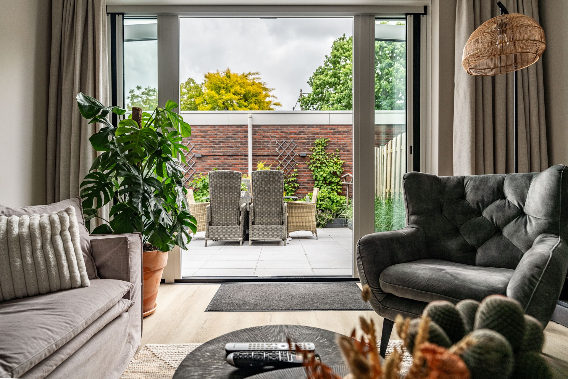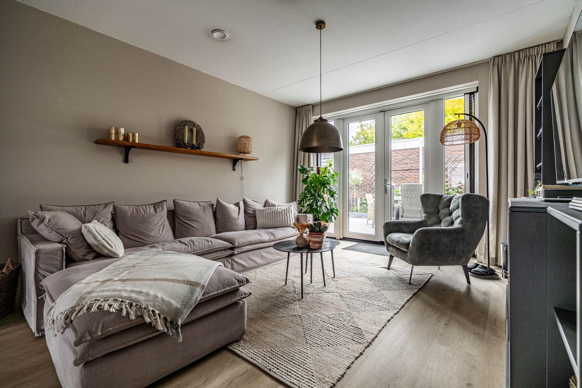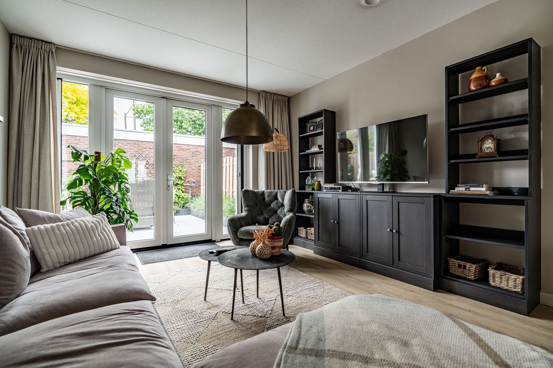 De lichte woonkamer ligt aan de tuinzijde en is een fijne plek om te ontspannen. Via de openslaande deuren loopt u zo de heerlijke achtertuin in — een ideale plek om te zitten, te genieten van de zon of te tuinieren. Helemaal achterin vindt u een ruime berging en een achterom.