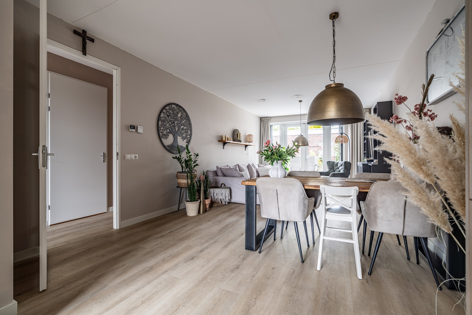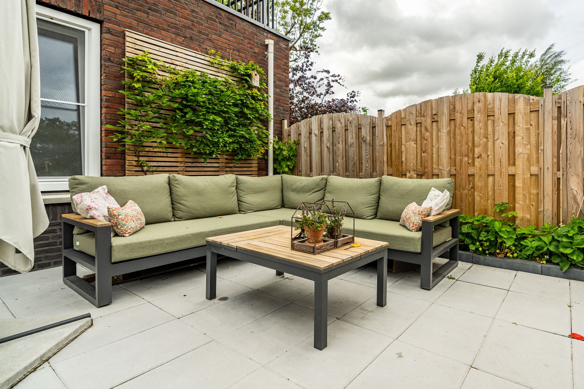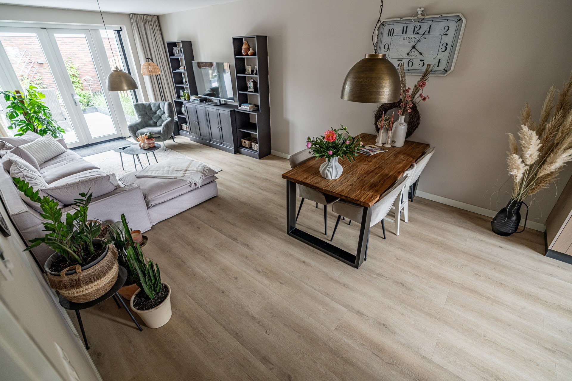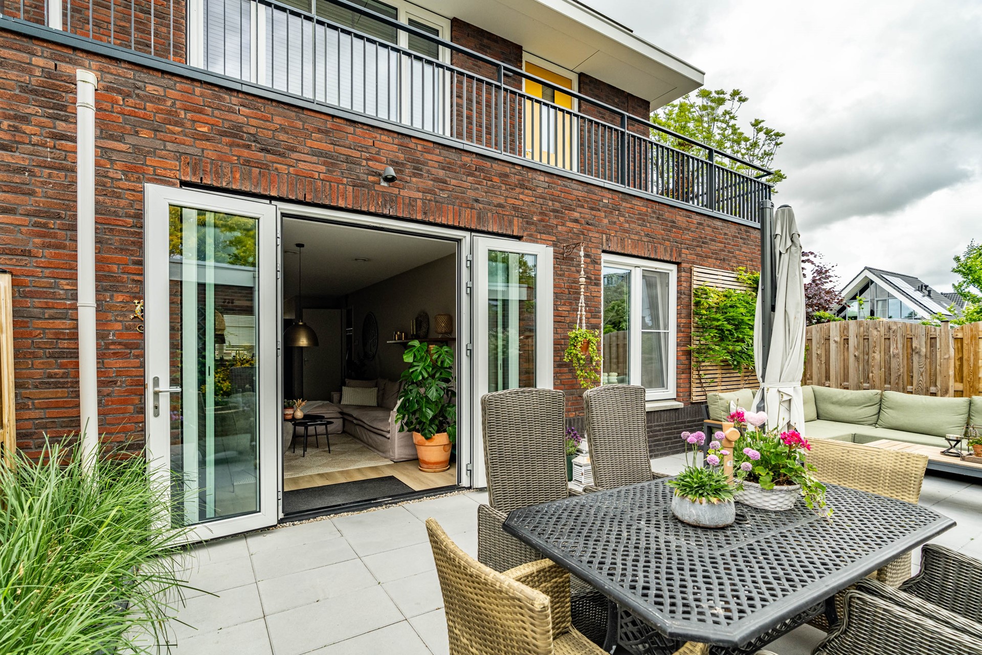 De lichte woonkamer ligt aan de tuinzijde en is een fijne plek om te ontspannen. Via de openslaande deuren loopt u zo de heerlijke achtertuin in — een ideale plek om te zitten, te genieten van de zon of te tuinieren. Helemaal achterin vindt u een ruime berging en een achterom.