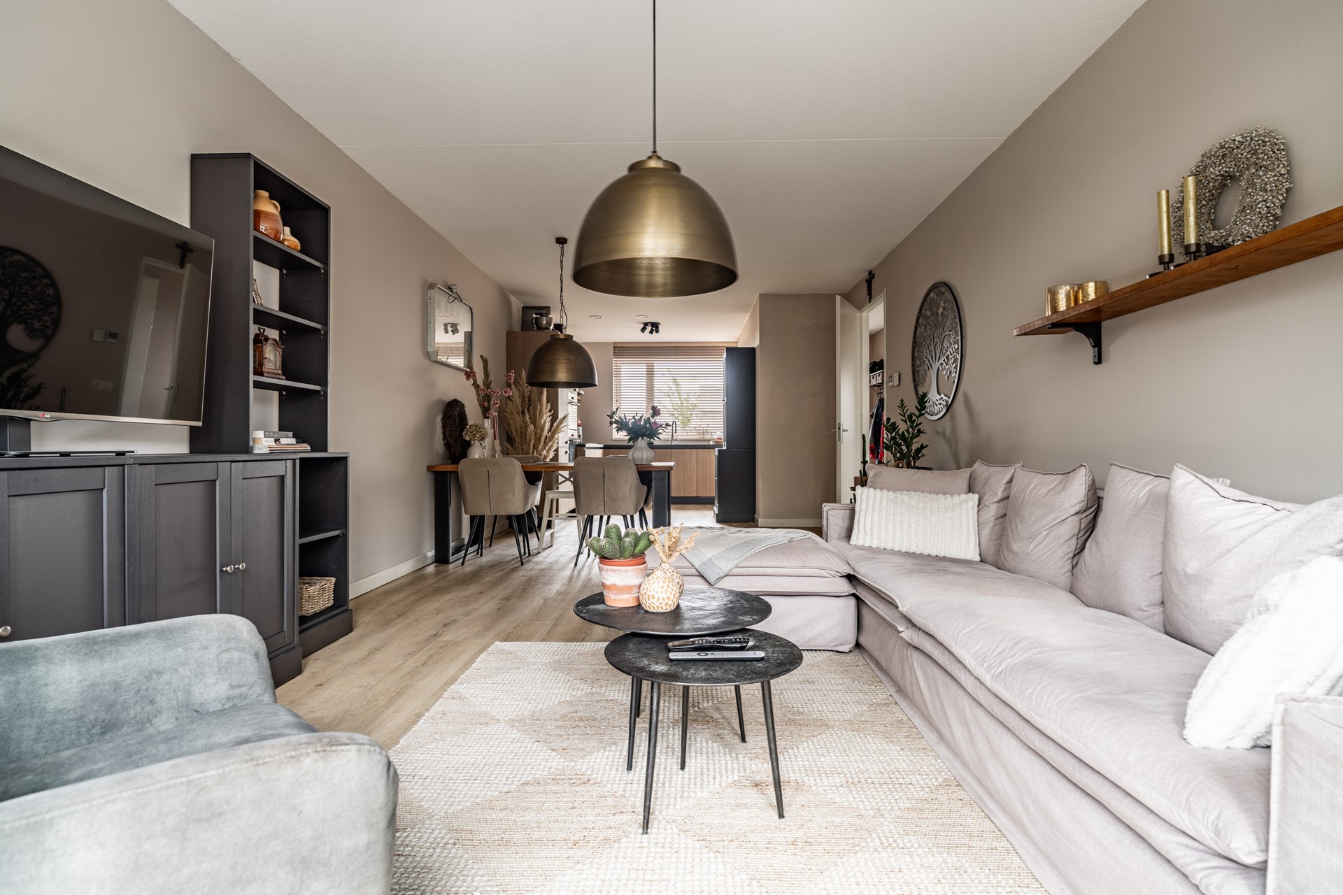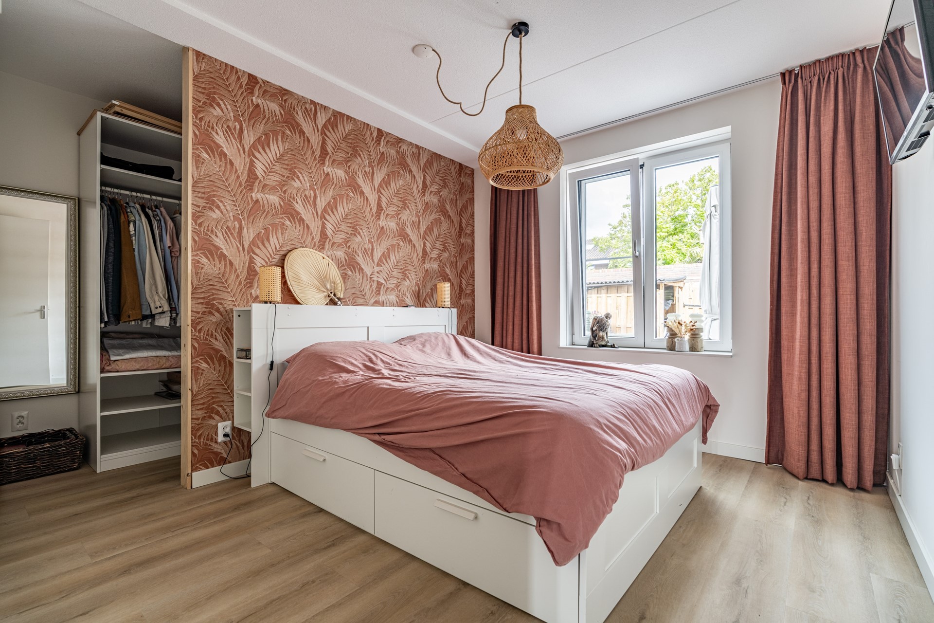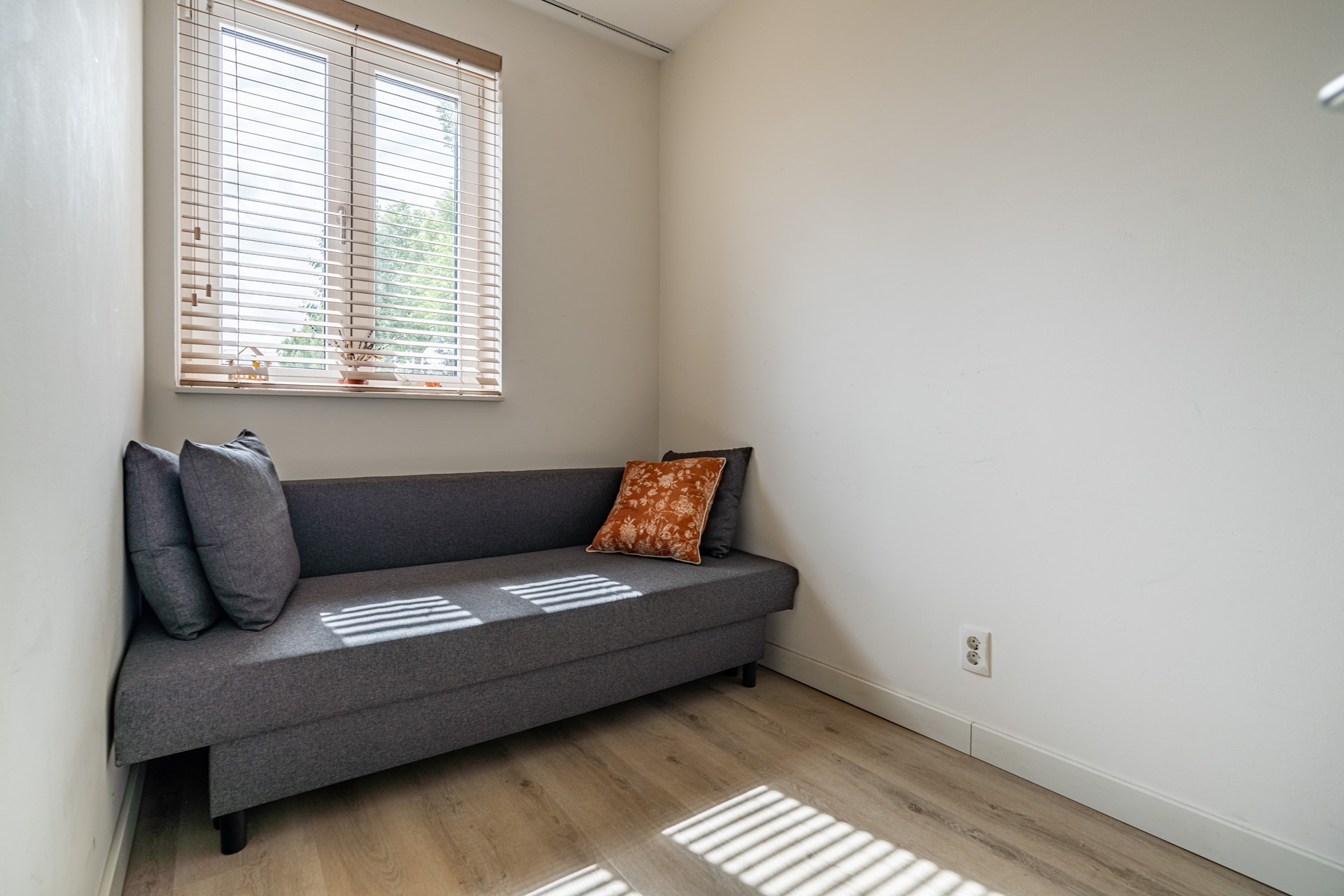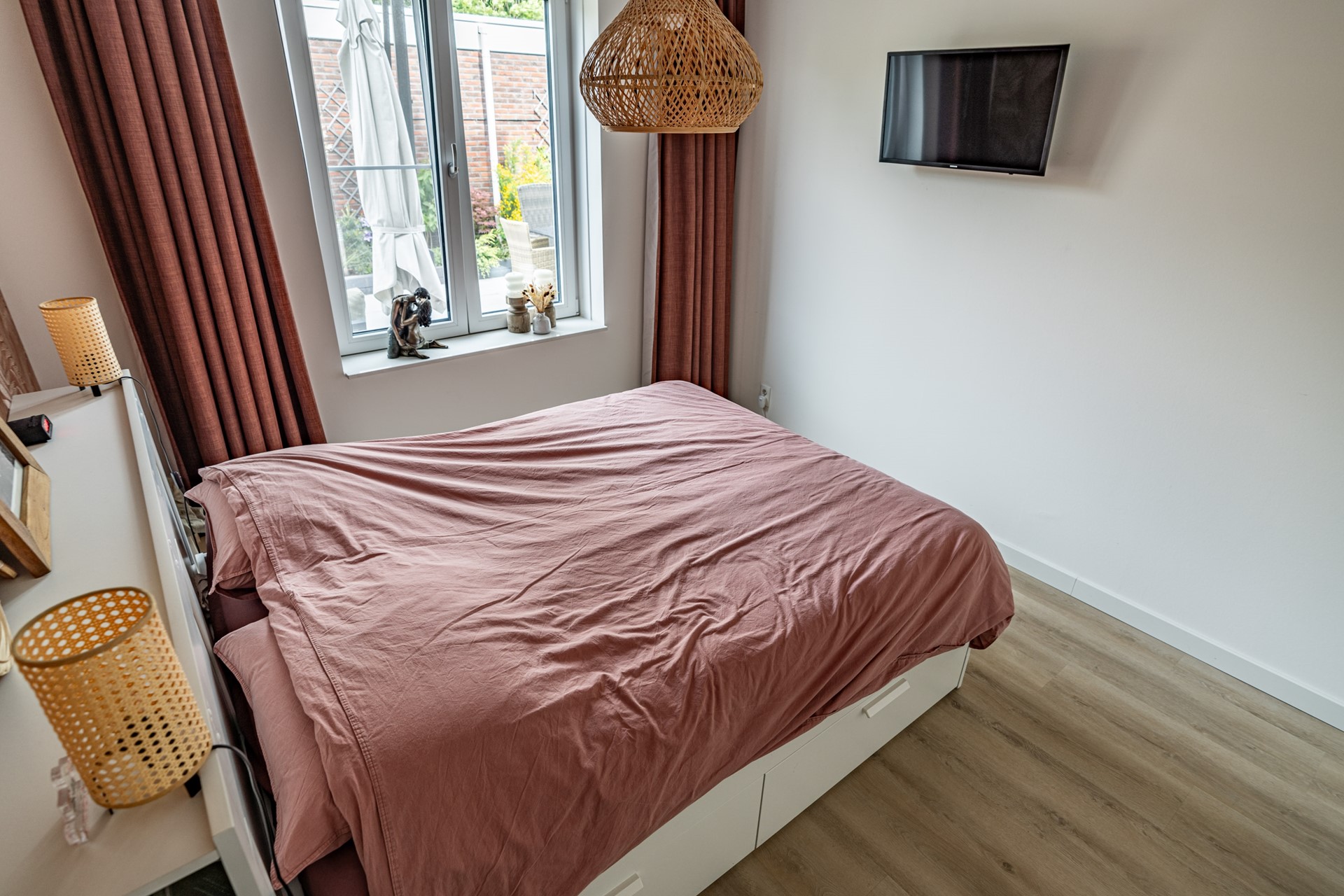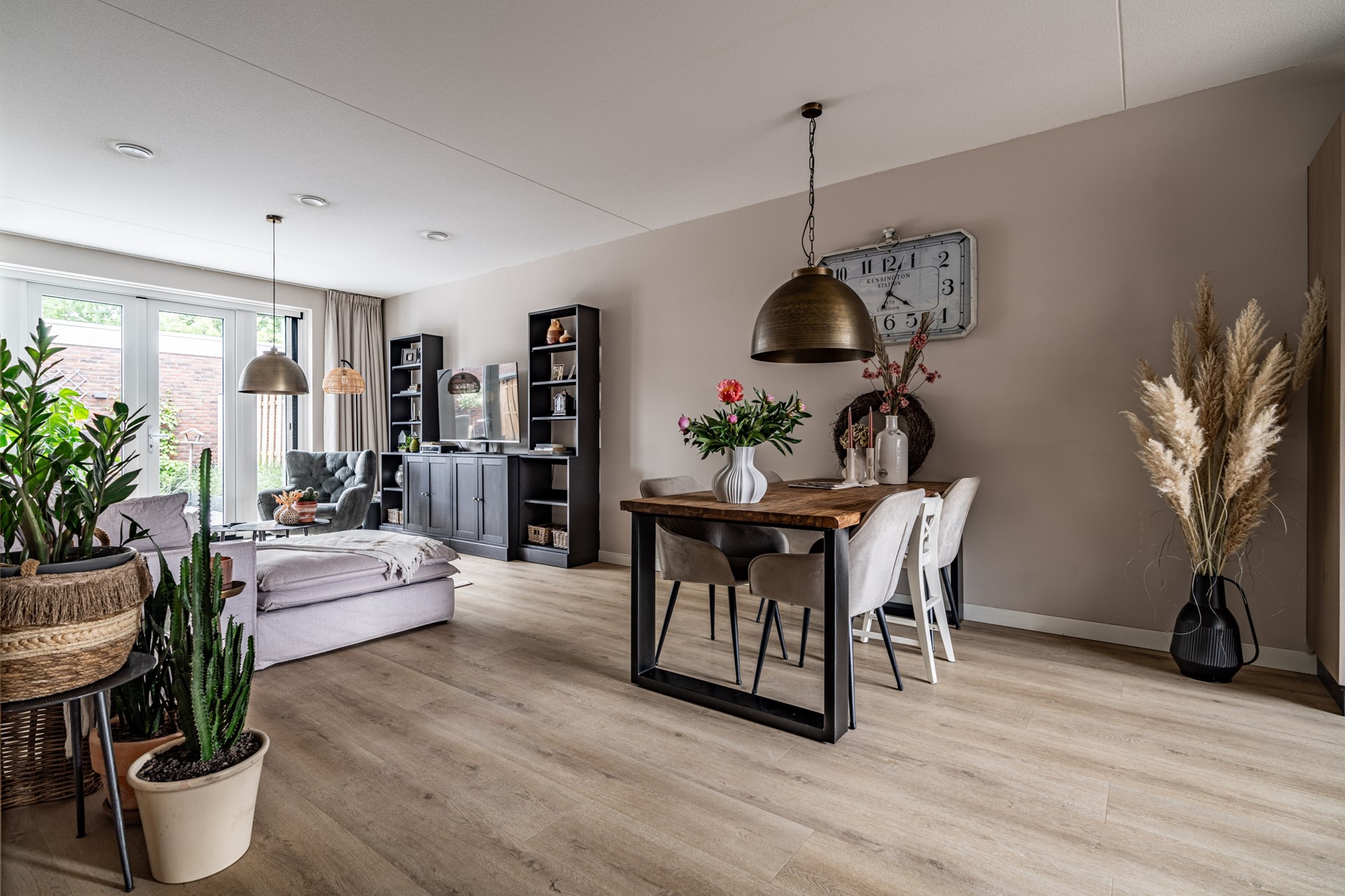 De lichte woonkamer ligt aan de tuinzijde en is een fijne plek om te ontspannen. Via de openslaande deuren loopt u zo de heerlijke achtertuin in — een ideale plek om te zitten, te genieten van de zon of te tuinieren. Helemaal achterin vindt u een ruime berging en een achterom.