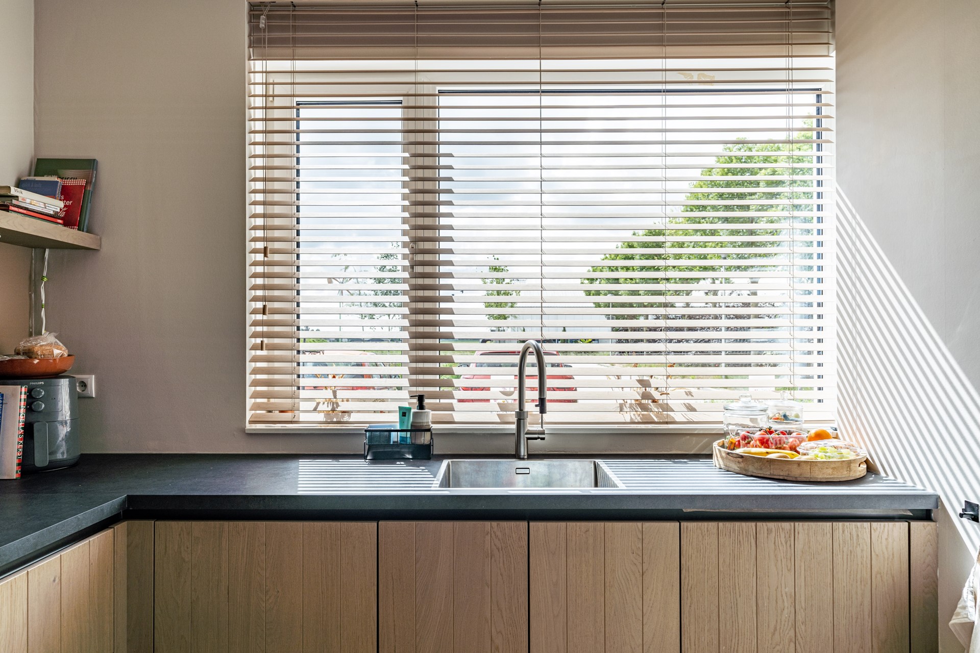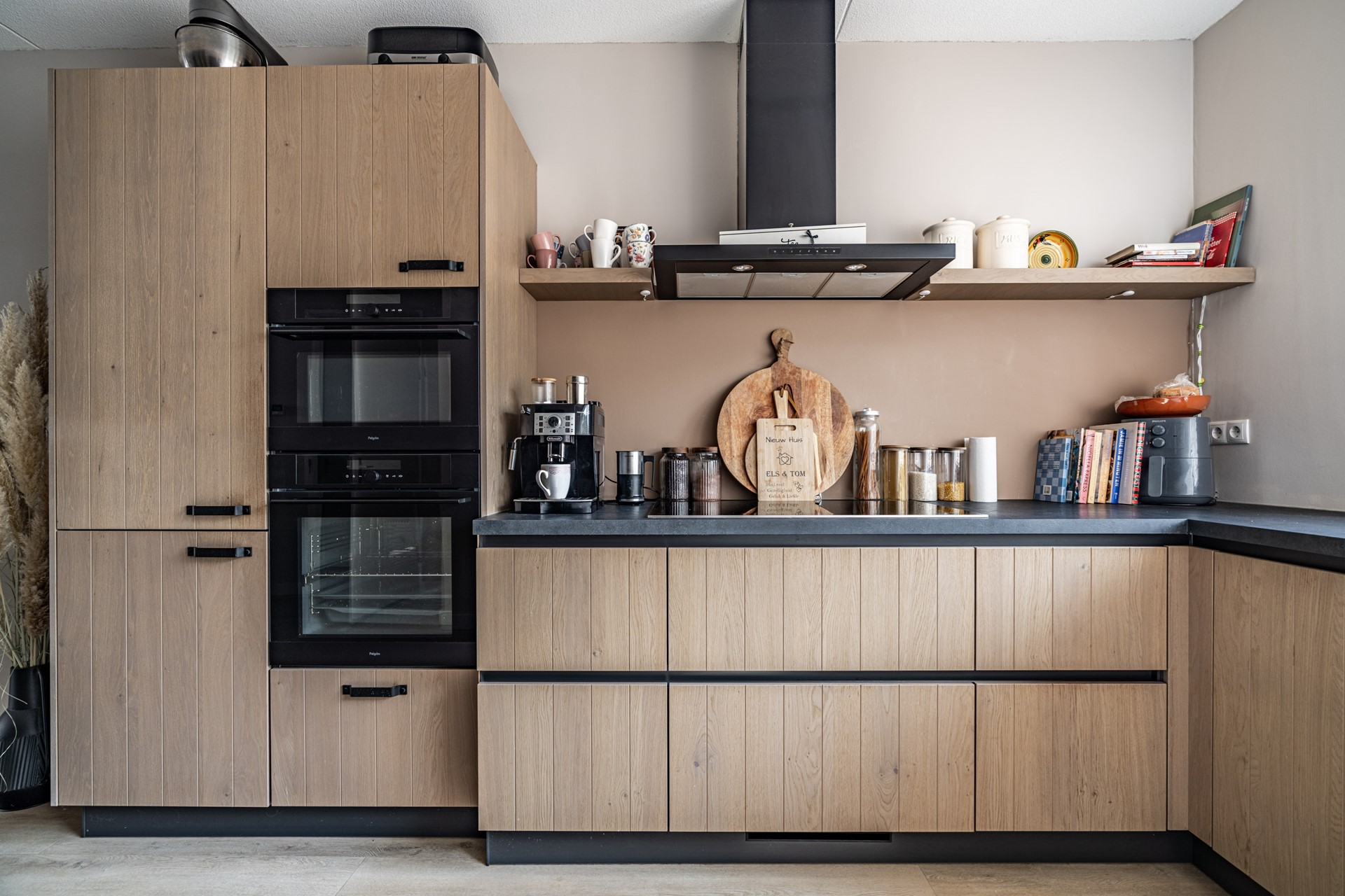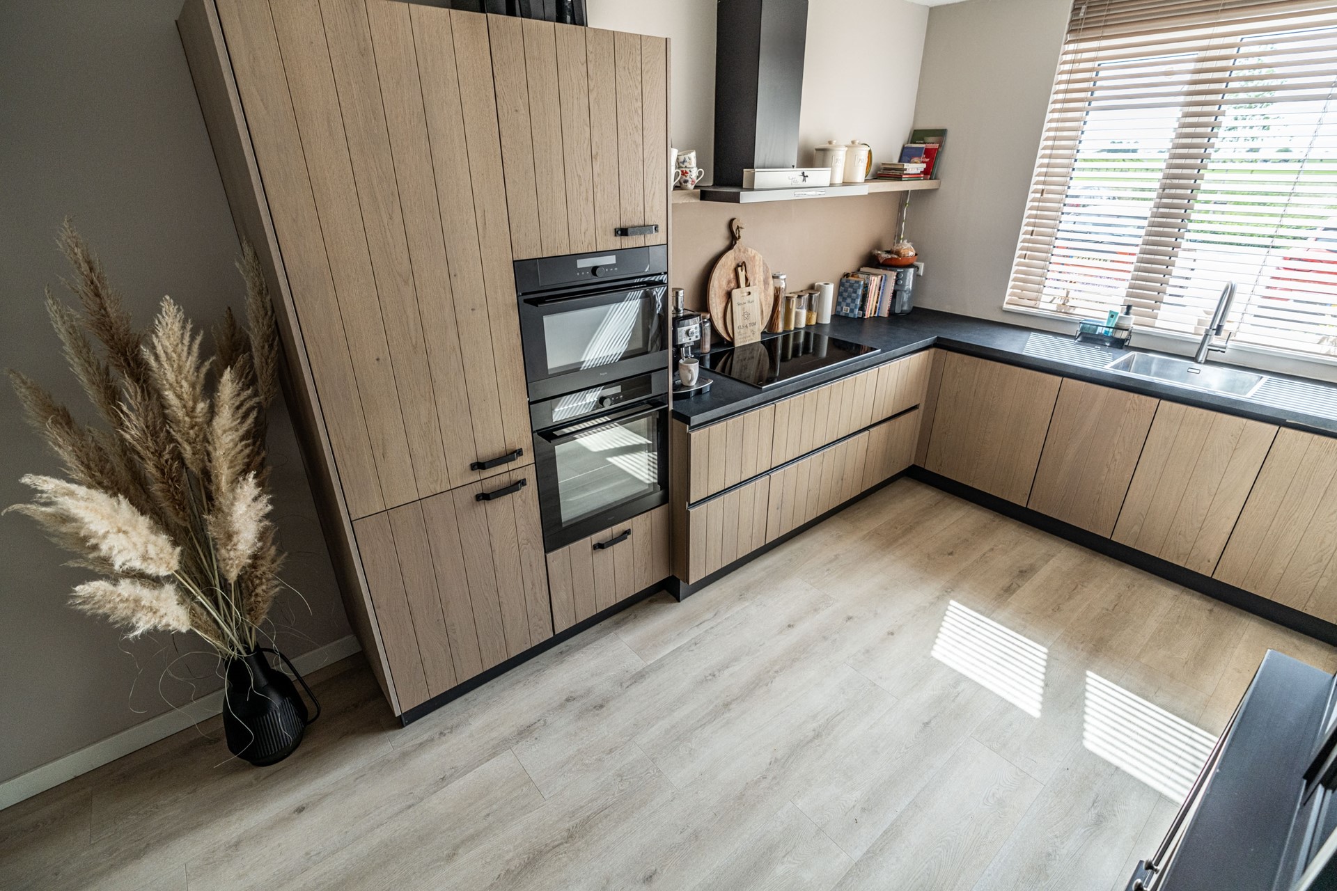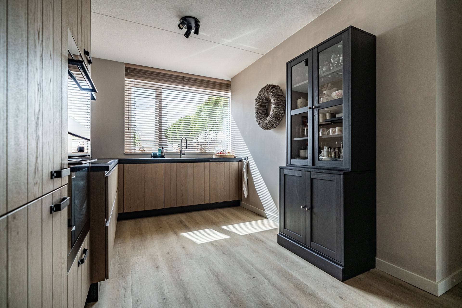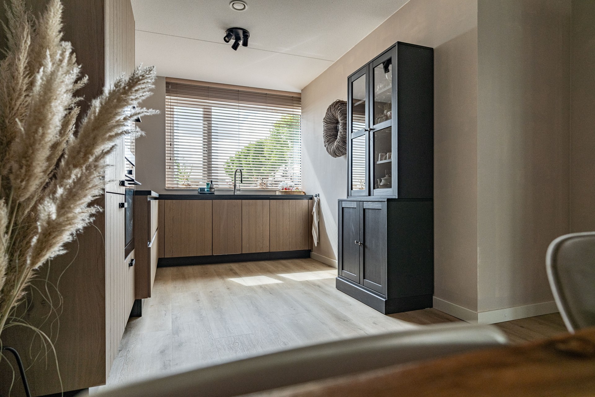 De ruime, netjes aangelegde voortuin leidt naar de voordeur van het appartement. Aan de voorzijde bevindt zich de moderne keuken, uitgevoerd in hoogwaardige materialen en uitgerust met alles wat u van een recente keuken (slechts 2 jaar oud!) mag verwachten: inductiekookplaat, oven met magnetronfunctie, vaatwasser, Quooker en een koel-vriescombinatie.