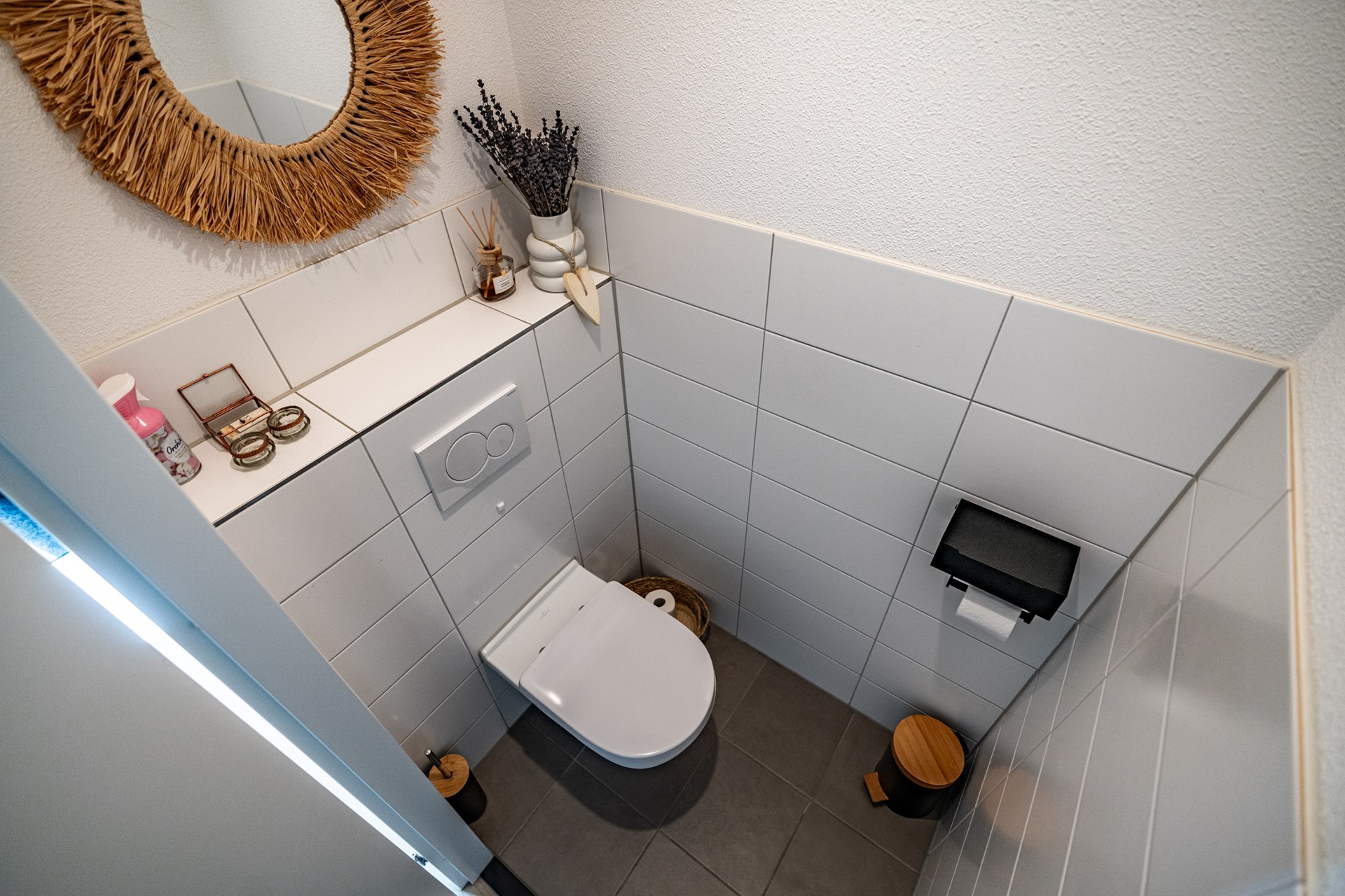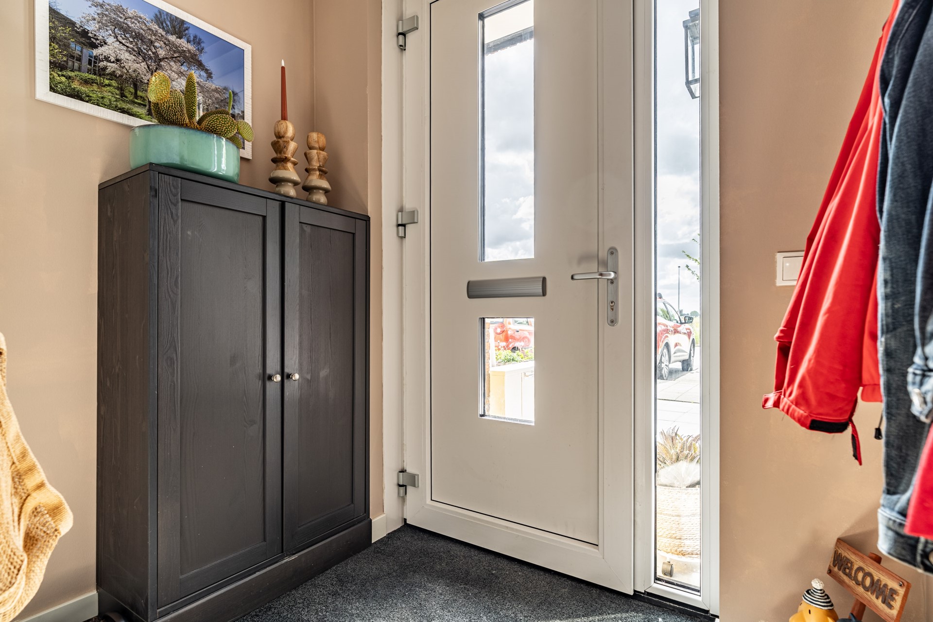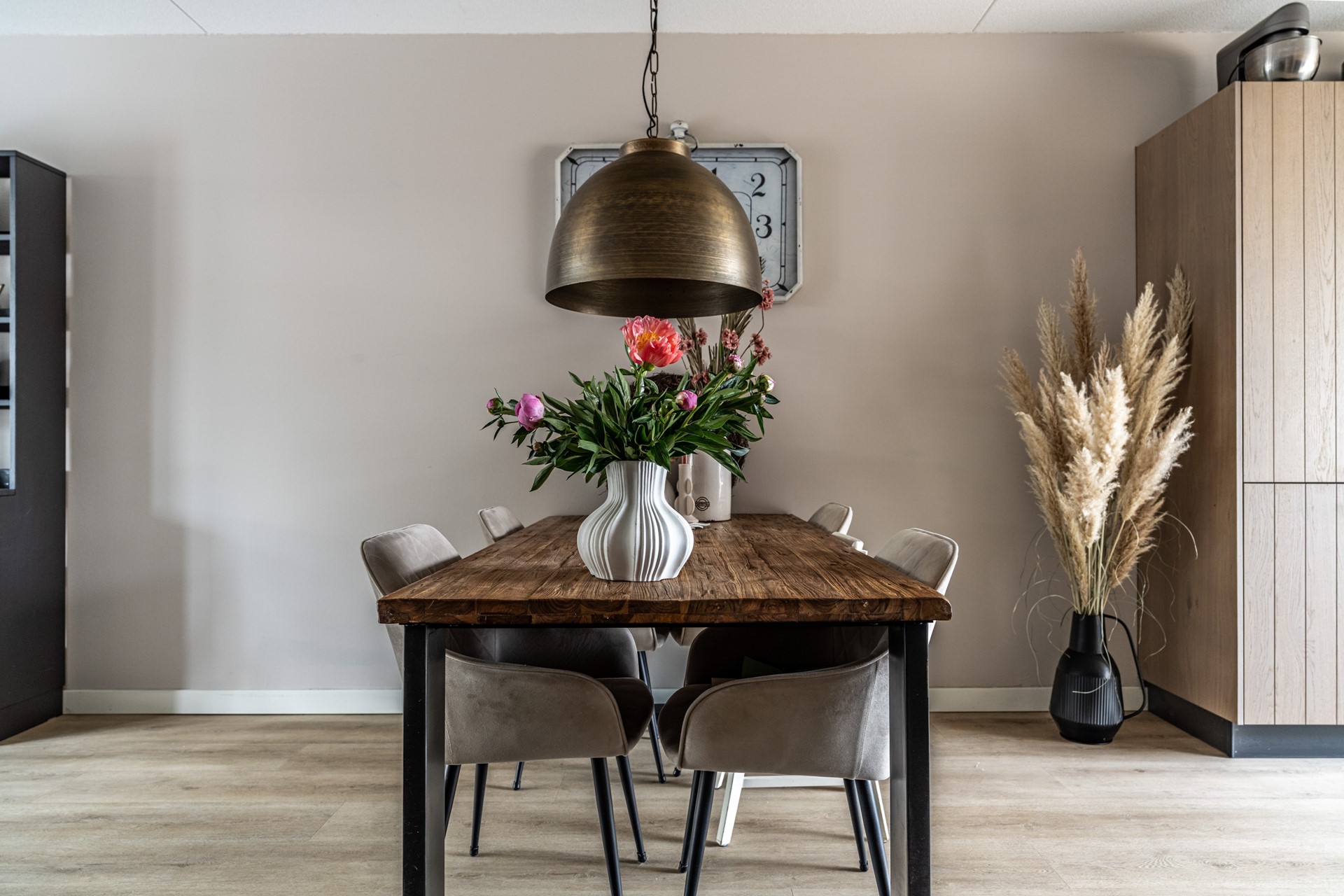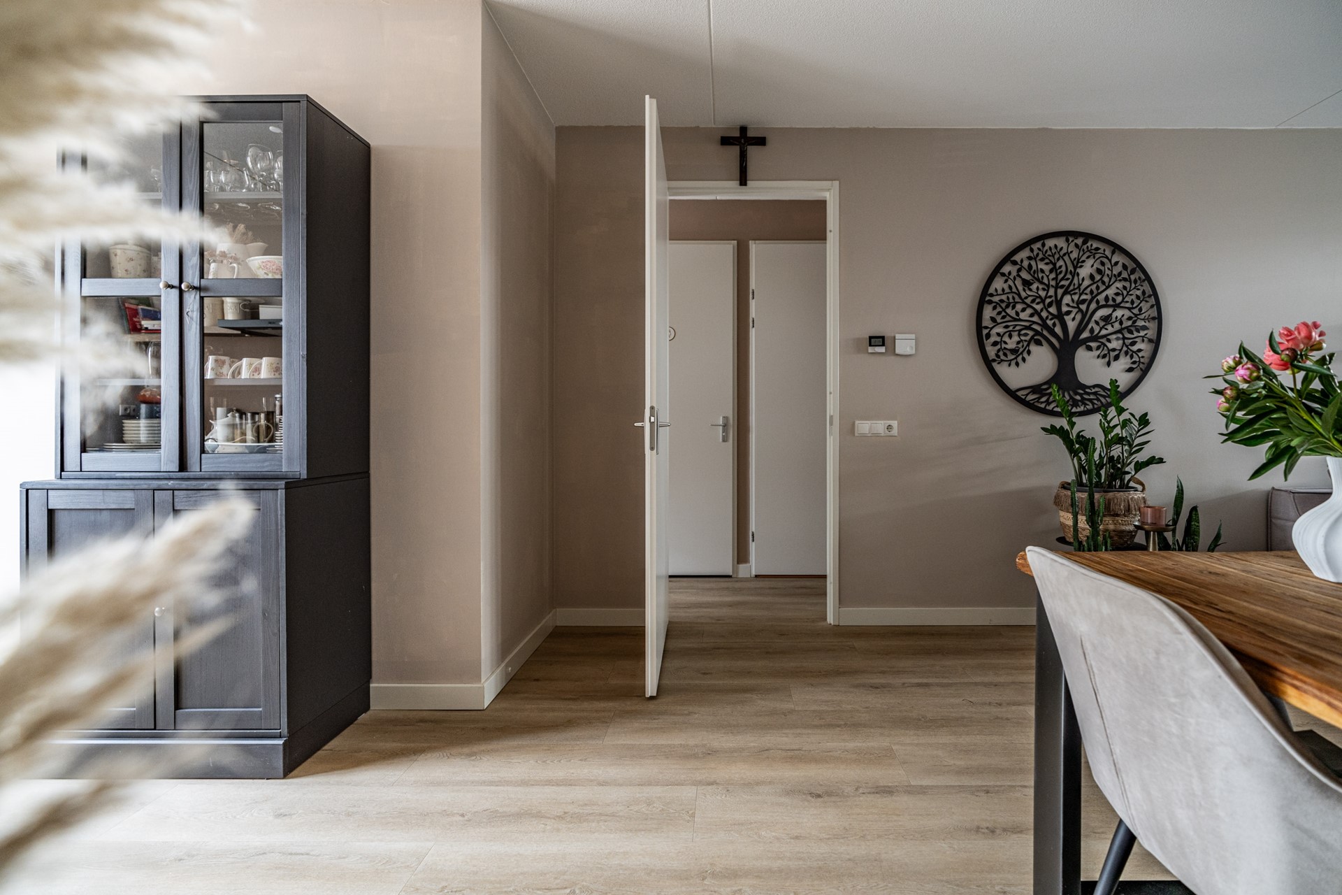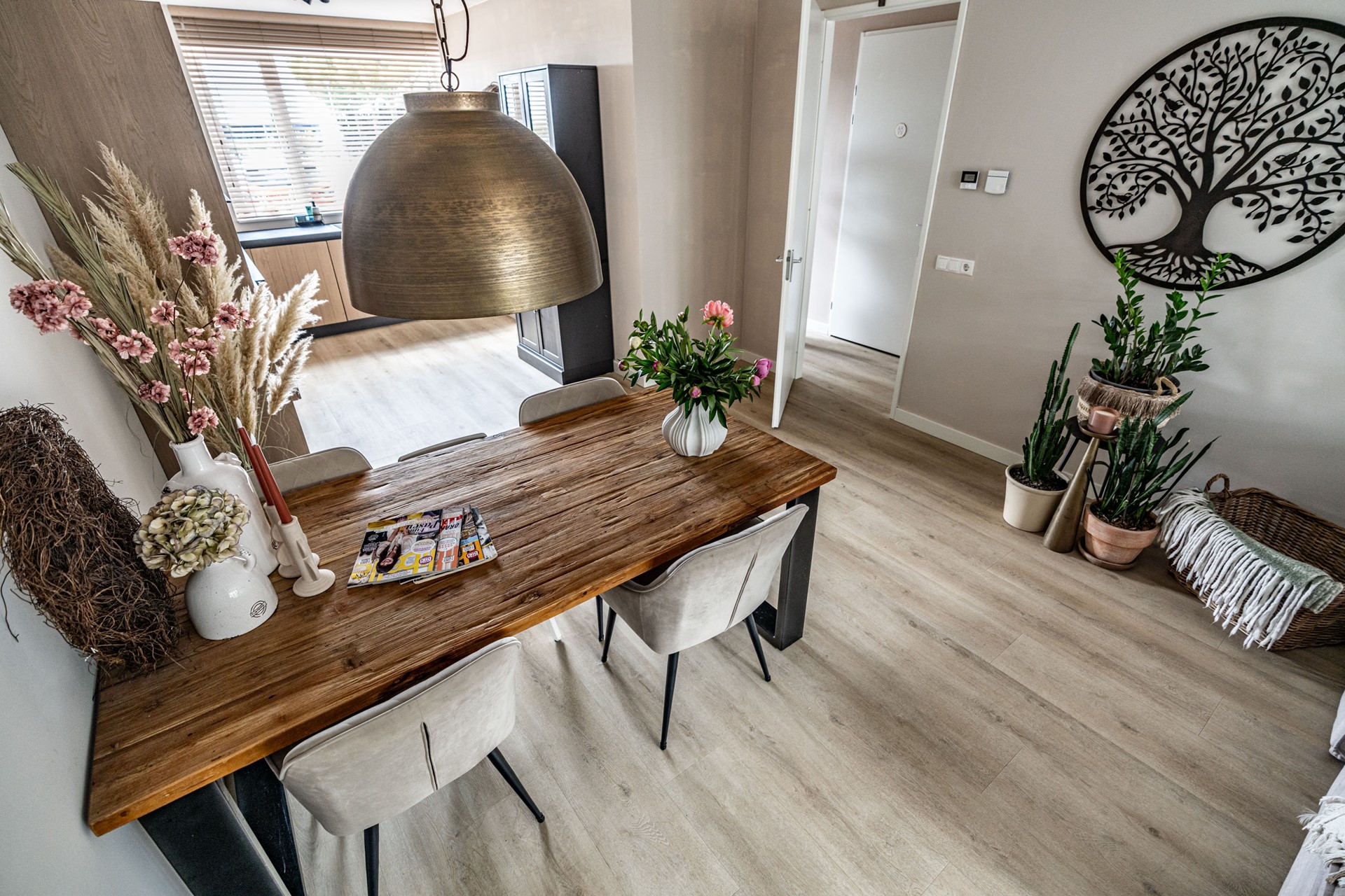 De ruime, netjes aangelegde voortuin leidt naar de voordeur van het appartement. Aan de voorzijde bevindt zich de moderne keuken, uitgevoerd in hoogwaardige materialen en uitgerust met alles wat u van een recente keuken (slechts 2 jaar oud!) mag verwachten: inductiekookplaat, oven met magnetronfunctie, vaatwasser, Quooker en een koel-vriescombinatie.