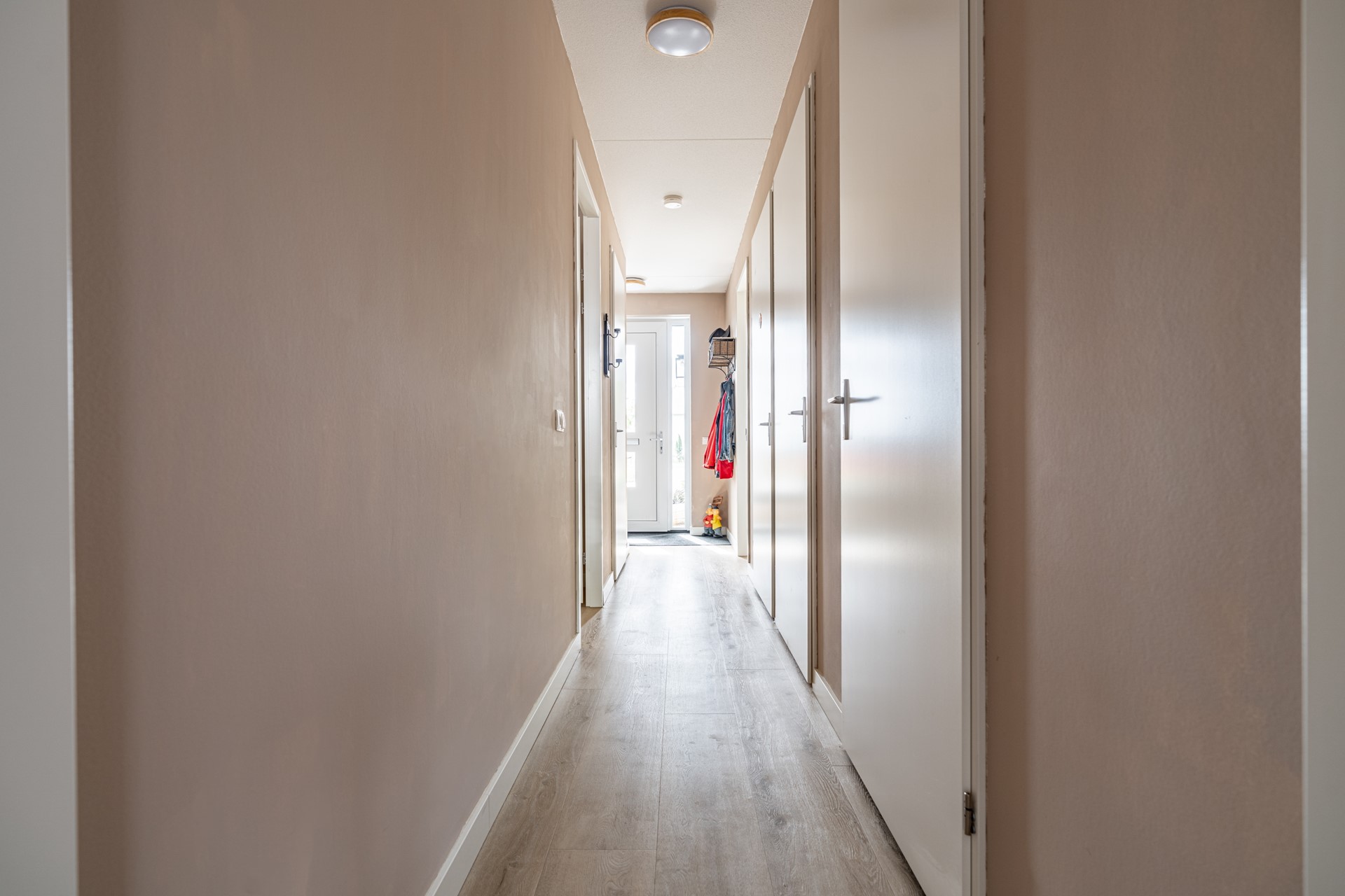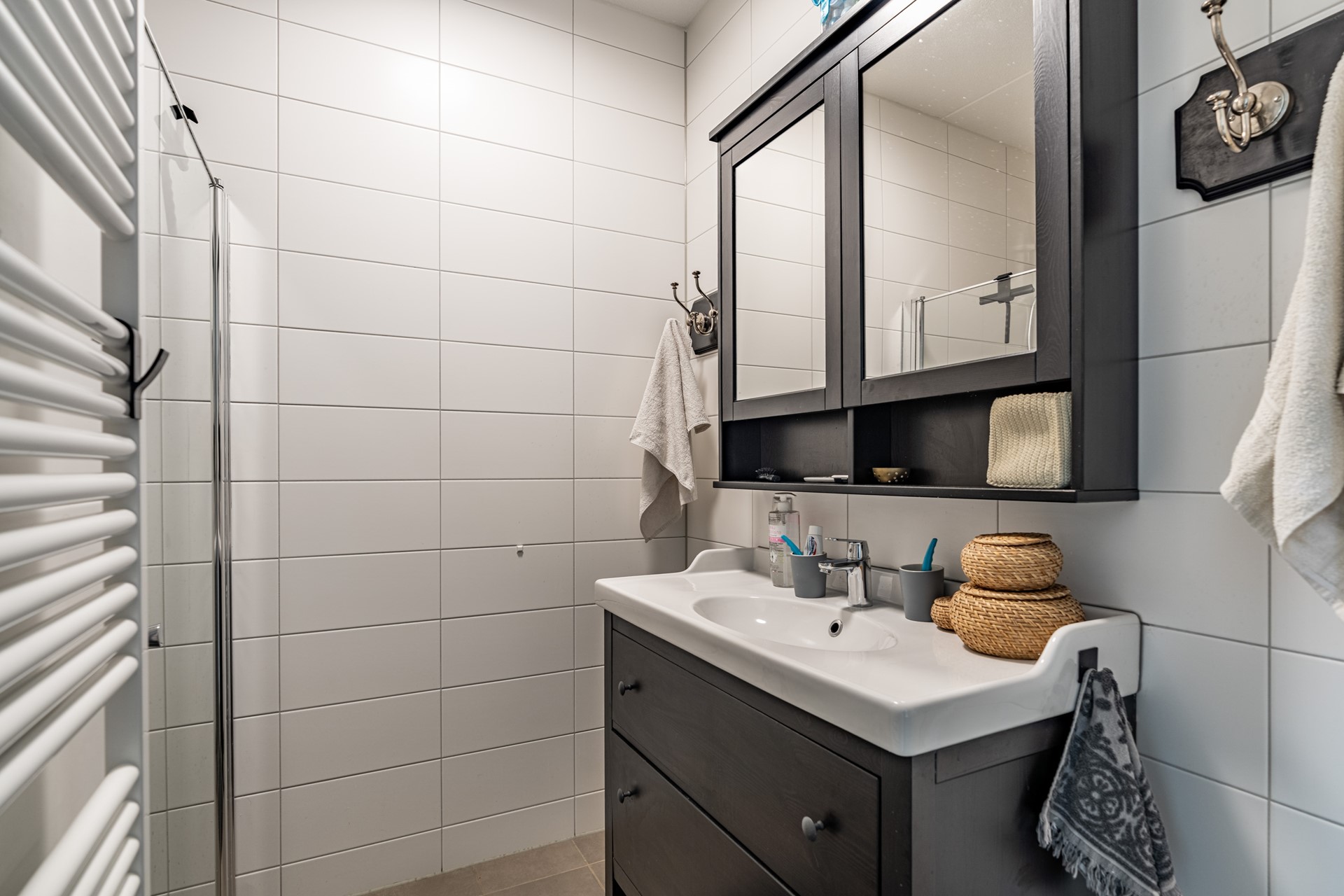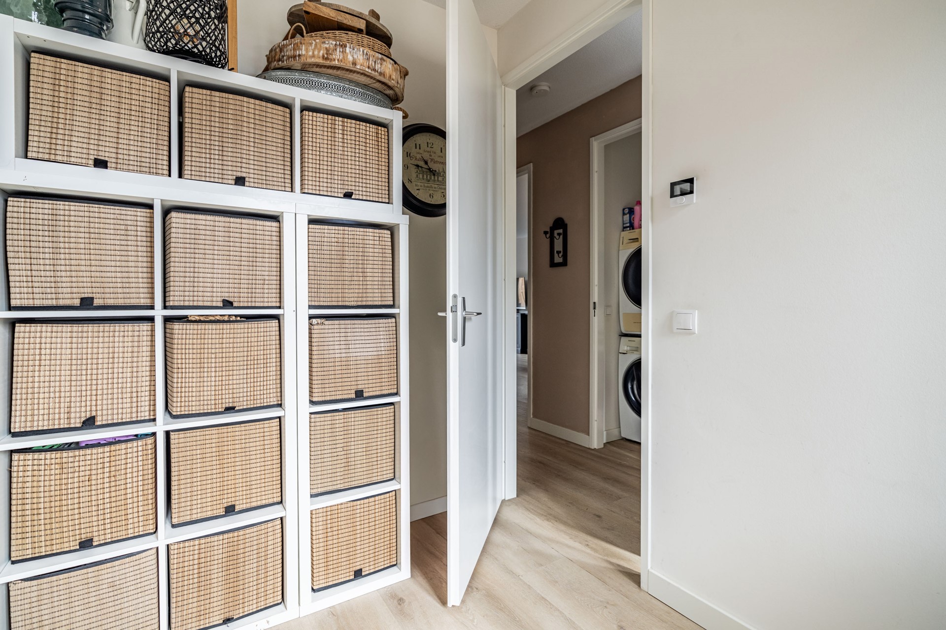 Het appartement beschikt over twee slaapkamers, waarvan één aan de voorzijde en één aan de achterzijde. De volledig betegelde badkamer is voorzien van een comfortabele inloopdouche en een stijlvol wastafelmeubel. Daarnaast zijn via de centrale hal het separate toilet, de wasruimte en de technische ruimte (met volop bergruimte) bereikbaar.