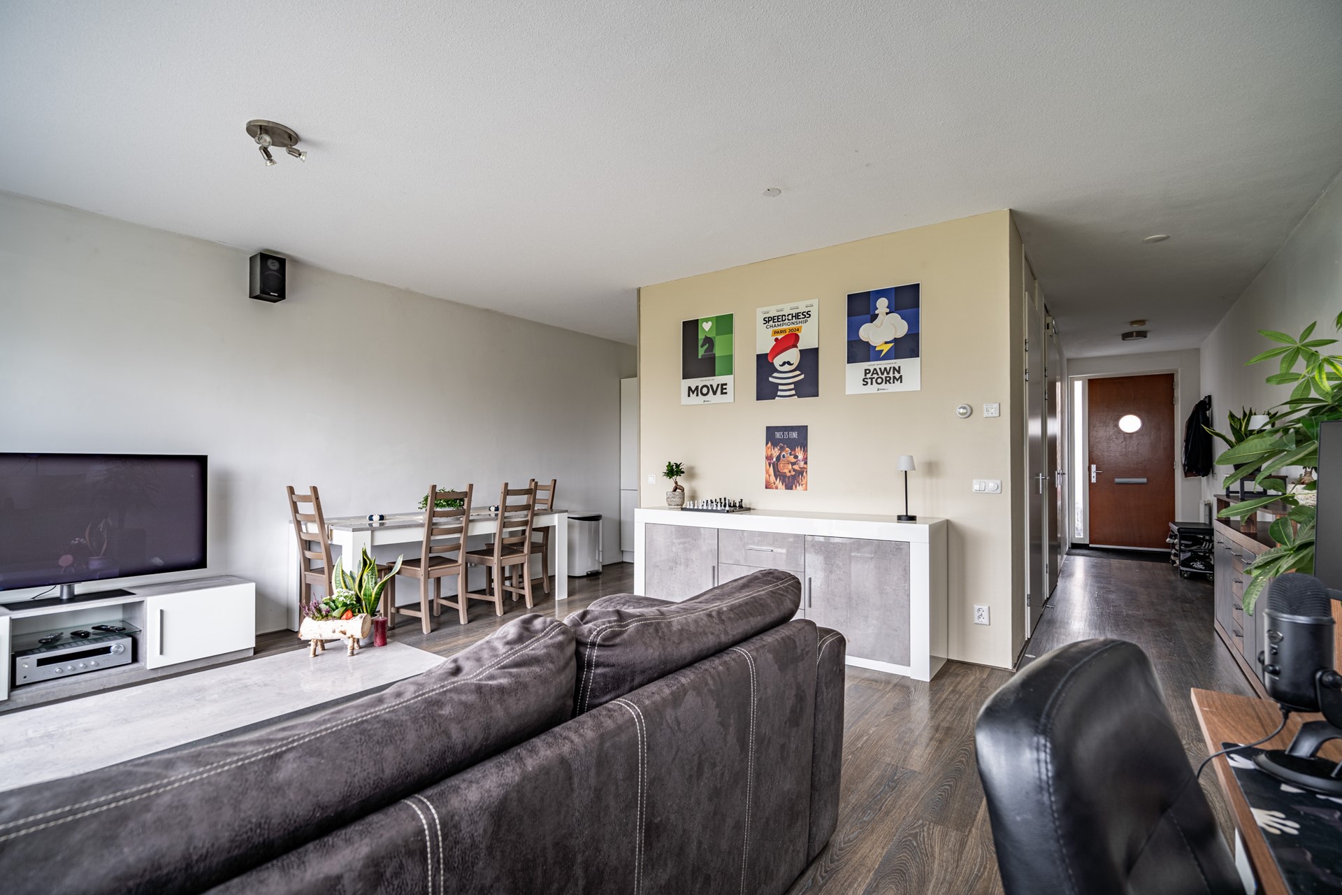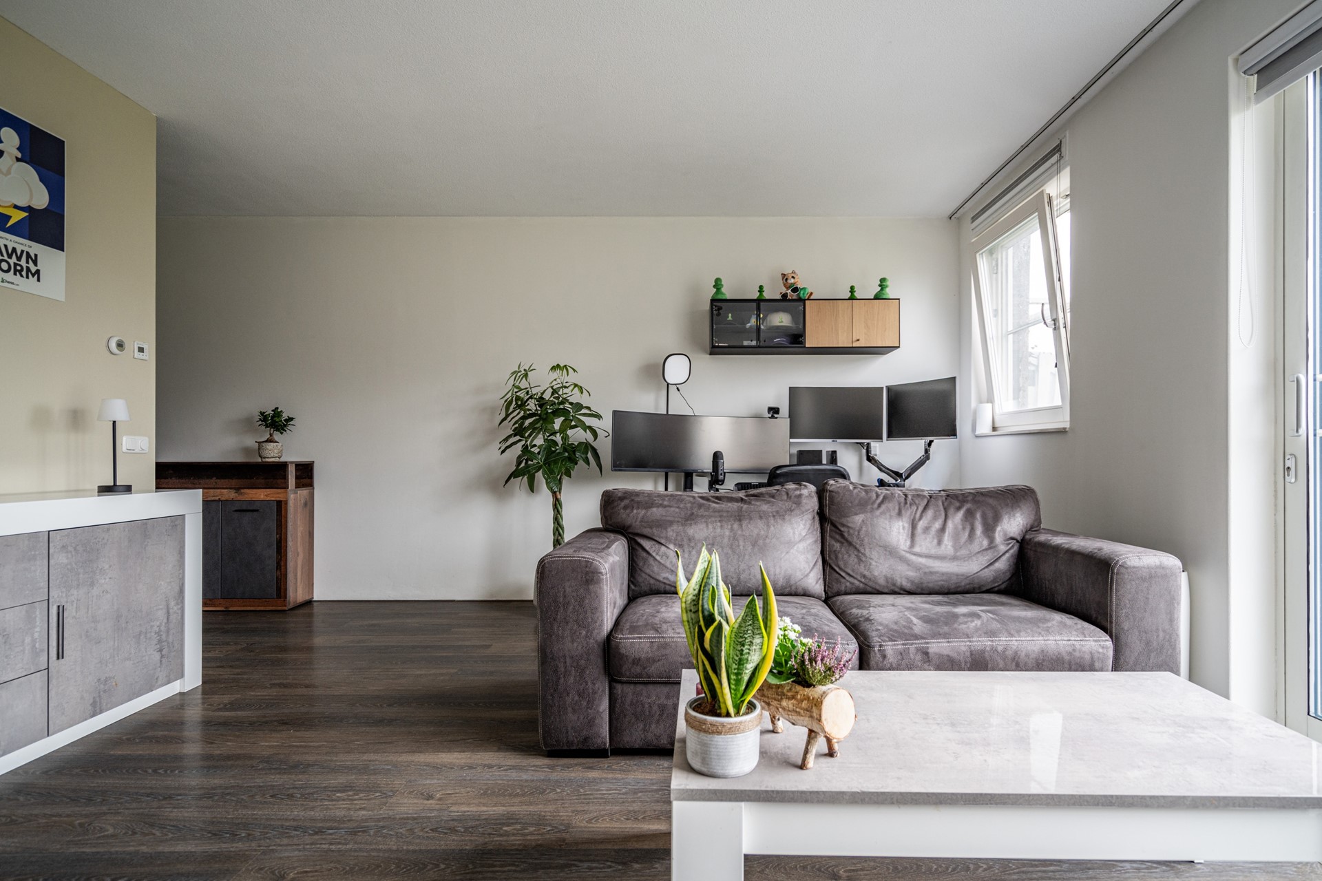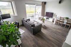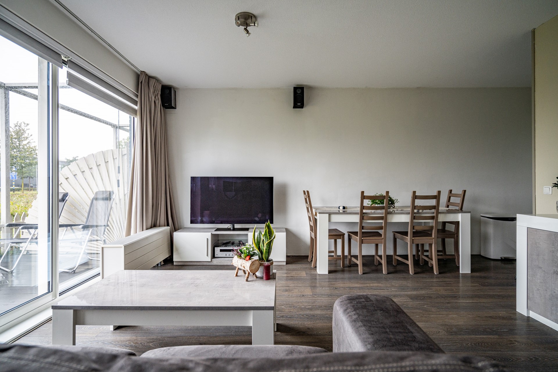 De woonkamer is ruim, licht en voorzien van een laminaat. Dankzij de schuifpui loop je zo het zonnige terras op, met vrij uitzicht over een groene strook – een ideale plek om te ontspannen.