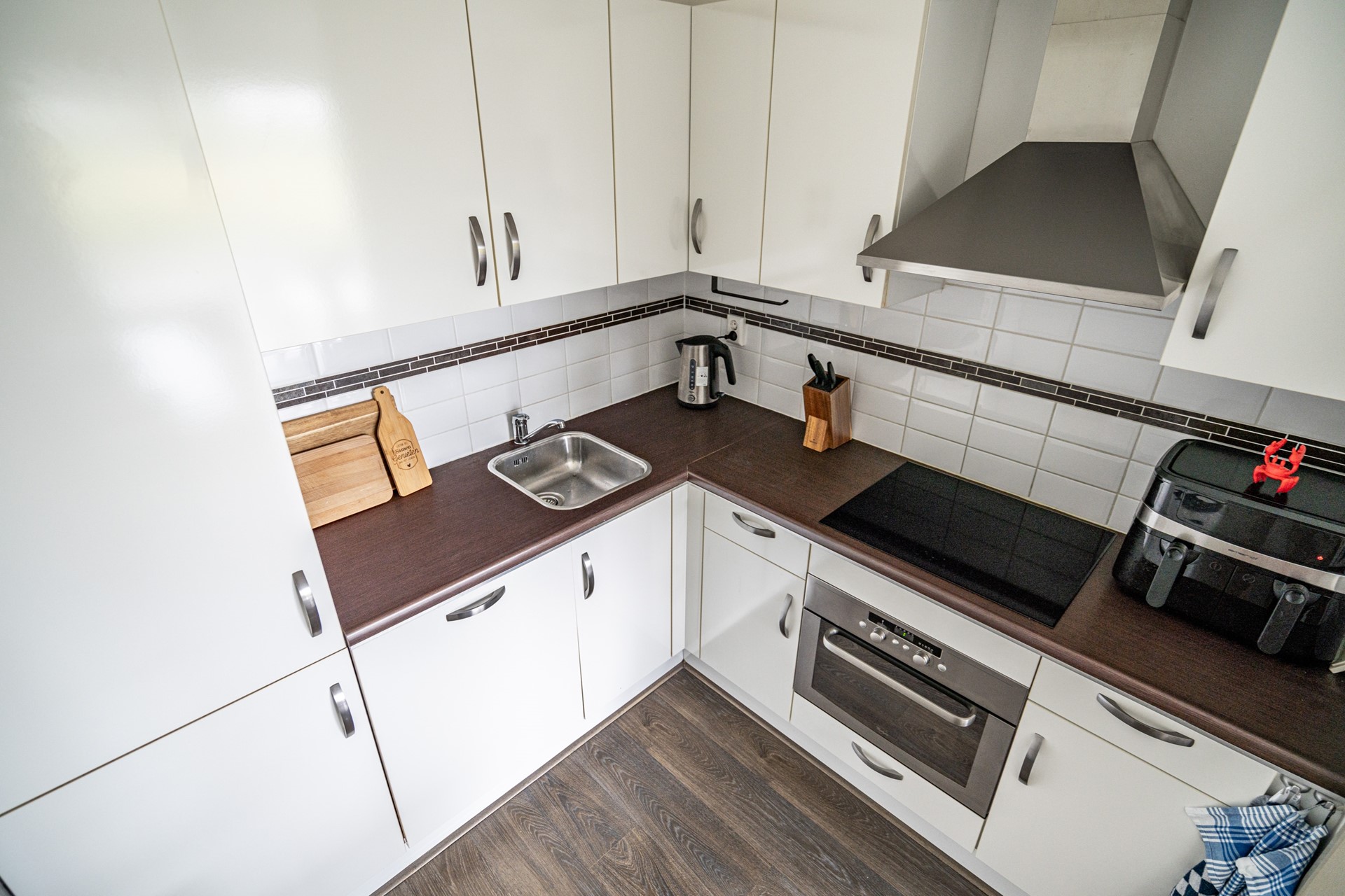 De keuken met een hoekopstelling beschikt over diverse inbouwapparatuur, waaronder een inductiekookplaat, combi-oven en vaatwasser – perfect voor wie graag kookt.