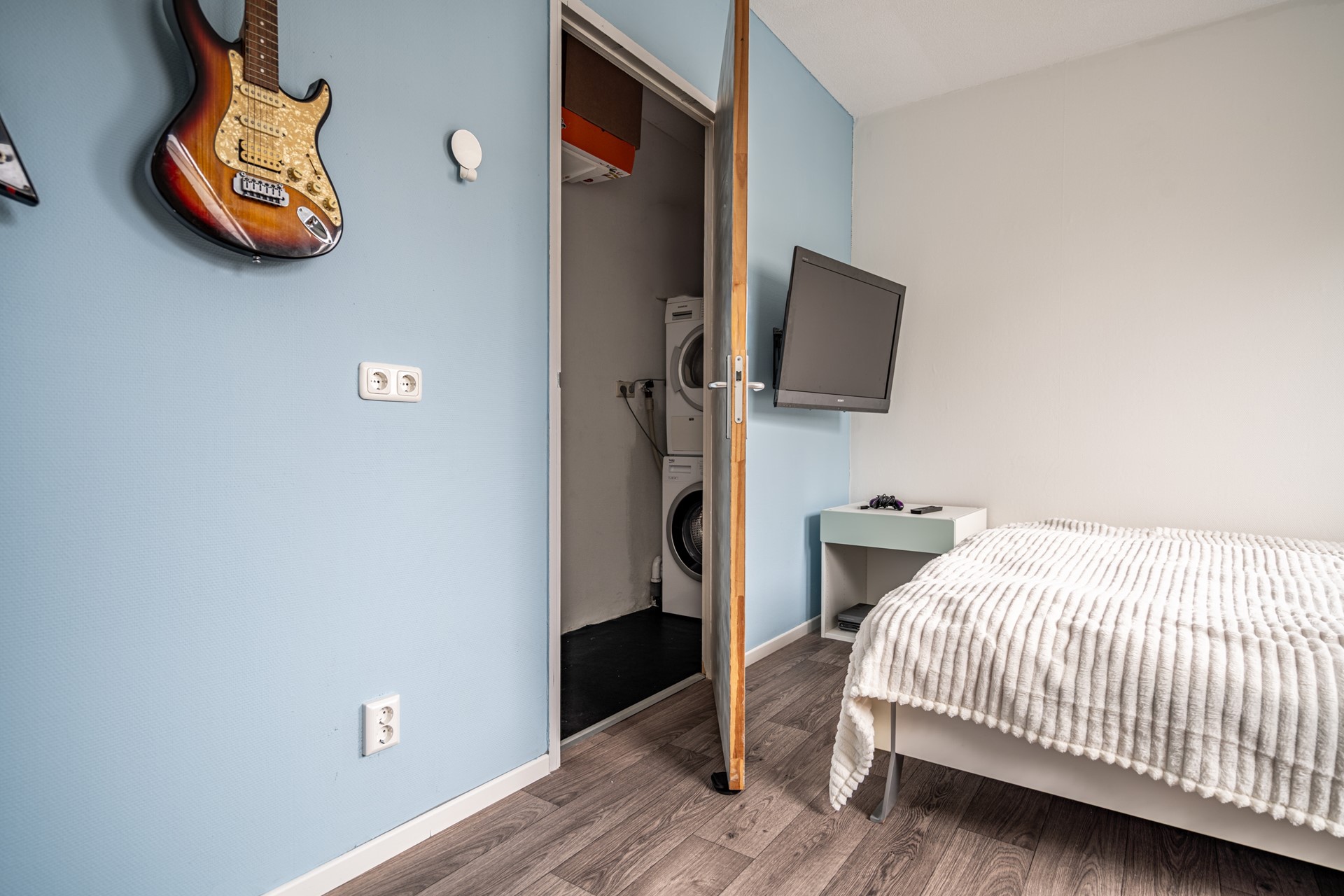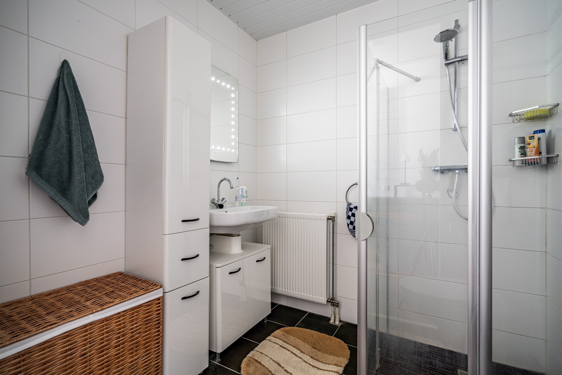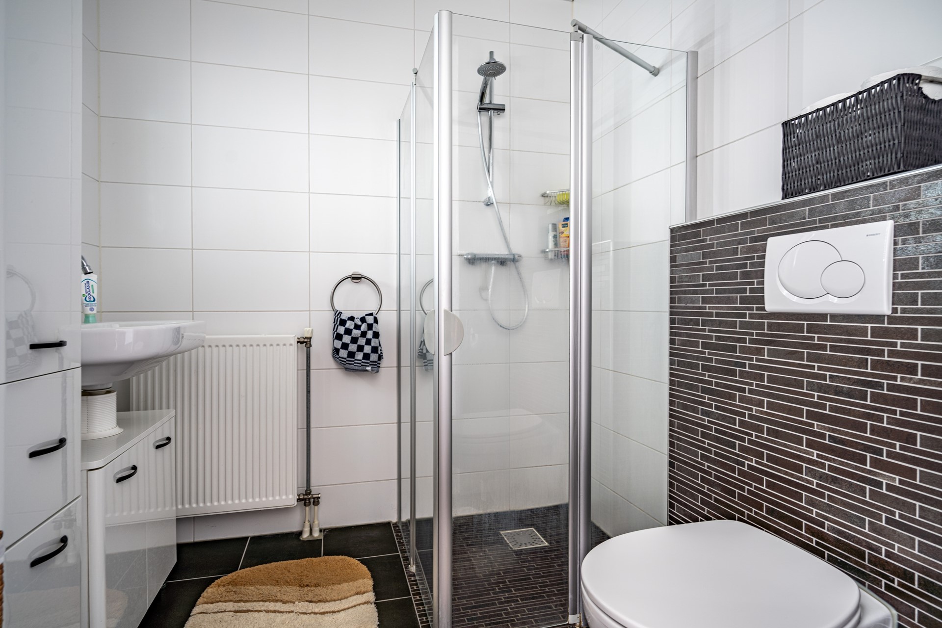 Aan de voorzijde vind je de ruime slaapkamer, geschikt voor een tweepersoonsbed en kledingkast. De moderne badkamer is volledig betegeld en uitgerust met een douche met glazen wand, hangend toilet, wastafel. De aansluitingen voor wasmachine en droger zitten in een aparte ruimte, toegankelijk vanuit de slaapkamer waar ook de CV-installatie (2009) in zit.
