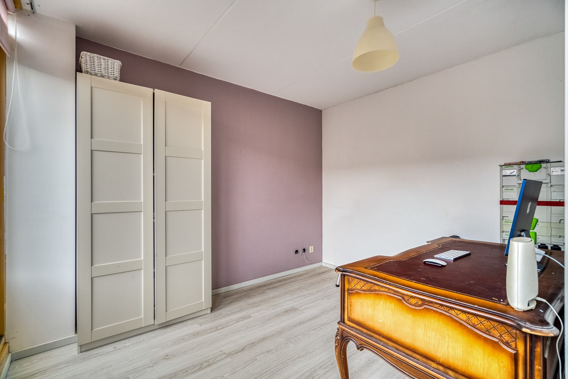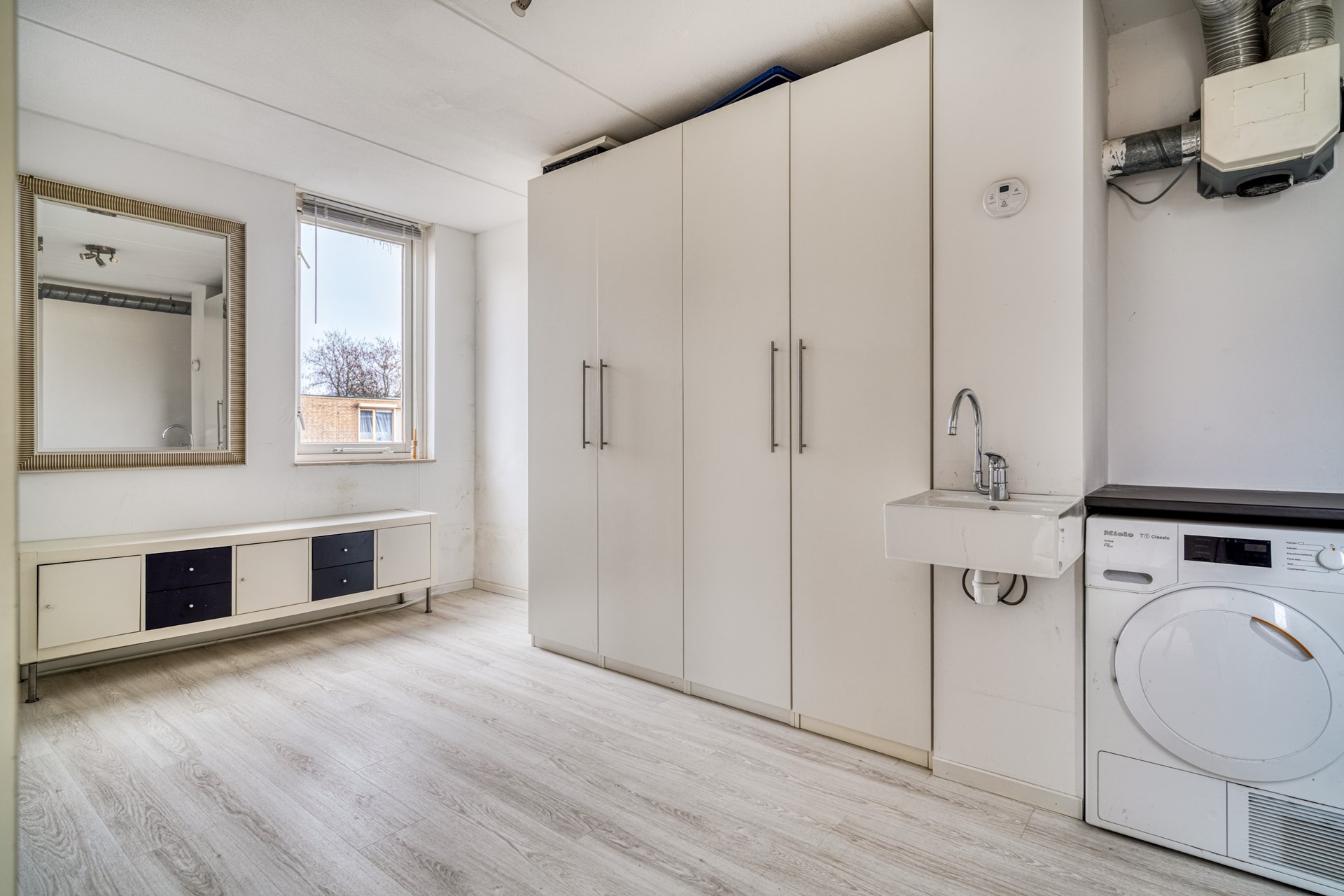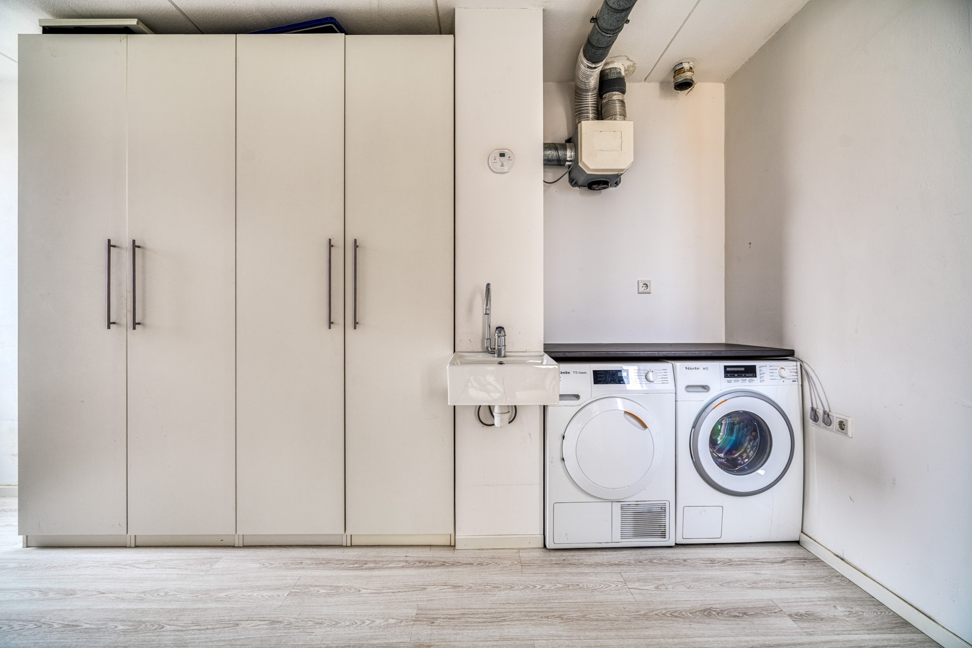 Ruime vierde slaapkamer met vaste kast. Overloop met aansluiting voor wasmachine en warmtepompdroger. De cv-combiketel is netjes weggewerkt in een kastenwand.