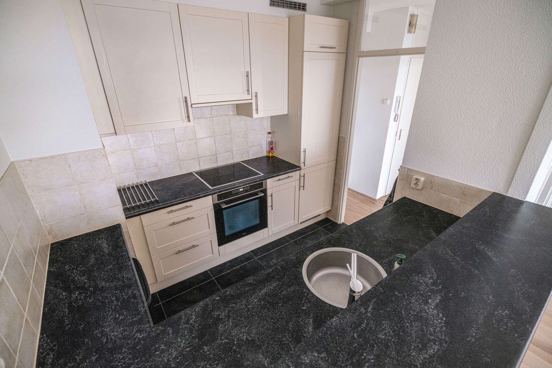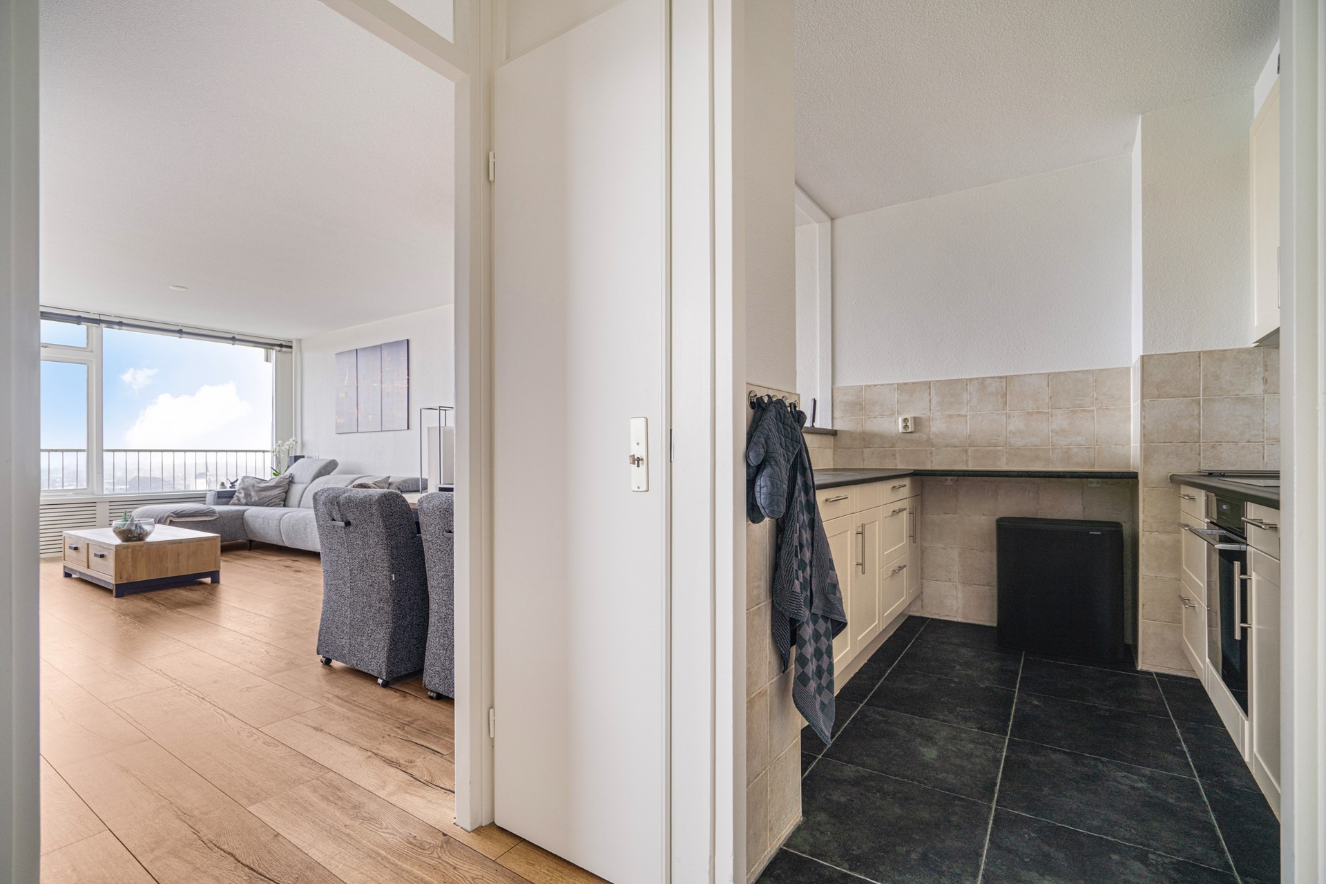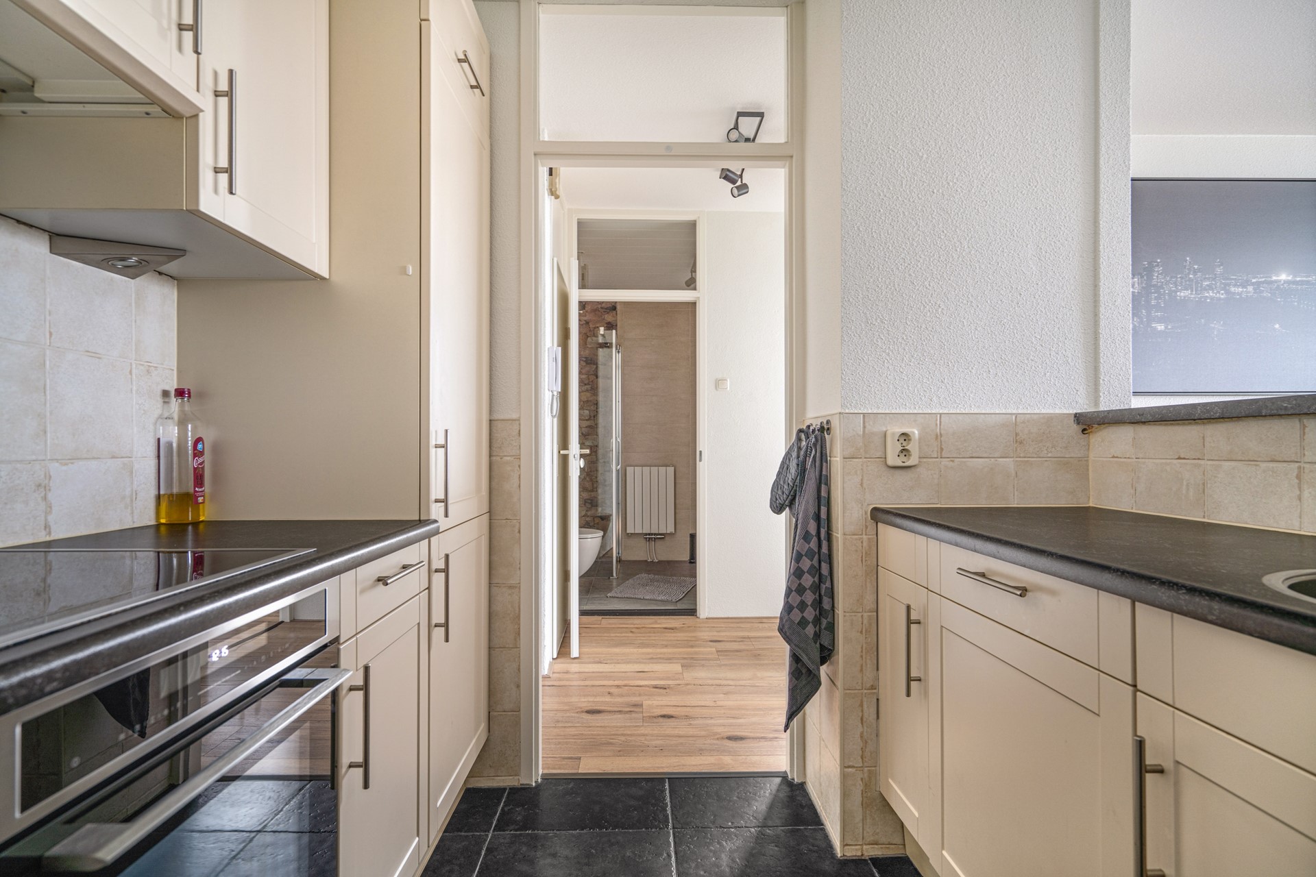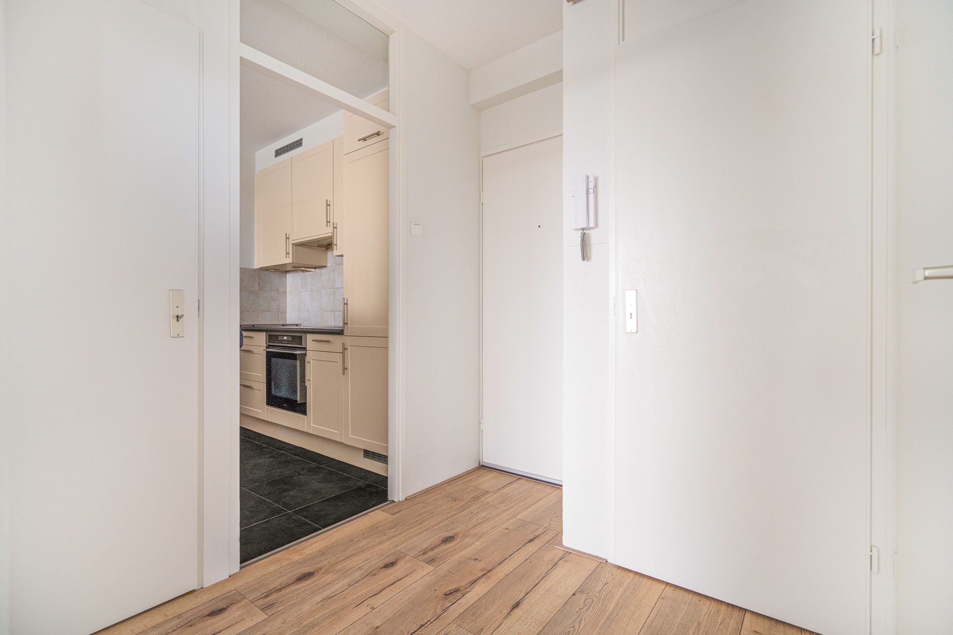 Entreehal met bergkast, meterkast en intercom. De royale woonkamer biedt, net als het balkon, vrij uitzicht op het Oude Dorp. De semi-open keuken heeft een parallelopstelling en is uitgerust met een vaatwasser (2024) ,combimagnetron, koel-/vriescombinatie, elektrische kookplaat en afzuigkap.