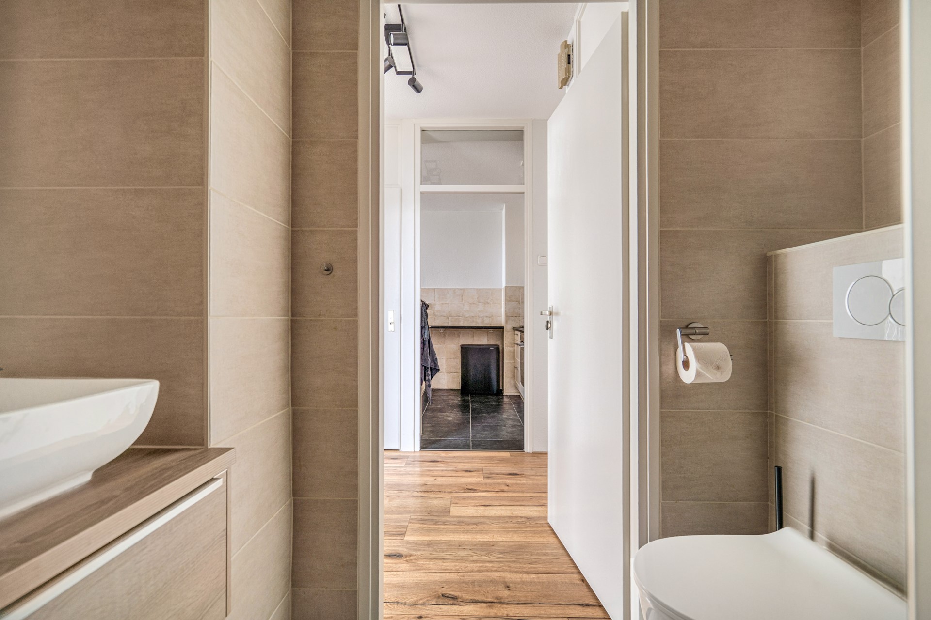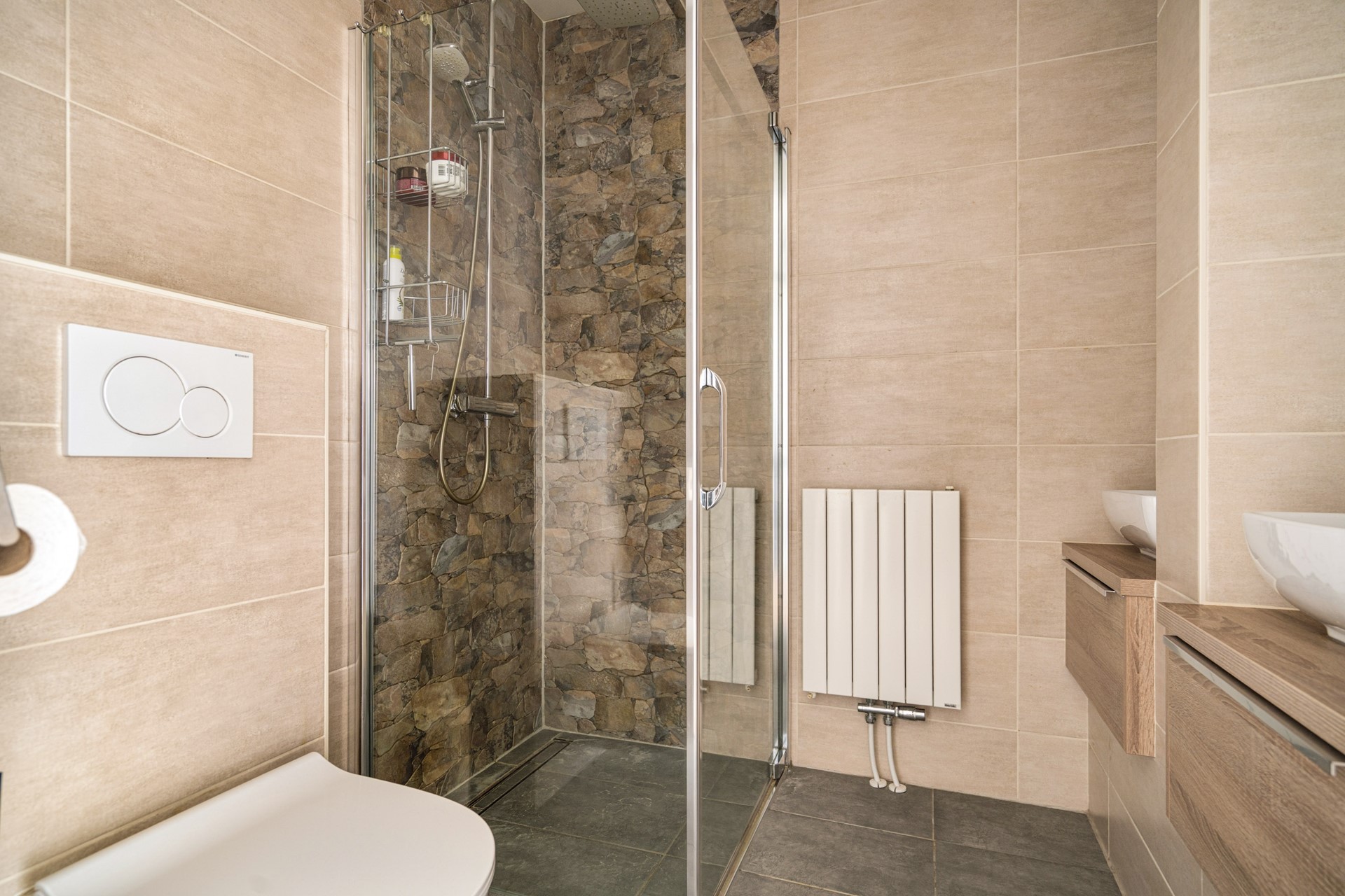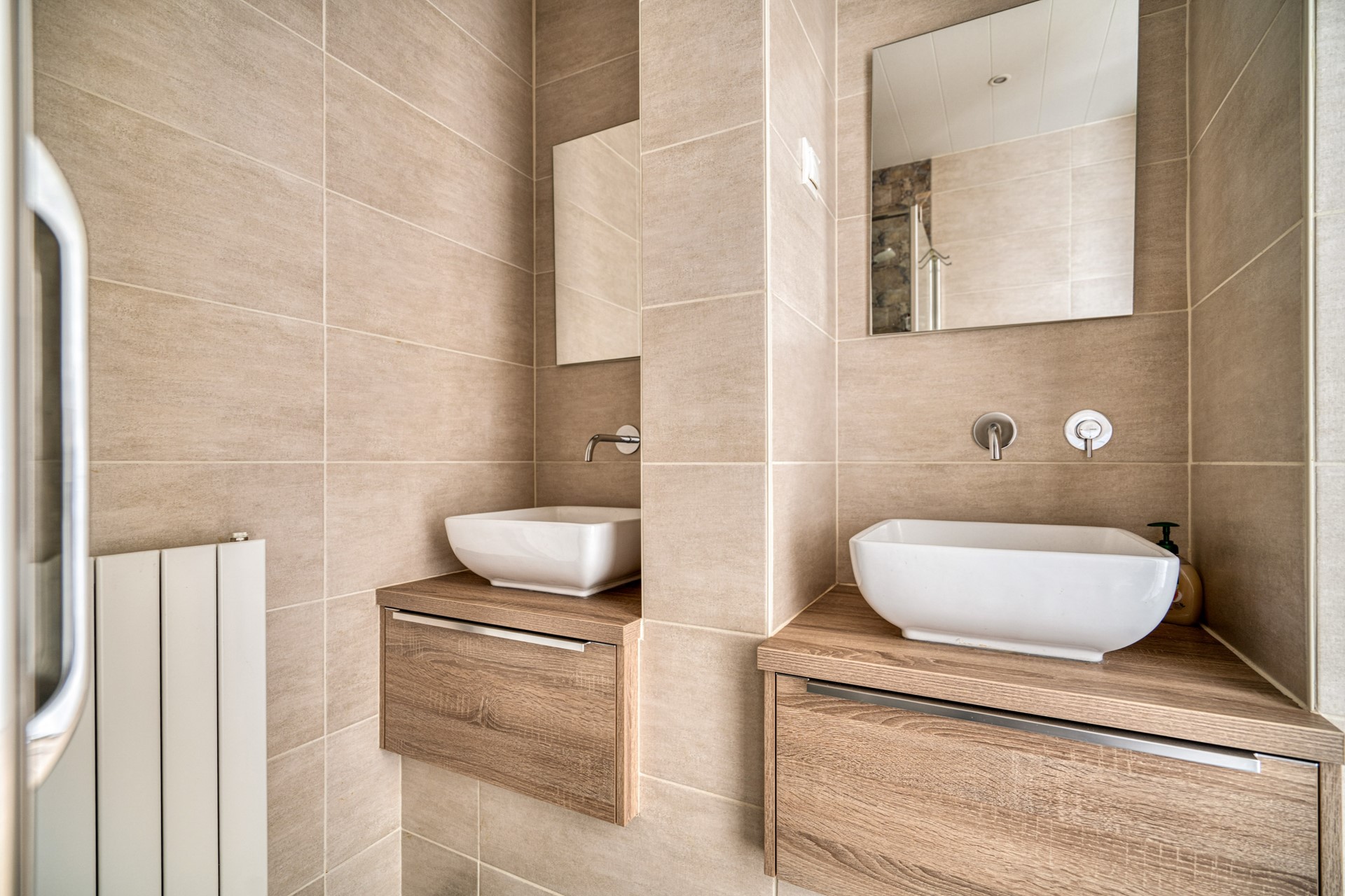 De luxe badkamer welke volledig is betegeld is voorzien van een dubbele wastafel, inloopdouche met drain, radiator, hangend toilet en heeft een verlaagd plafond met inbouwspots.