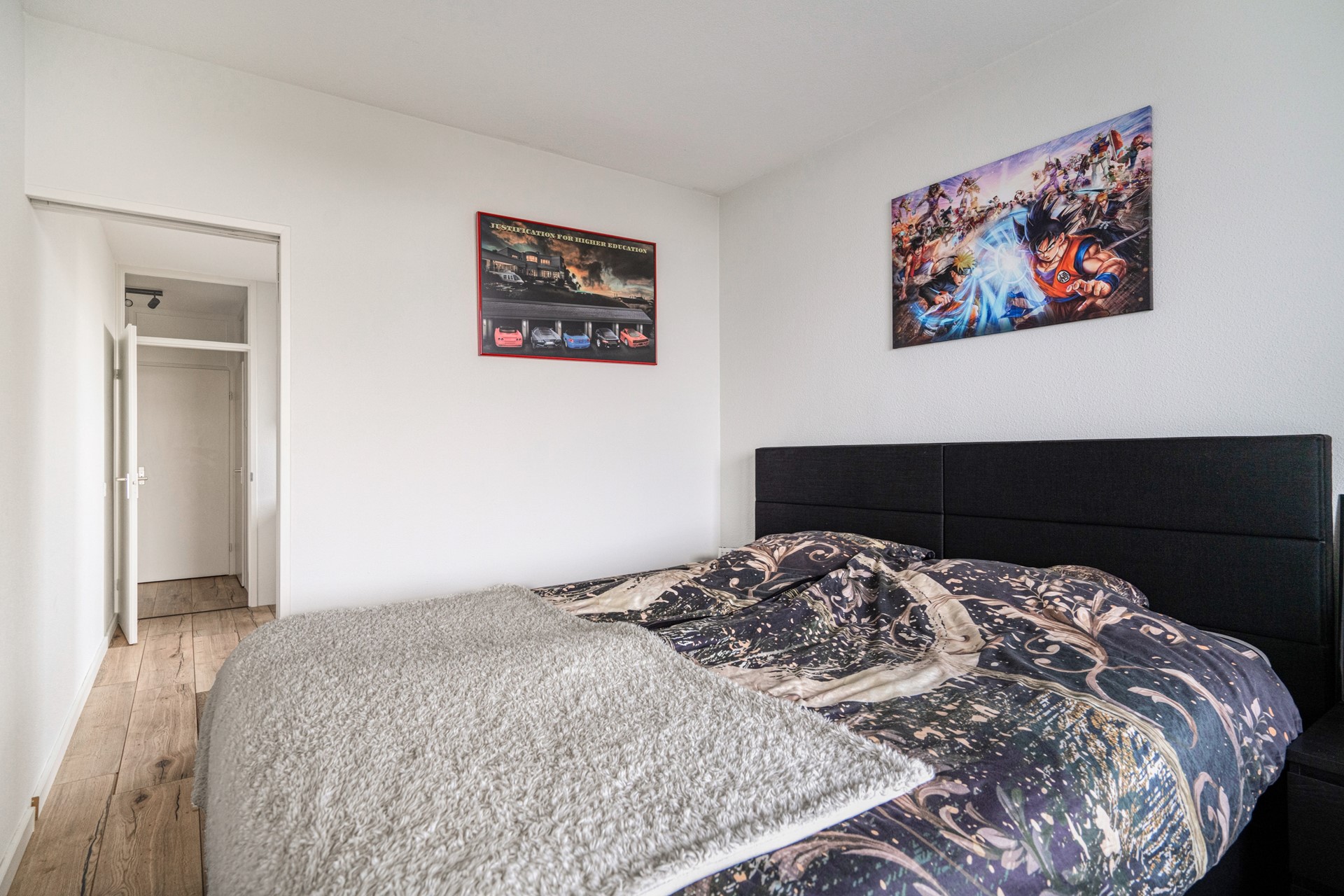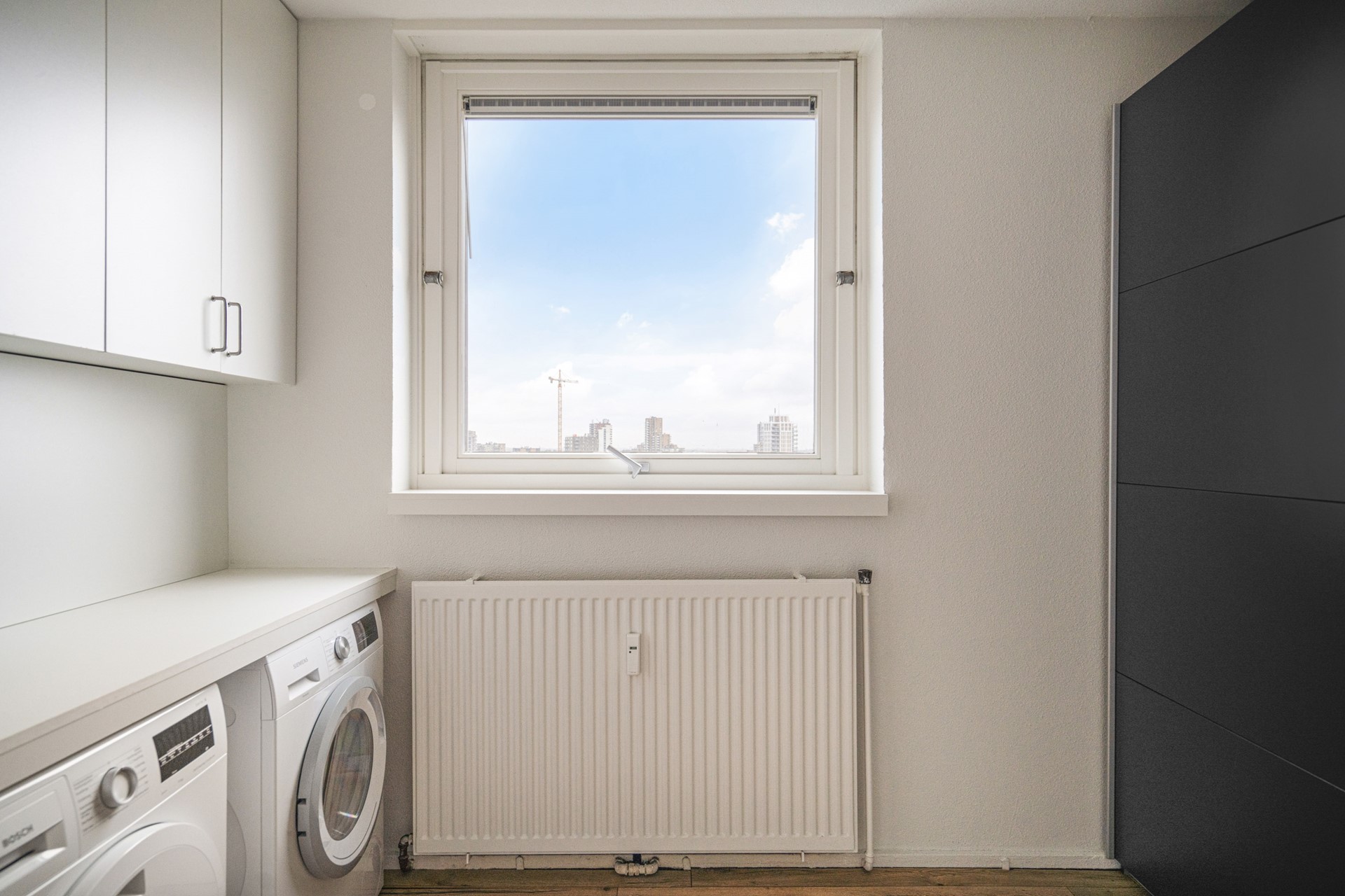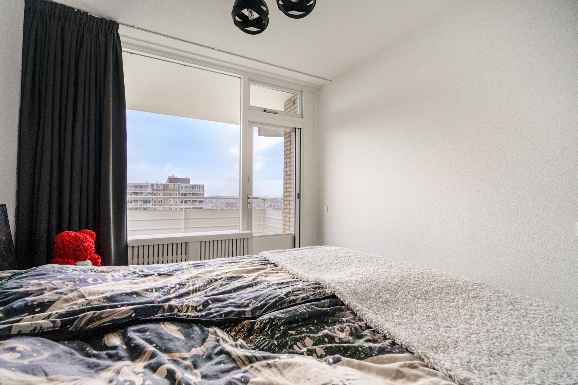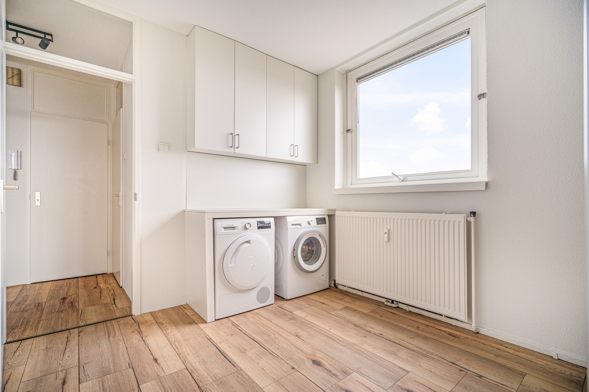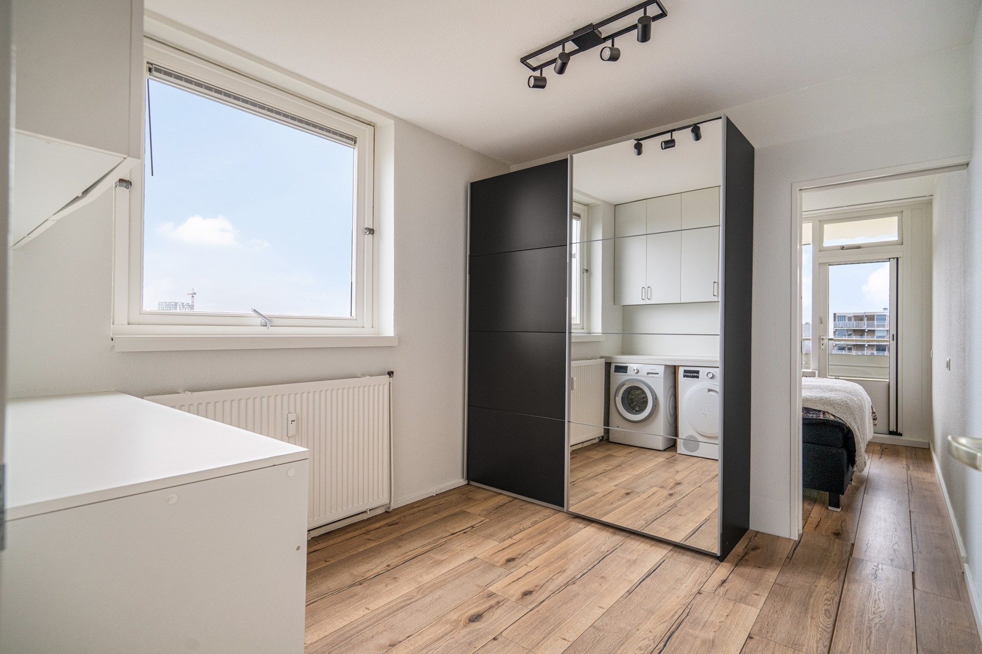 De eerste slaapkamer beschikt over een raam in de zijgevel en een aansluiting voor de wasmachine. Via een schuifdeur bereik je de tweede slaapkamer, die toegang biedt tot het zonnige balkon.