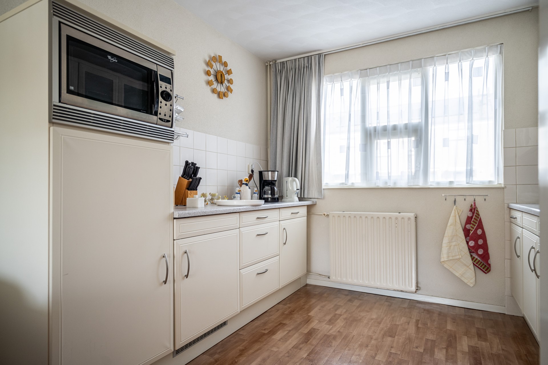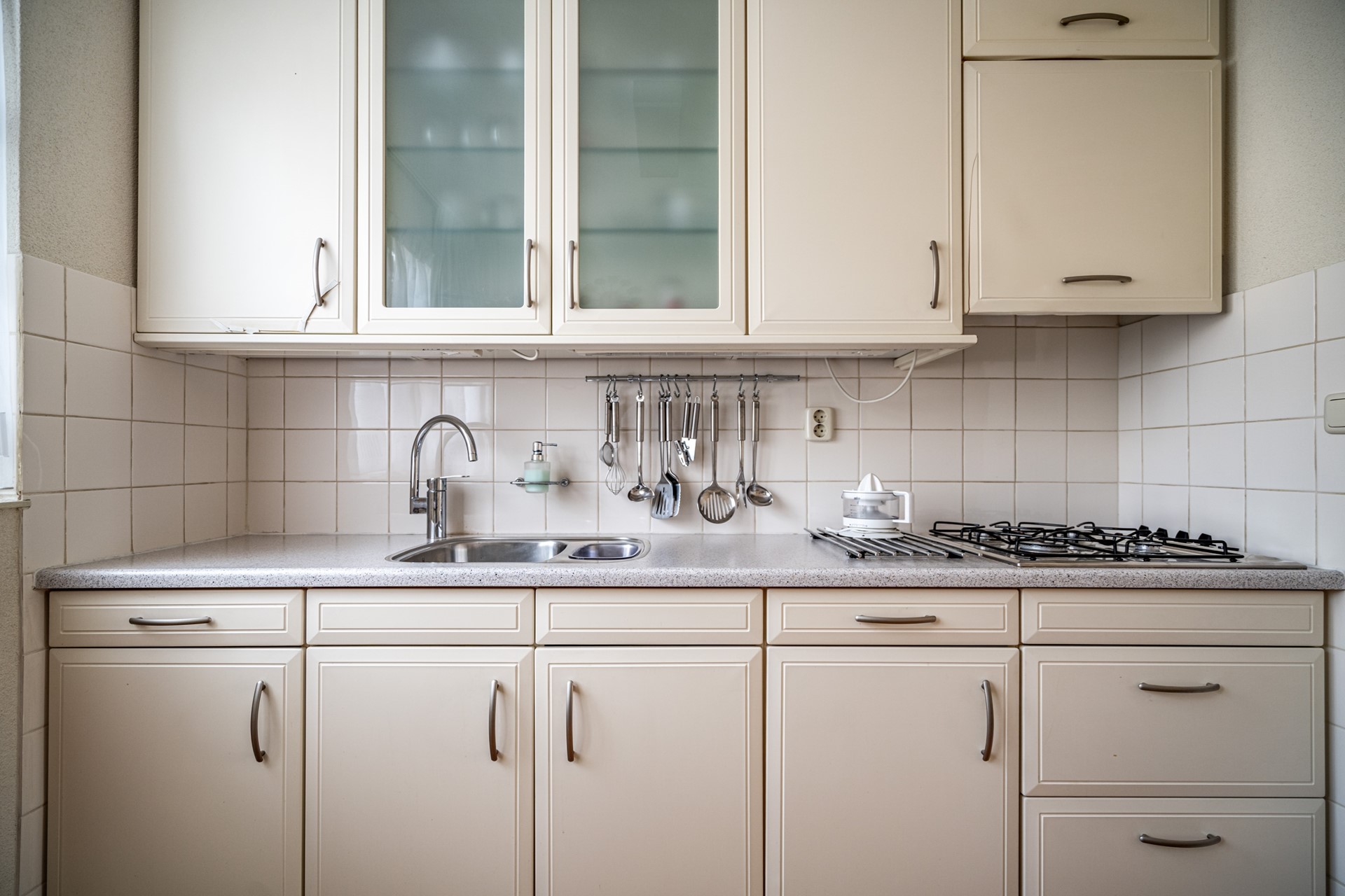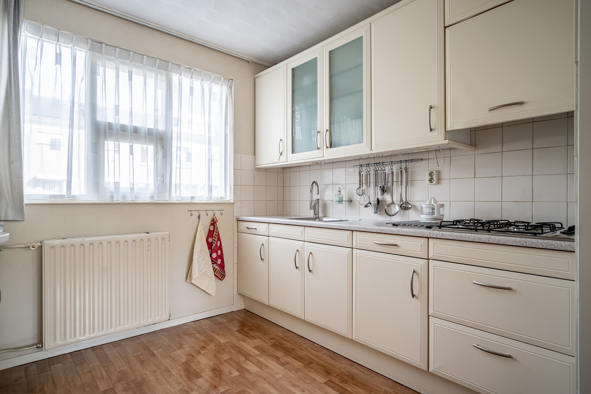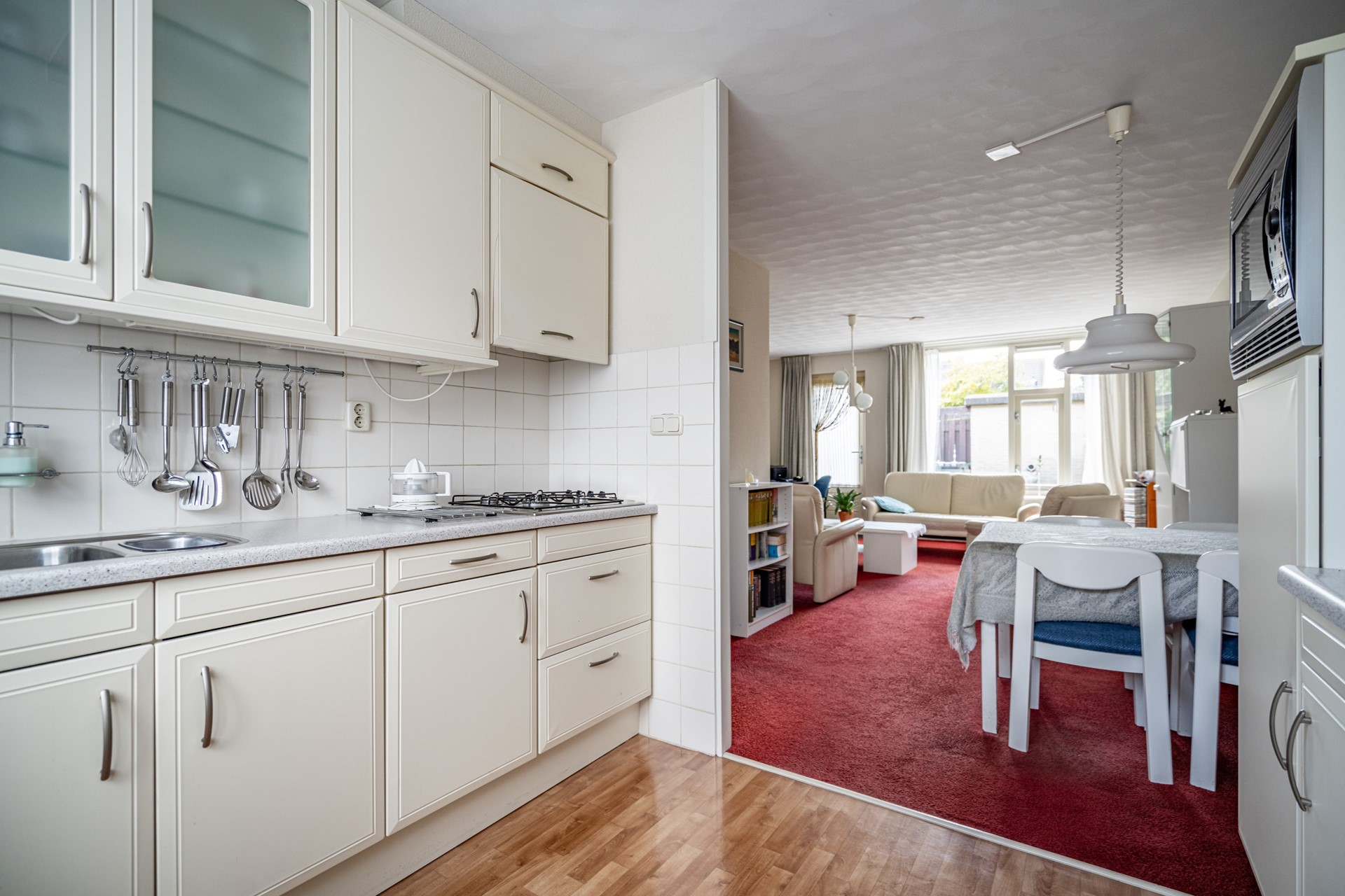 Via de voortuin met eigen parkeerplek stap je binnen in de hal met toilet, meterkast en trapopgang. De ruime woonkeuken aan de voorzijde biedt volop werk- en kastruimte en plek voor een grote eettafel – ideaal voor gezellige diners. De keuken is uitgerust met een gaskookplaat, afzuigkap, oven en koelkast.