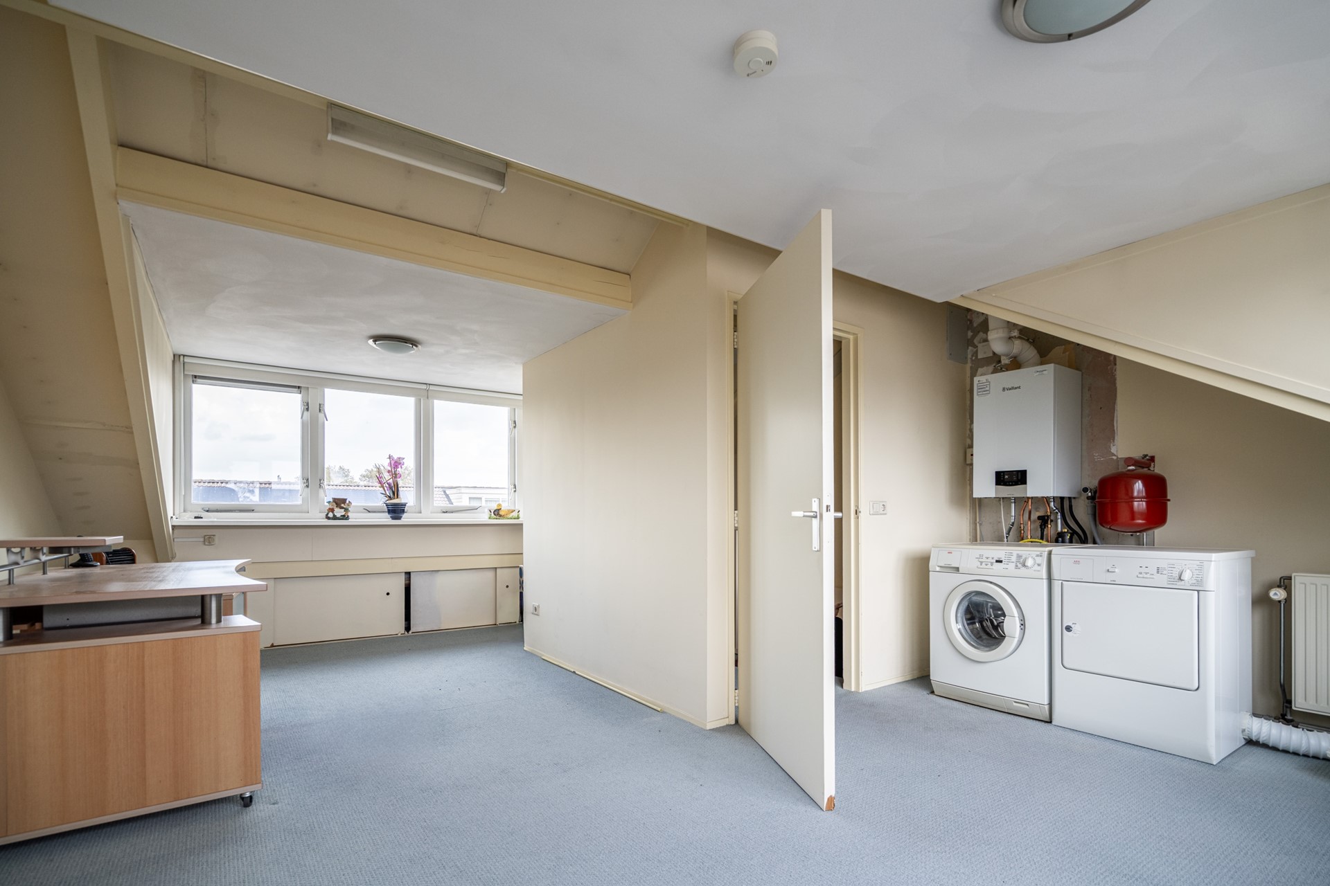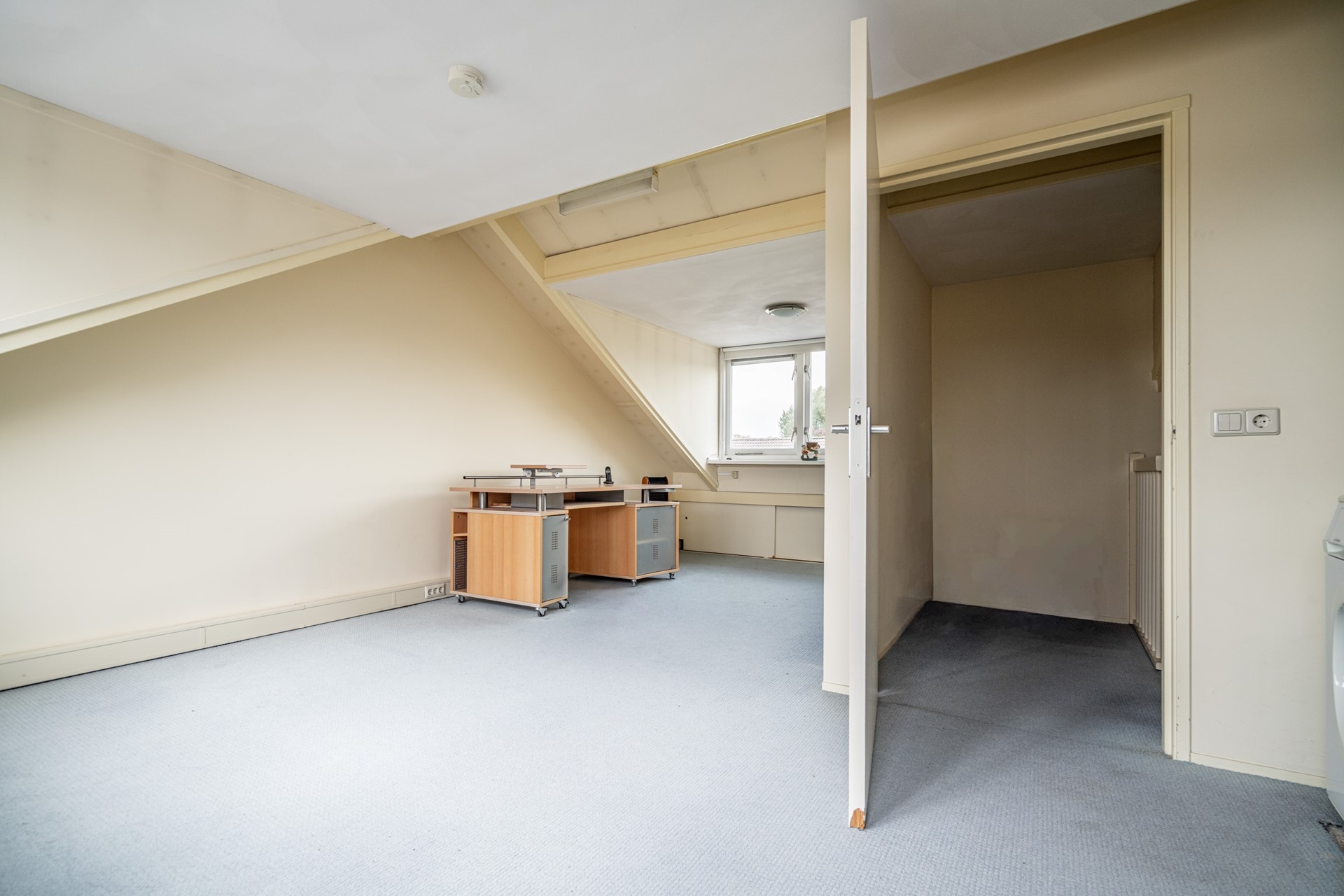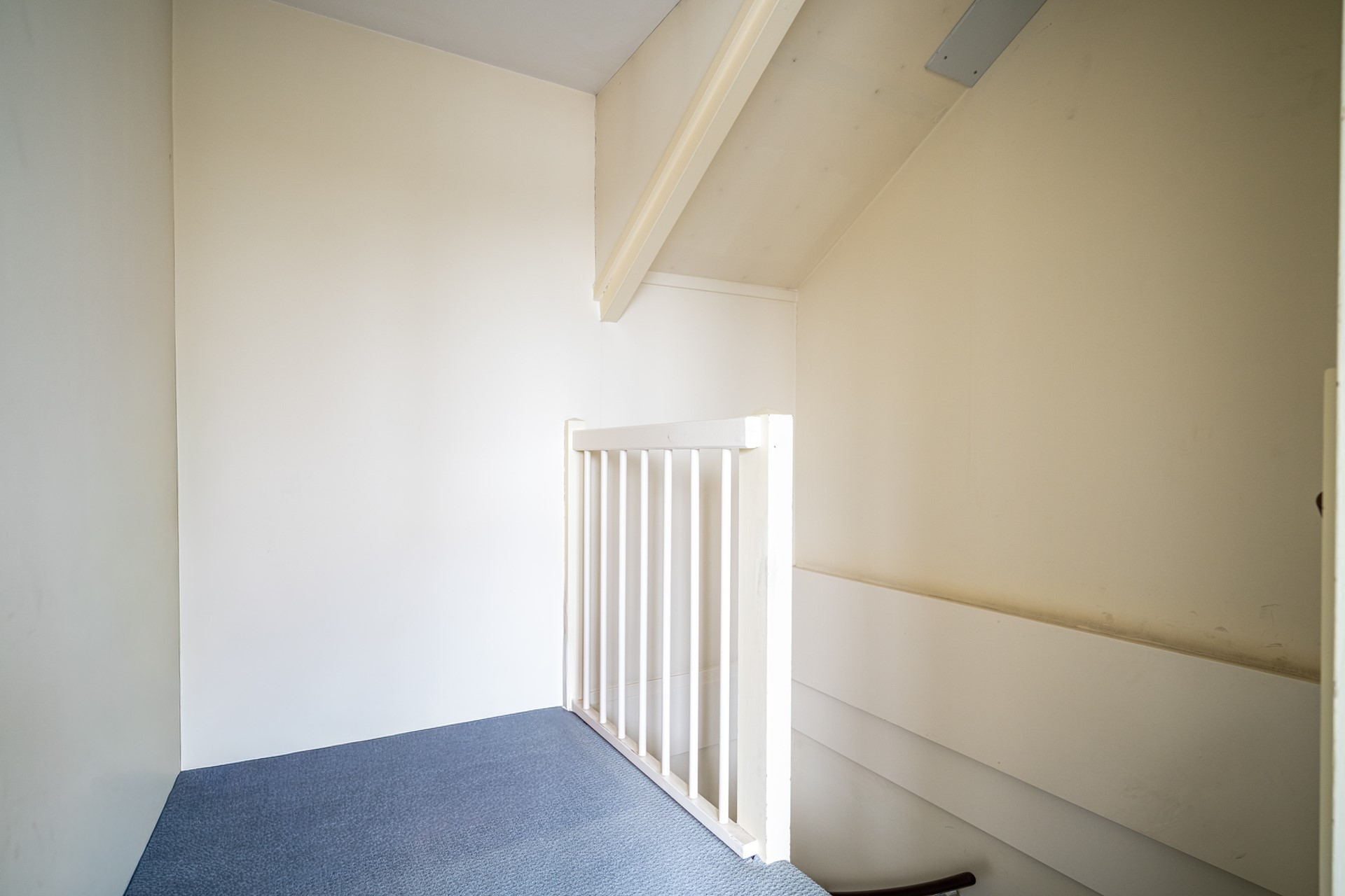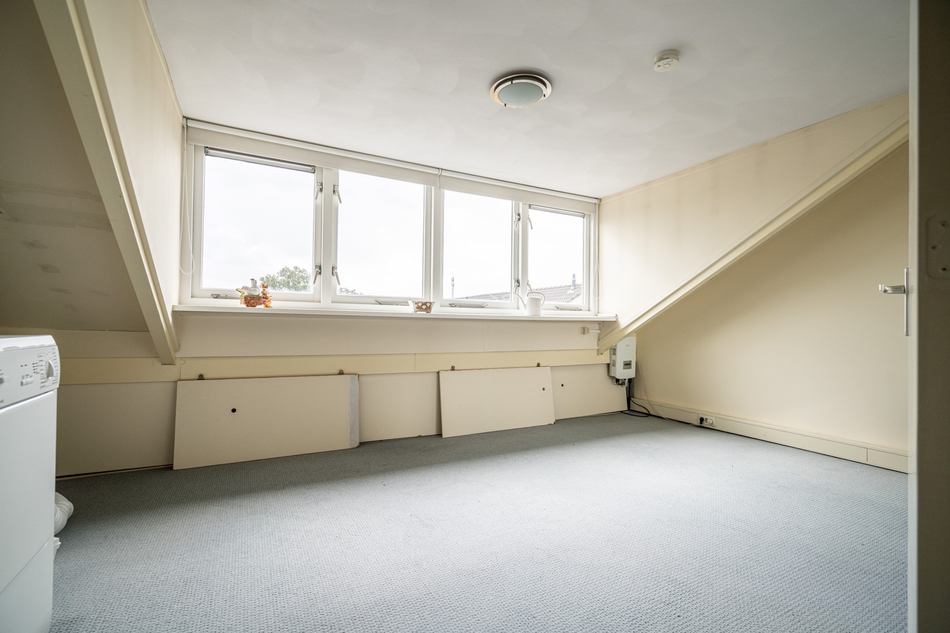 De vierde slaapkamer is heerlijk ruim dankzij het dakkapel en beschikt over veel bergruimte achter de knieschotten. Hier bevinden zich ook de aansluitingen voor de wasmachine/droger en de CV-installatie (2024) met mechanische ventilatie-unit.