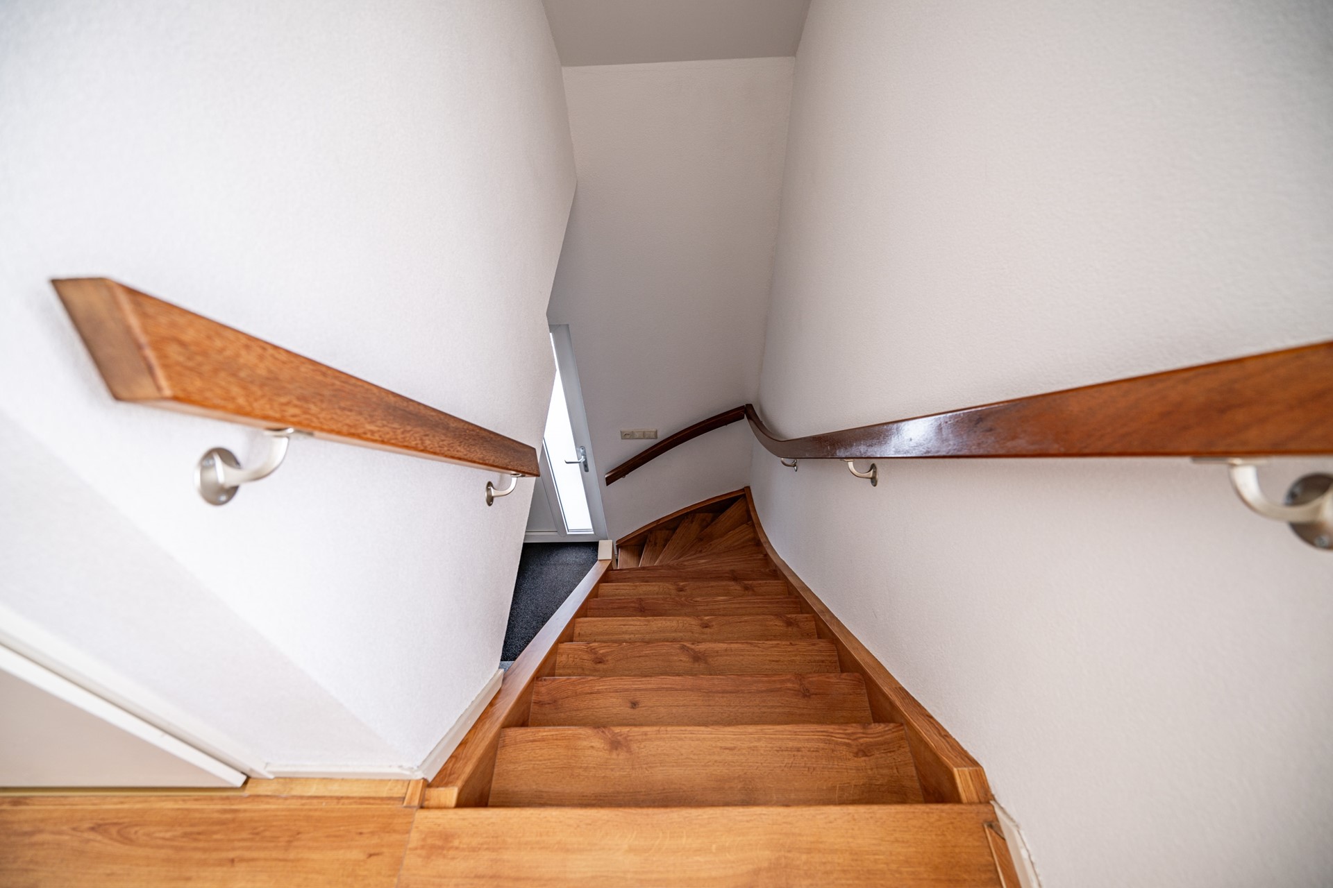 Via de vaste trap bereik je het appartement – alles is hier gelijkvloers. Zodra je binnenstapt, valt de ruimte en het licht direct op.