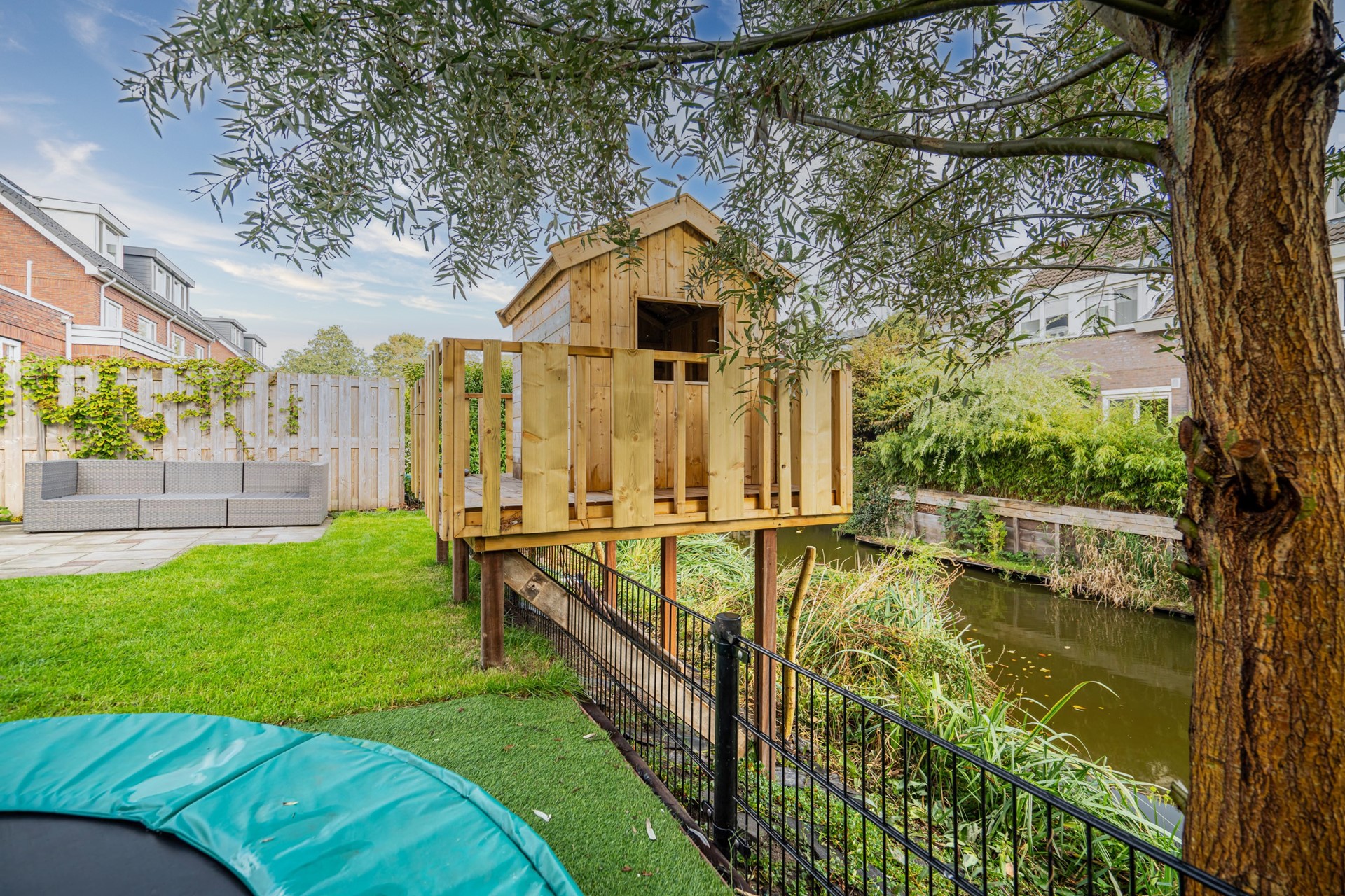 Via het zijpad bereikt u de achtertuin. De achtertuin is op dit moment ingericht voor jonge kinderen met een boomhuis, trampoline en zandbak. De borders en natuurlijke oever zijn voorzien van biologische beplanting, veelal inheems. De achtergevel is voorzien van een groot zonnescherm. Er mag nog een grote een zitkuil(-vlonder) gerealiseerd worden op de natuurlijke oever aan het water.