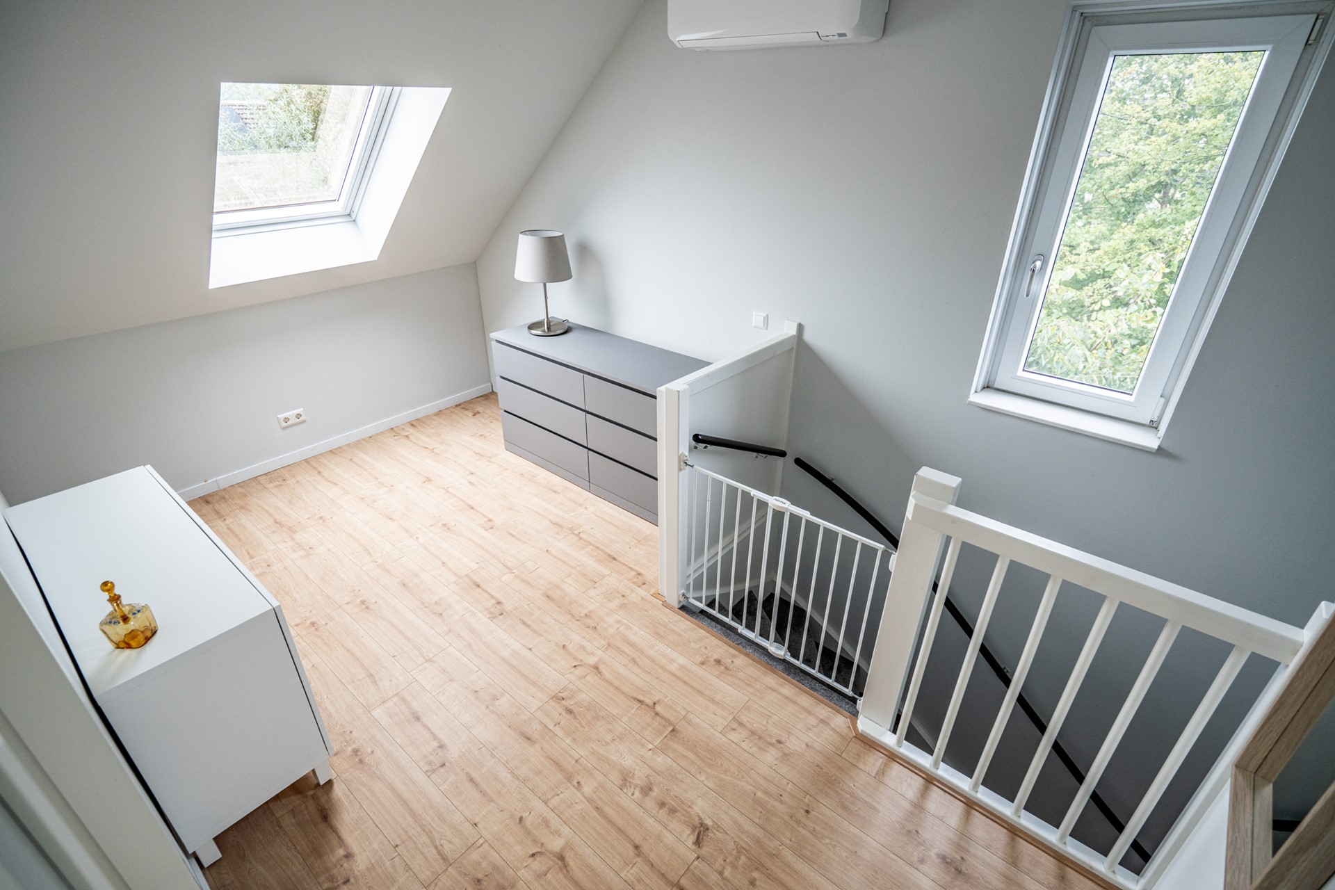 The landing provides access to the utility room. This room houses the installations for the air-to-water heat pump, the mechanical ventilation system, and solar panels. There is also space for a washer/dryer here, and there is room for a cupboard for additional storage. The landing is abundantly natural thanks to the tilt-and-turn window in the gable end. When this window is open, you'll often hear a song thrush in the spring. Woodpeckers are also frequent visitors here.
