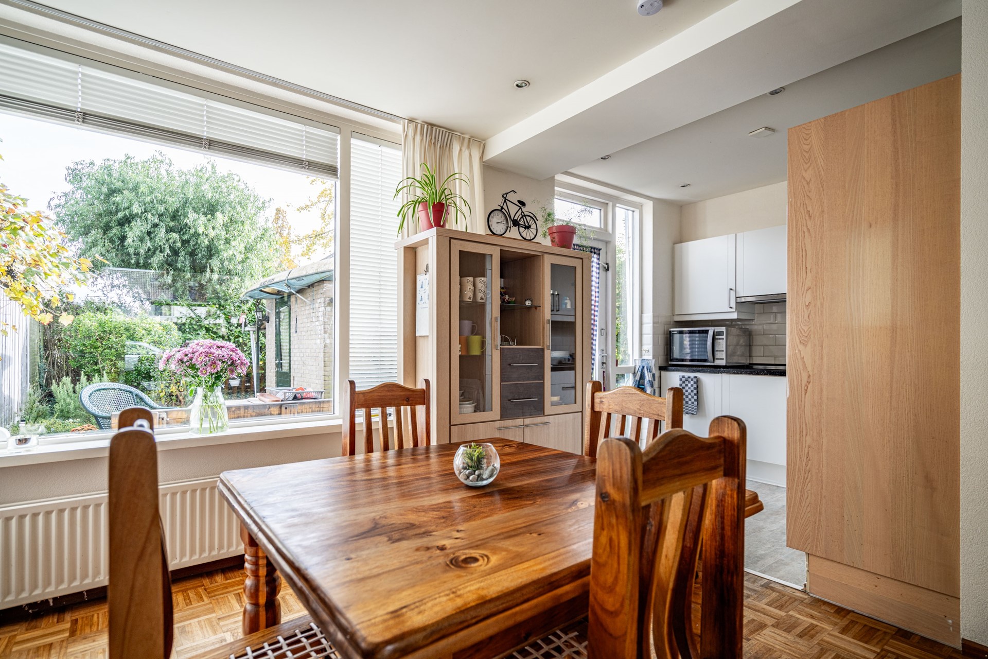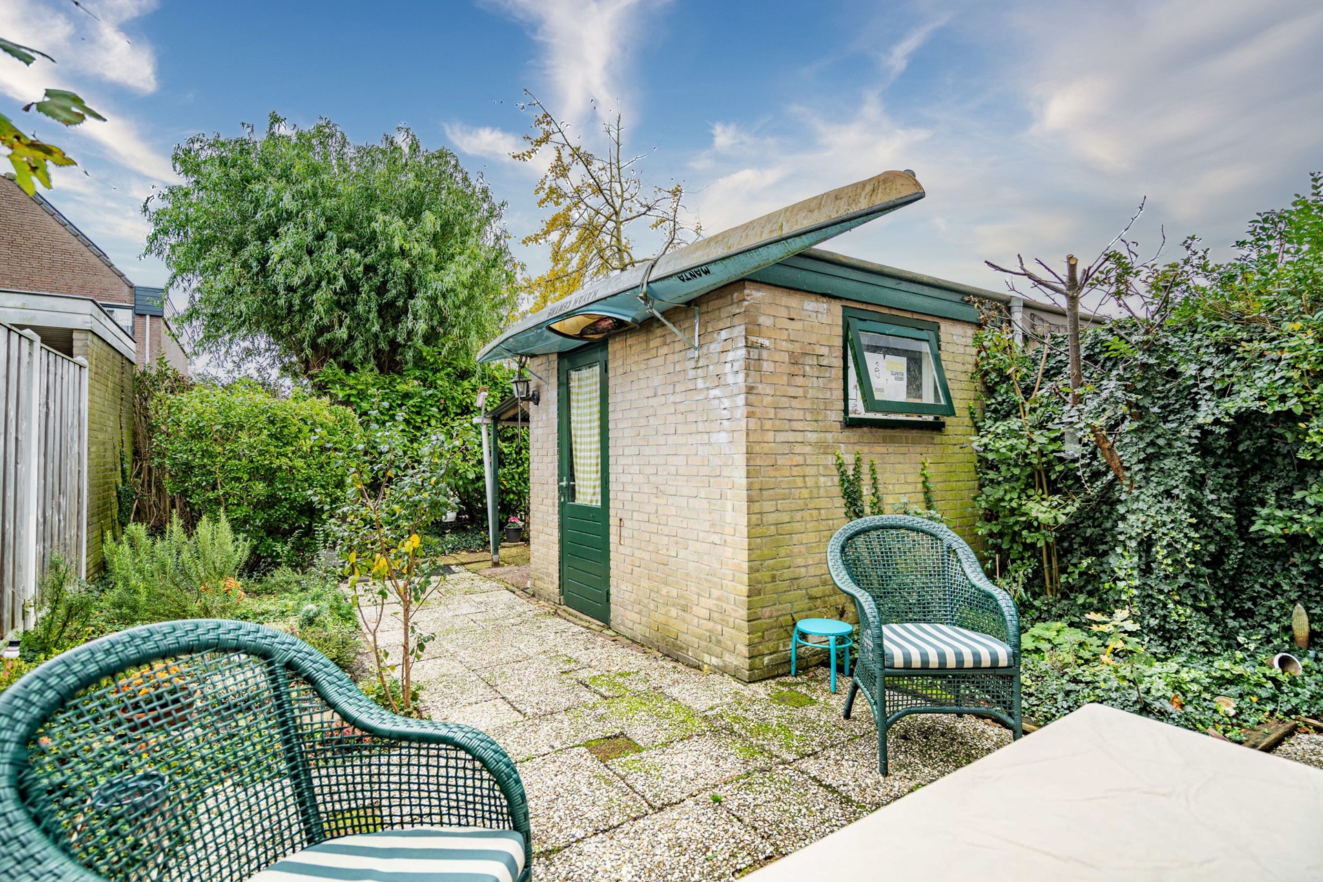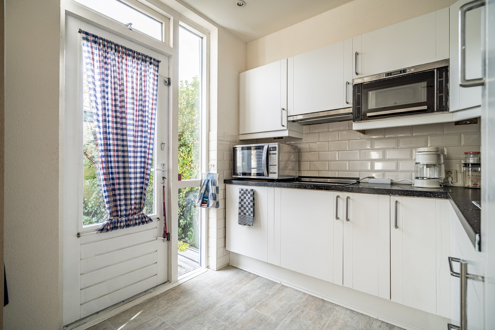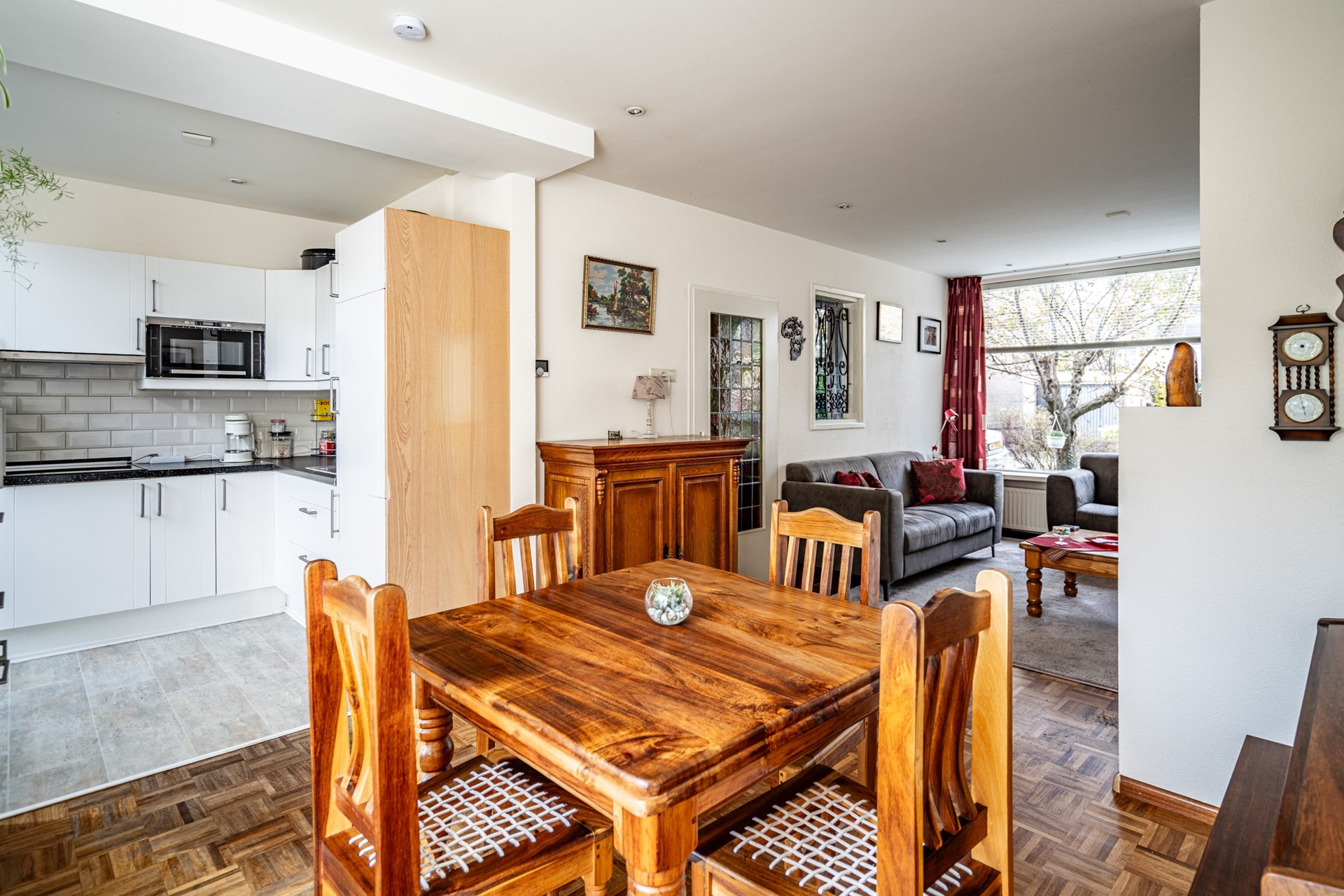 Aan de achterzijde ligt de open keuken, voorzien van diverse inbouwapparatuur zoals een vaatwasser, keramische kookplaat, koel-vriescombinatie en afzuigkap. Vanuit hier loop je zo de zonnige achtertuin in: een diepe, veelzijdige buitenruimte waar je dankzij de goede ligging altijd wel een plek in de zon of schaduw vindt. Met een achterom en berging is het bovendien praktisch ingericht. De tuin biedt volop mogelijkheden om geheel naar eigen wens opnieuw in te richten of zelfs uit te bouwen.